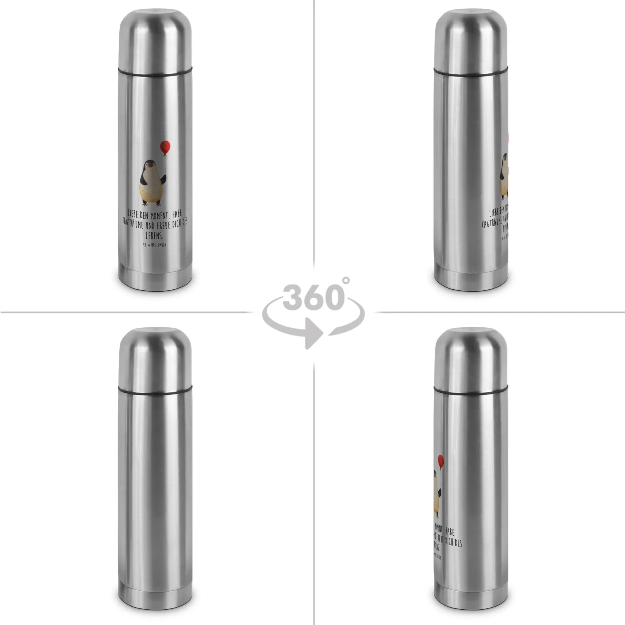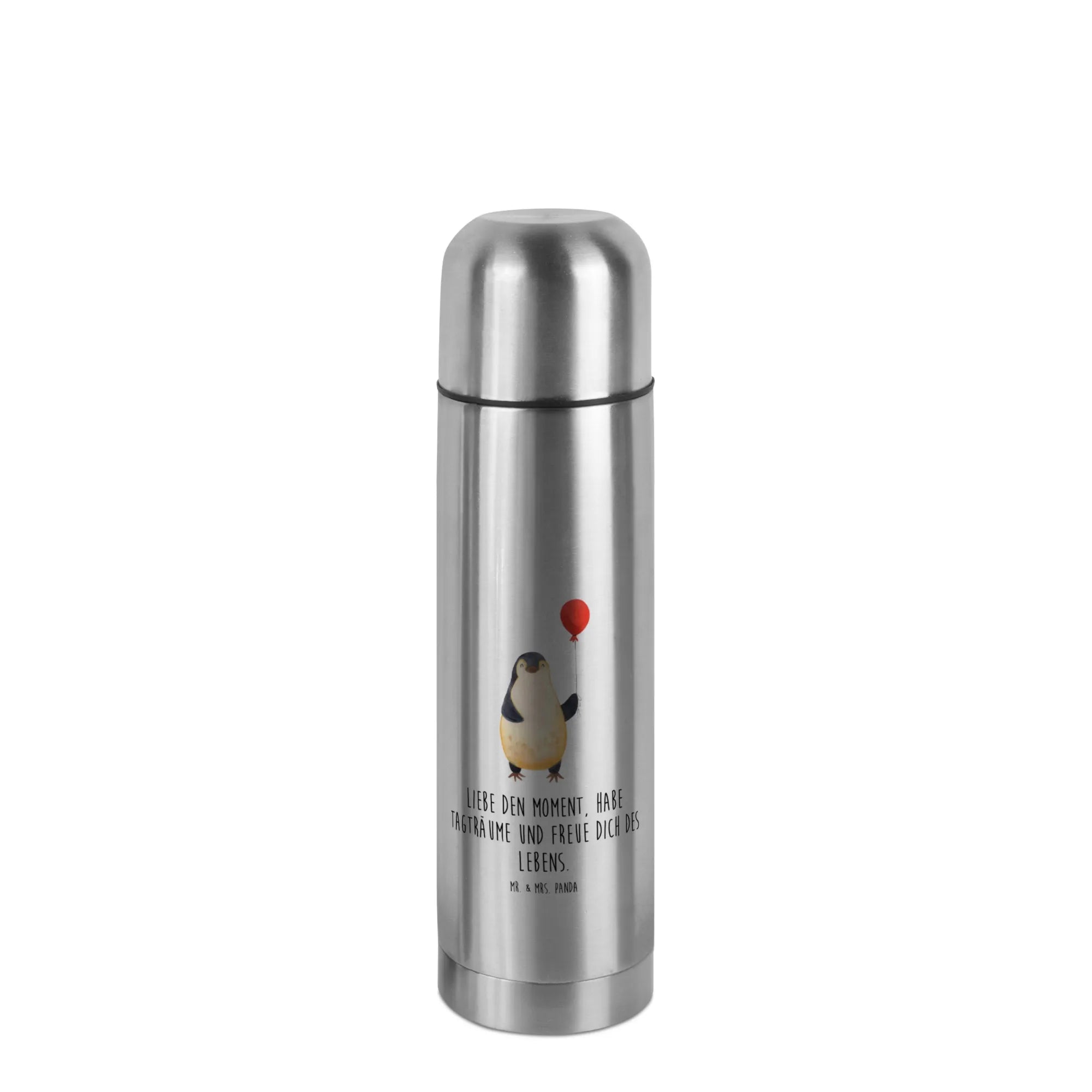 Mr. & Mrs. Panda Thermoskanne „Pinguin Luftballon“ – ein fröhlicher Begleiter für jeden Tag. Der handgezeichnete Pinguin mit seinem Luftballon und dem liebevollen Spruch „Liebe den Moment, habe Tagträume und freue dich des Lebens.“ erinnert dich bei jedem Schluck daran, das Leben zu feiern. 🐧🎈