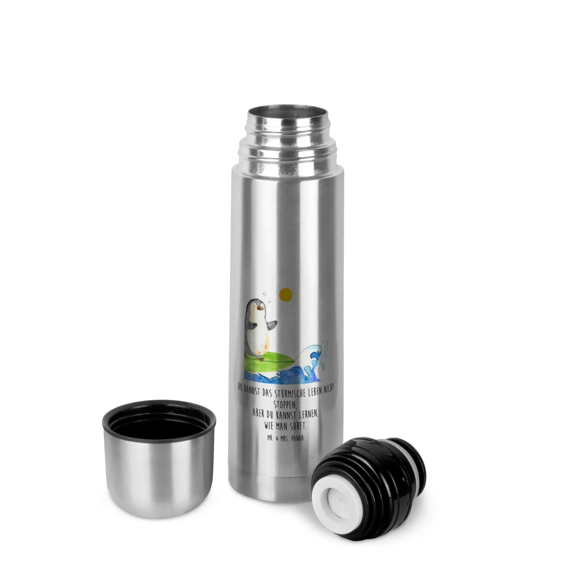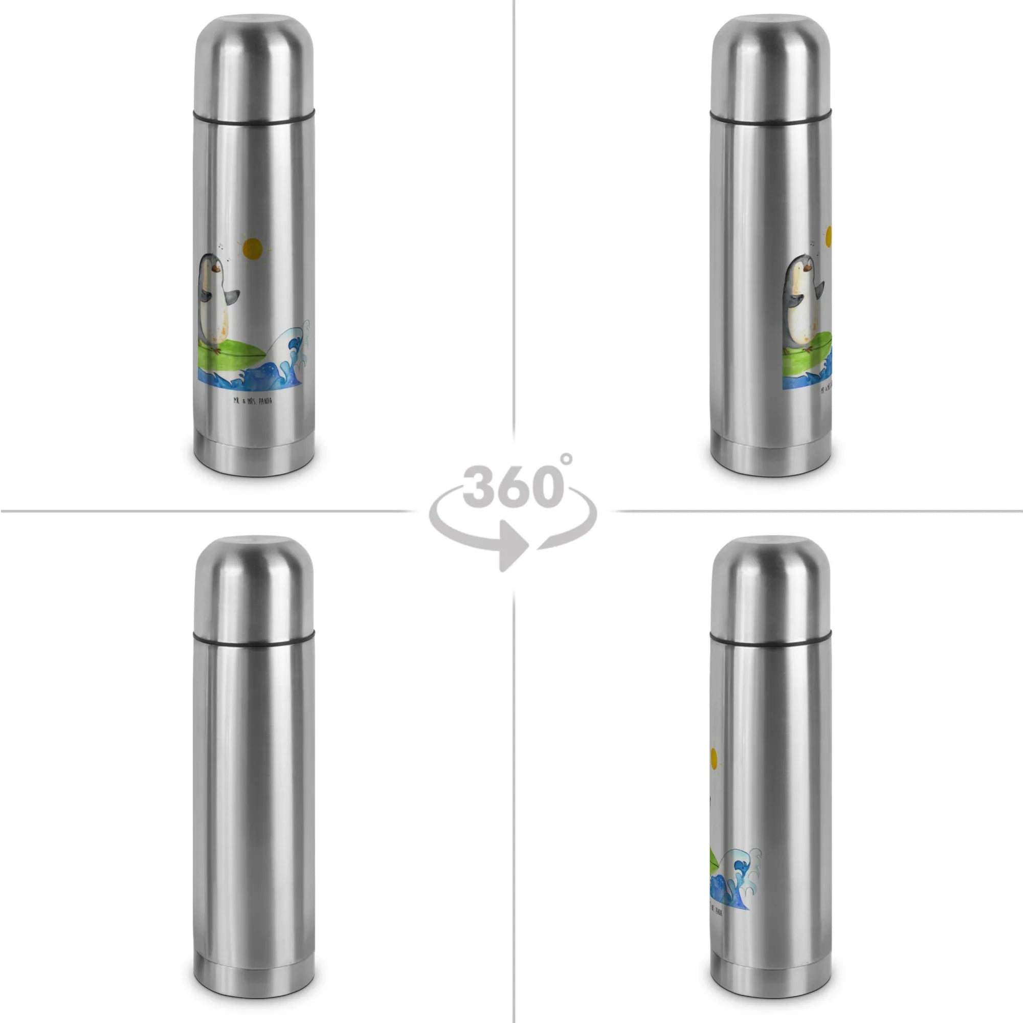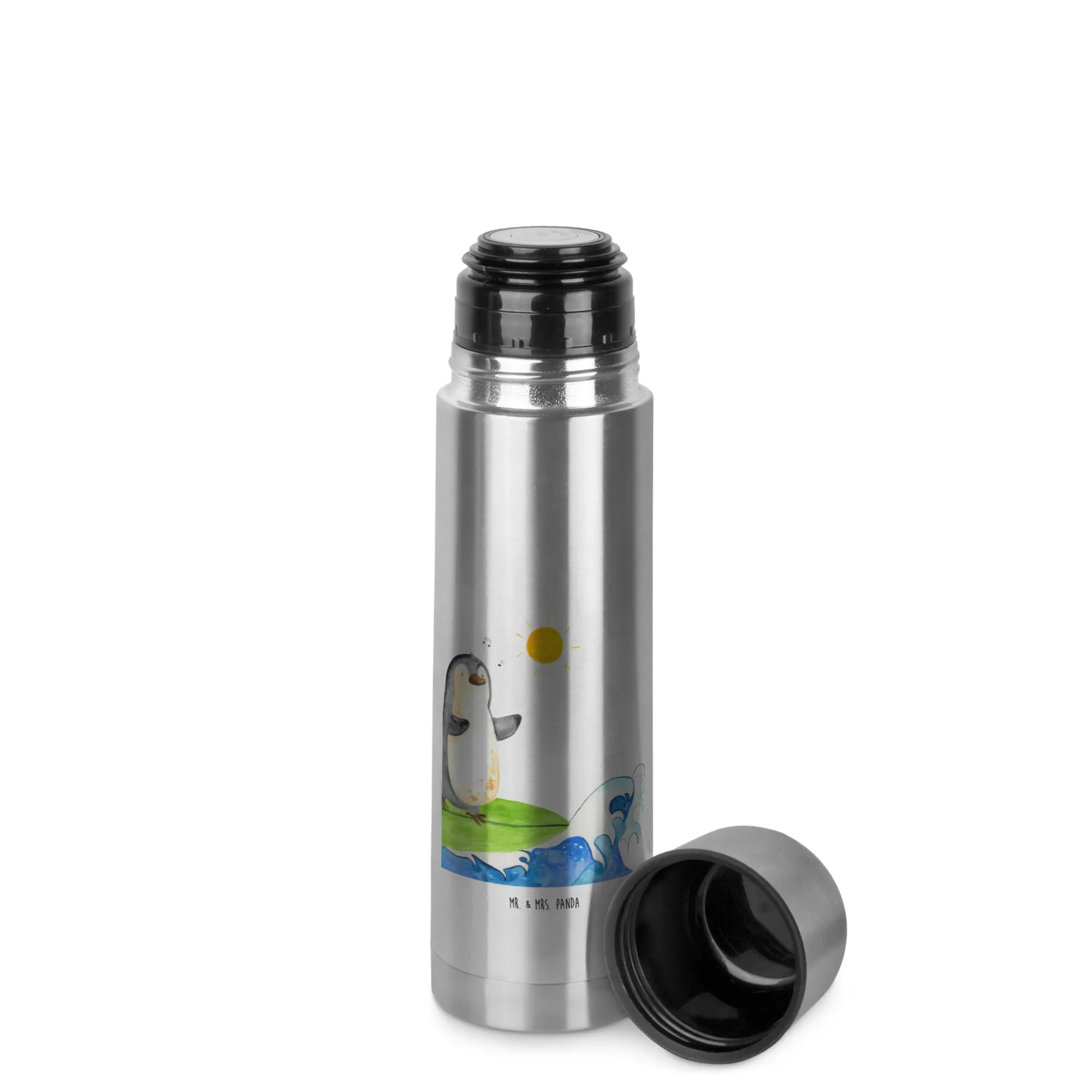 Die wunderschöne Thermoskanne mit dem Motiv des Pinguin Surfers von Mr. & Mrs. Panda ist das perfekte Geschenk für alle, die das Meer und das Surfen lieben!