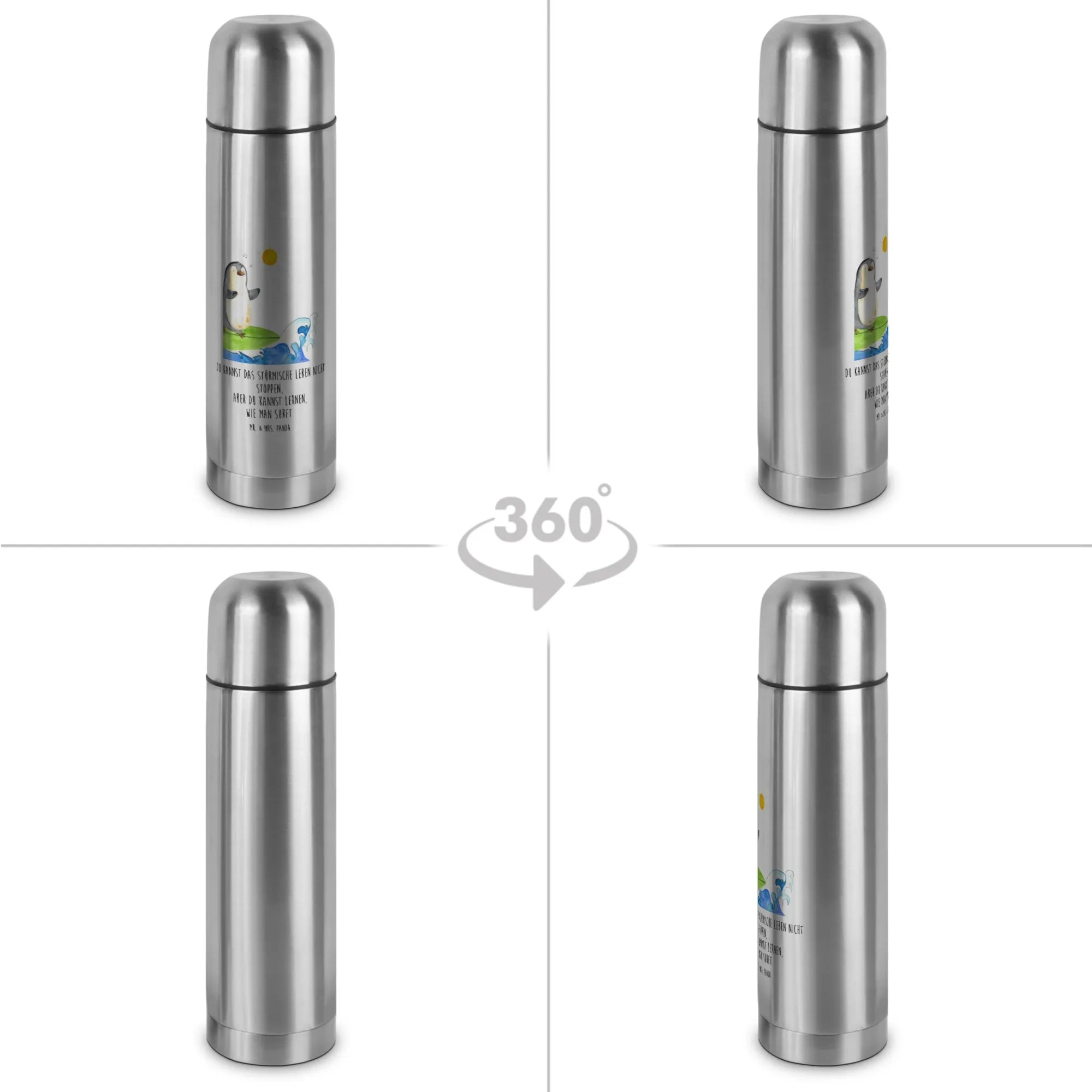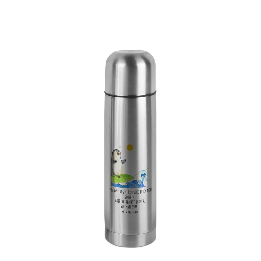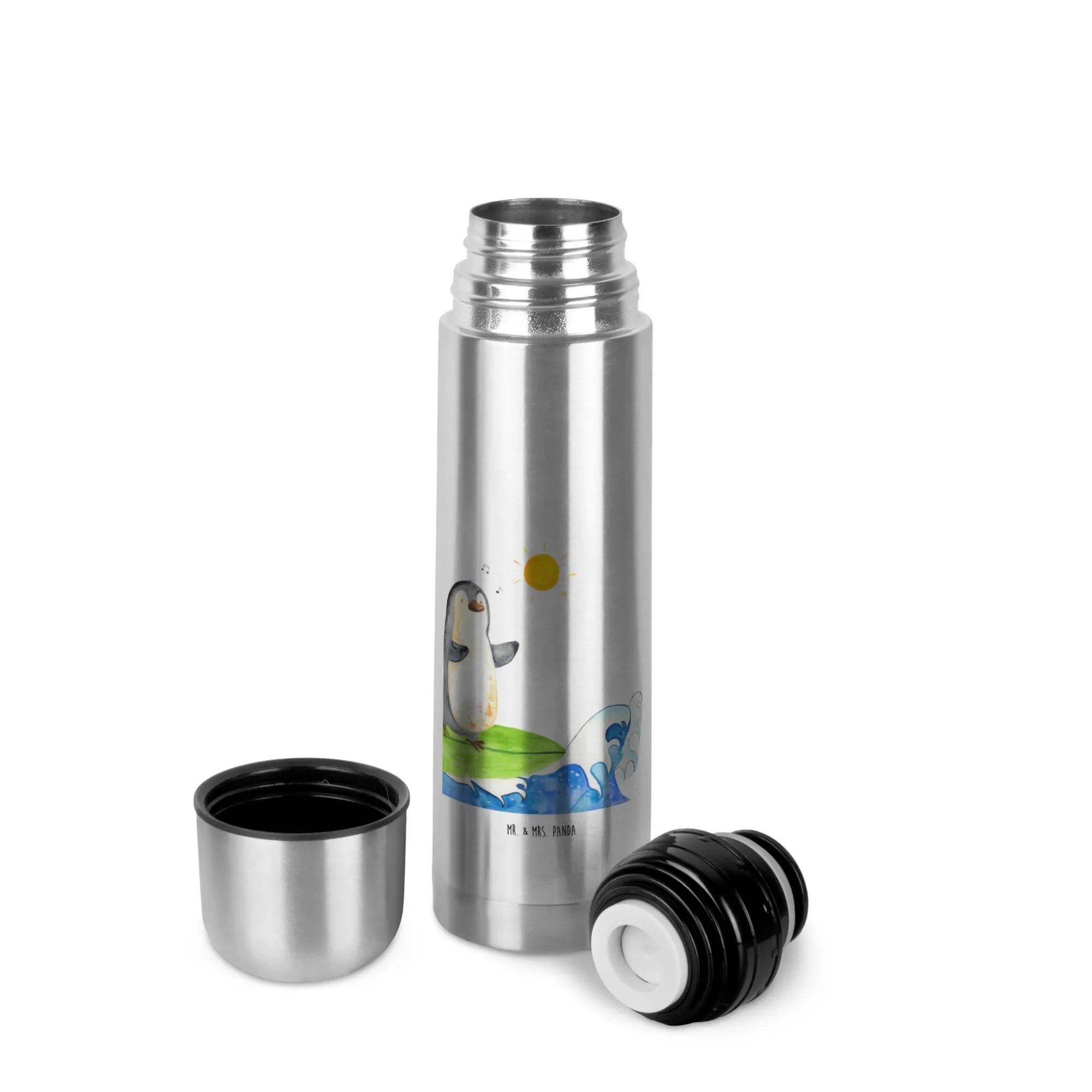 Die wunderschöne Thermoskanne mit dem Motiv des Pinguin Surfers von Mr. & Mrs. Panda ist das perfekte Geschenk für alle, die das Meer und das Surfen lieben!
