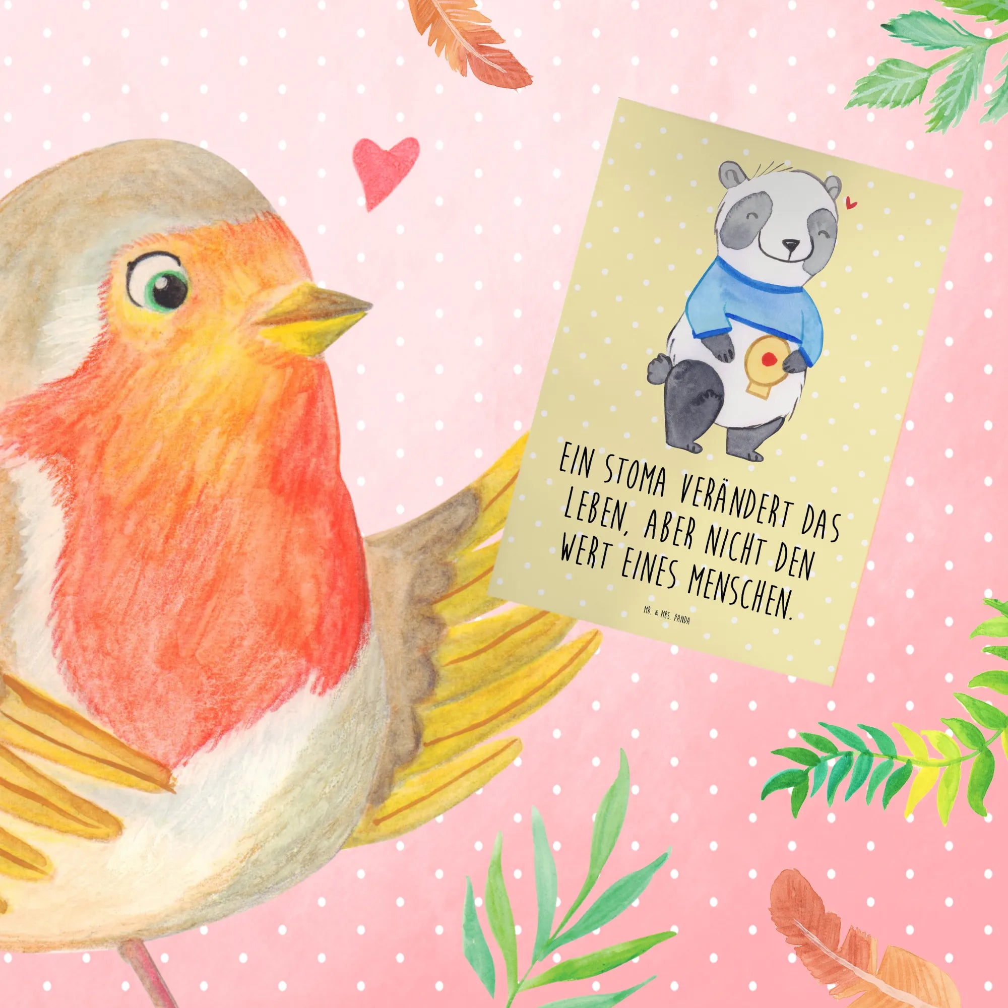 Der liebevolle Panda zeigt, dass ein Stoma das Leben verändert, aber nicht den Wert eines Menschen mindert. Die Vorderseite der Karte ist mit dem motivierenden Spruch "Ein Stoma verändert das Leben, aber nicht den Wert eines Menschen" bedruckt und bietet gleichzeitig Platz auf der blanko Innenseite für deine persönlichen Worte.