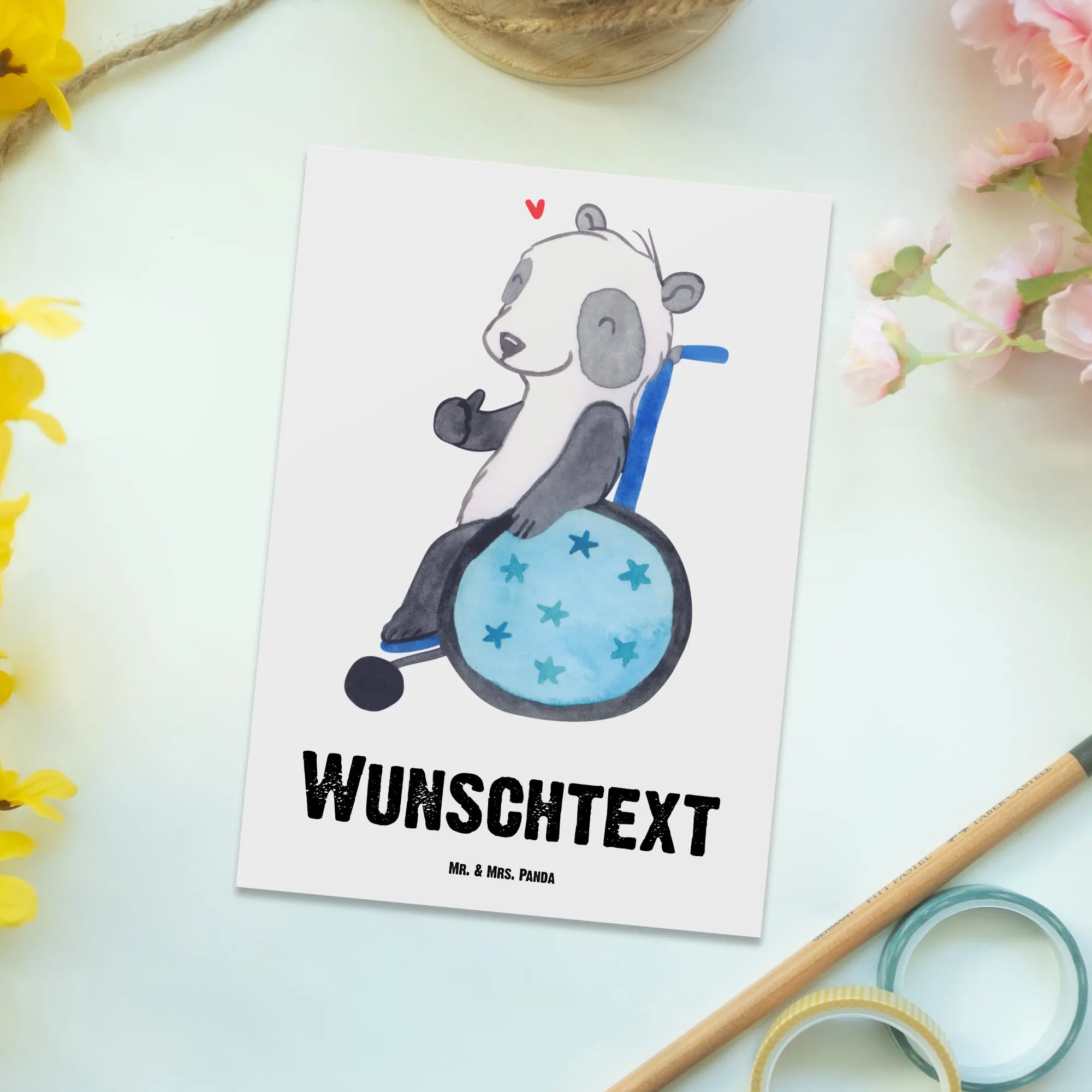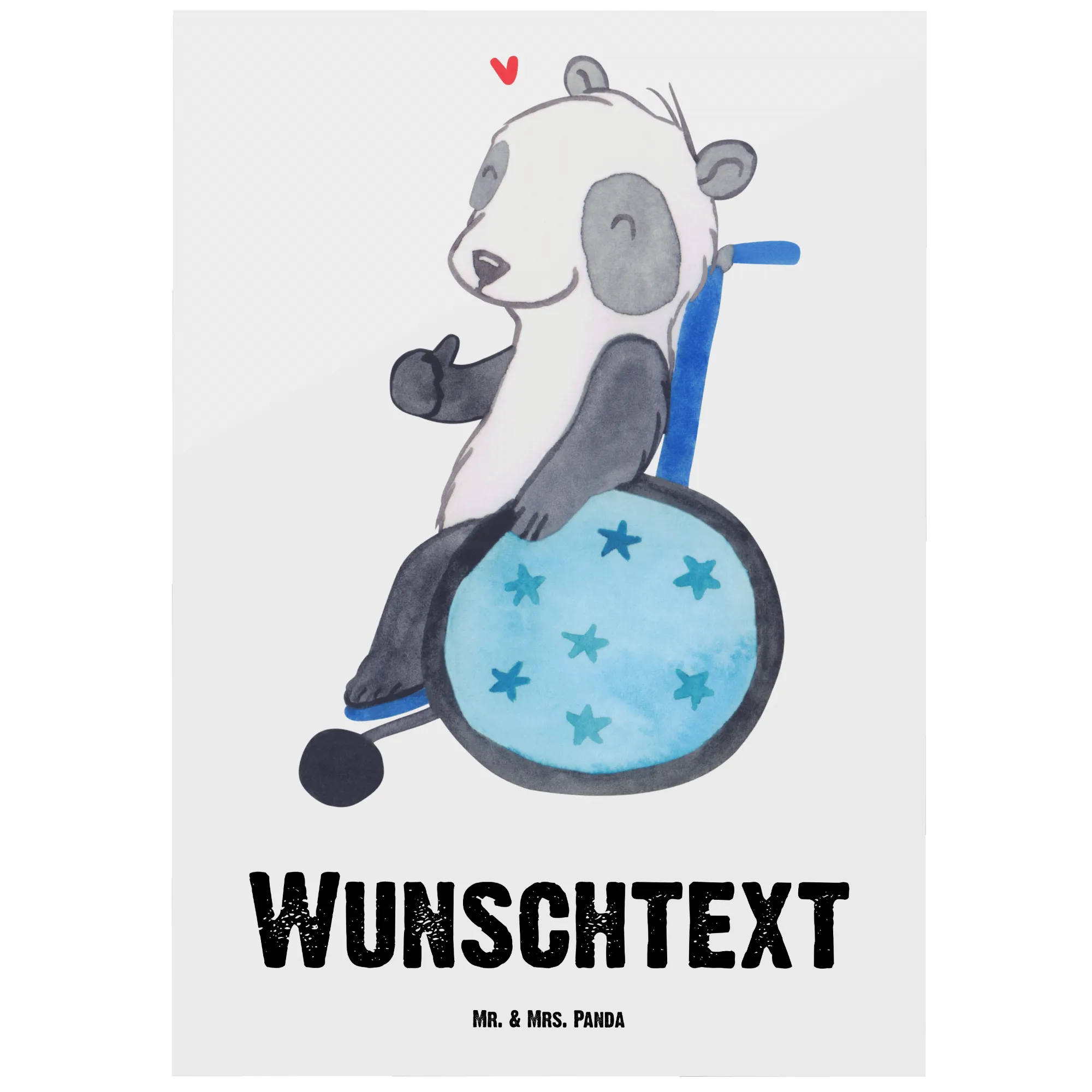Personalisierte Postkarte „Panda Rollstuhl“ – eine stille, respektvolle Botschaft aus der Kollektion Tiere mit Superkräften. Der liebevoll gezeichnete Panda im Rollstuhl streckt den Daumen nach oben und trägt den Satz: „Grenzen existieren nur im Kopf. Nichts hält mich auf meinem Weg auf.“ Diese Postkarte verbindet Zuversicht und Anerkennung ohne Beschönigung.