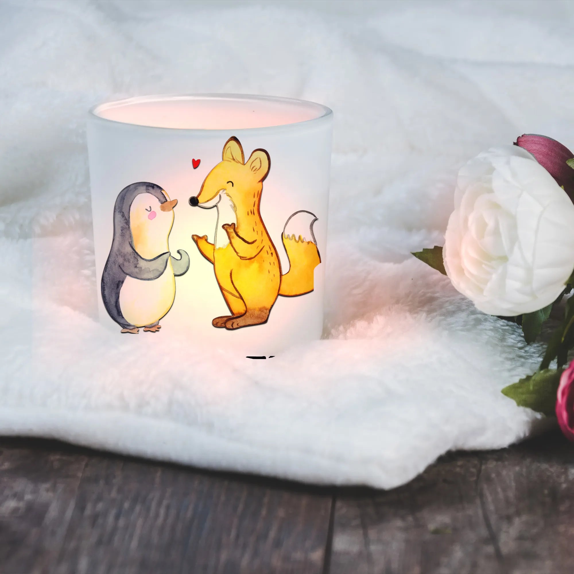 Entdecke das wundervolle personalisierte Windlicht Fuchs & Pinguin gehörlos aus der speziellen Kollektion Tiere mit Superkräften von Mr. & Mrs. Panda. Dieses zauberhafte Windlicht aus satiniertem Glas bringt nicht nur Wärme in dein Zuhause, sondern vermittelt auch eine wichtige Botschaft der Inklusion und des Respekts.