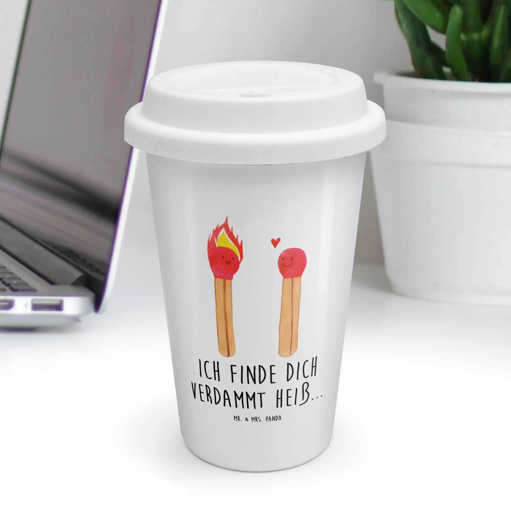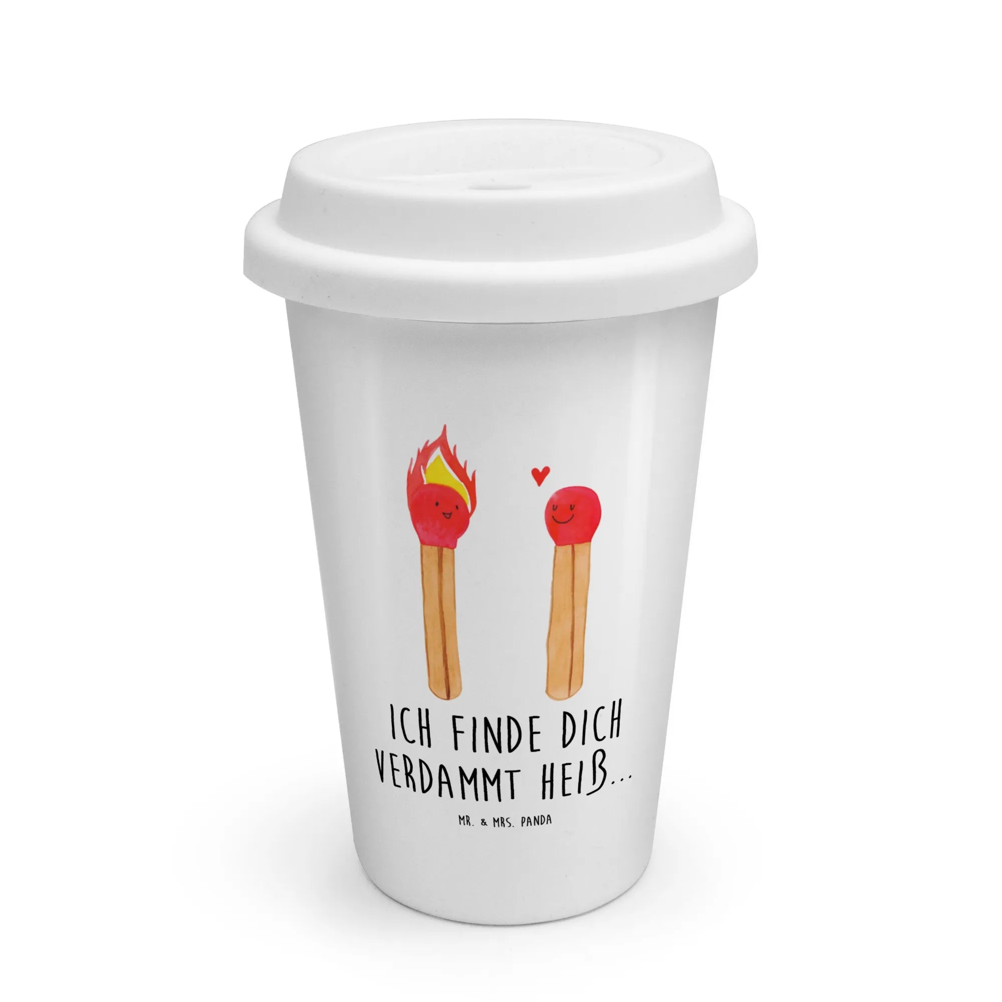 Mr. & Mrs. Panda To Go Becher „Streichhölzer“ – der perfekte Begleiter für Verliebte und Liebhaber von heißem Kaffee mit Herz. Dieses süße Motiv zeigt zwei fröhliche Streichhölzer, verbunden durch ein kleines Herz, und den frechen Slogan „Ich finde dich verdammt heiß...“. Ein zauberhaftes Geschenk für Freundin, Freund, Ehefrau oder Ehemann – ideal zum Valentinstag, Jahrestag oder als Liebesüberraschung für unterwegs. ☕❤️