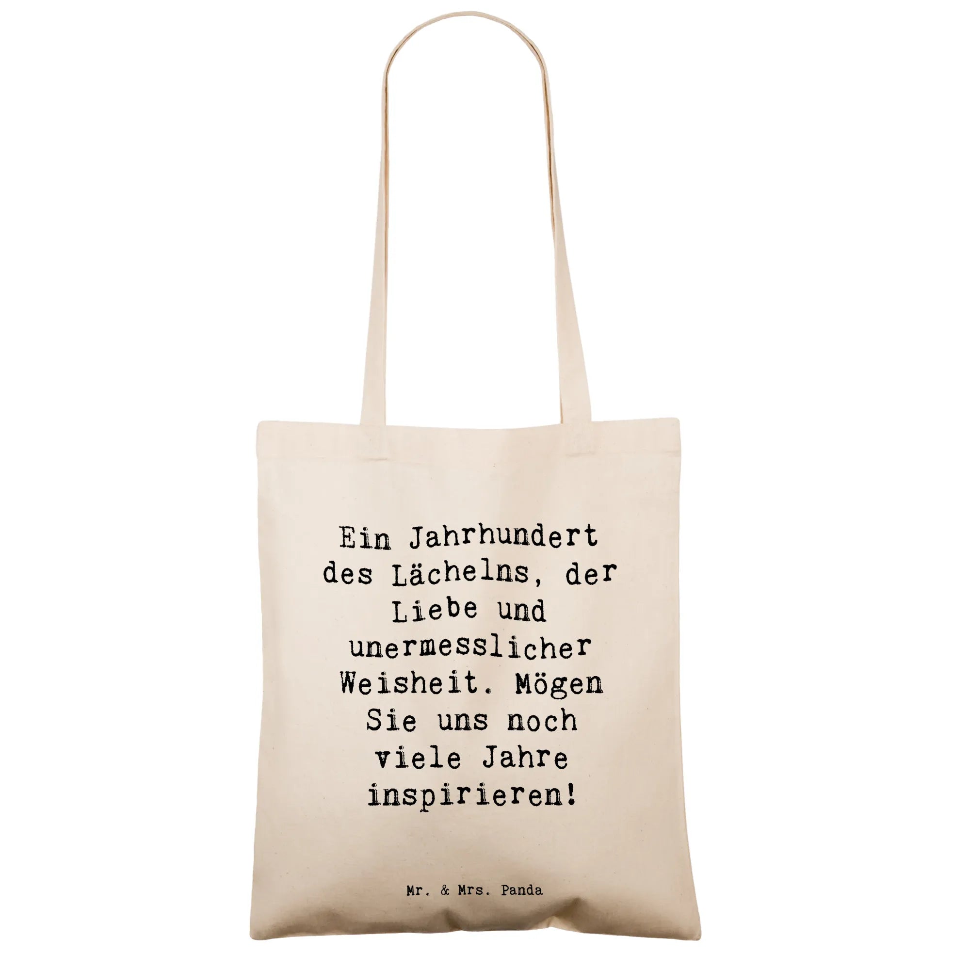 Feiere 100 Jahre Leben, Liebe und Weisheit mit Stil! Unsere Tragetasche von Mr. & Mrs. Panda mit dem liebevollen Spruch „Ein Jahrhundert des Lächelns, der Liebe und unermesslicher Weisheit. Mögen Sie uns noch viele Jahre inspirieren!“ ist das perfekte Geschenk zum 100. Geburtstag. Sie verbindet herzliche Worte mit praktischer Alltagstauglichkeit und ist ideal, um Oma, Opa oder andere Jubilarinnen und Jubilare zu überraschen. 🎉