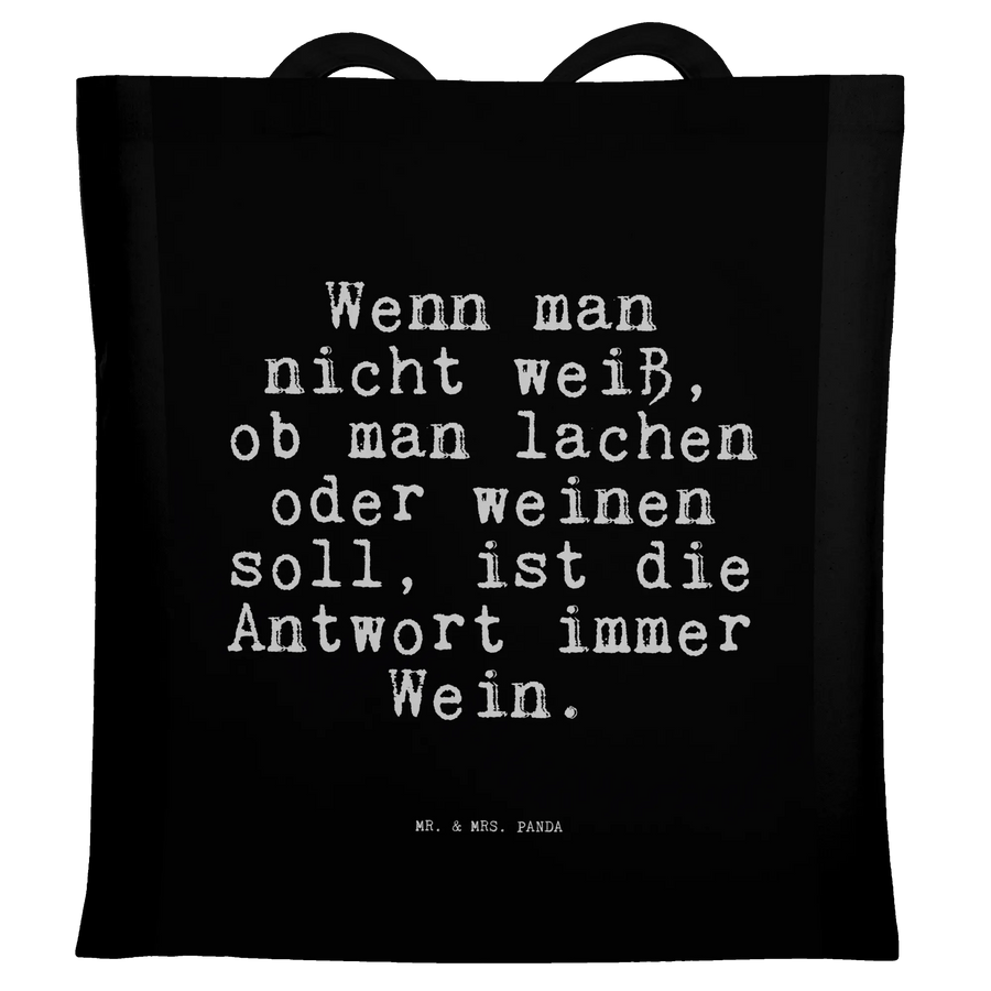 Die Tragetasche "Wenn man nicht weiß, ob man lachen oder weinen soll, ist die Antwort immer Wein." von Mr. & Mrs. Panda ist das perfekte Geschenk für all jene, die Freude und Humor in ihrem Alltag schätzen. Ob für eine beste Freundin, die gerade einen schwereren Tag durchlebt, oder für den Freund, der immer einen Spruch auf den Lippen hat – diese Tasche ist ein wahrhaftig liebevolles Präsent.