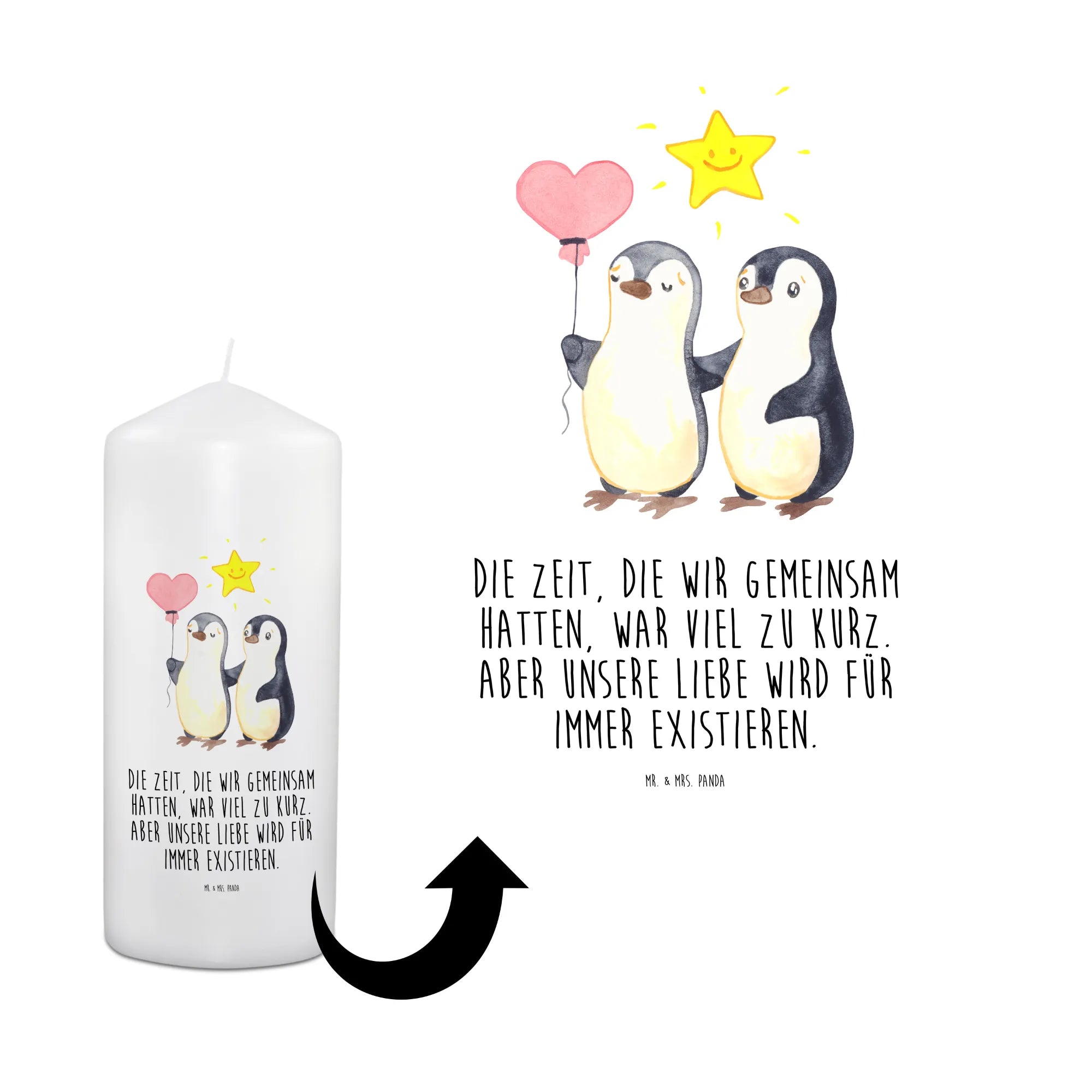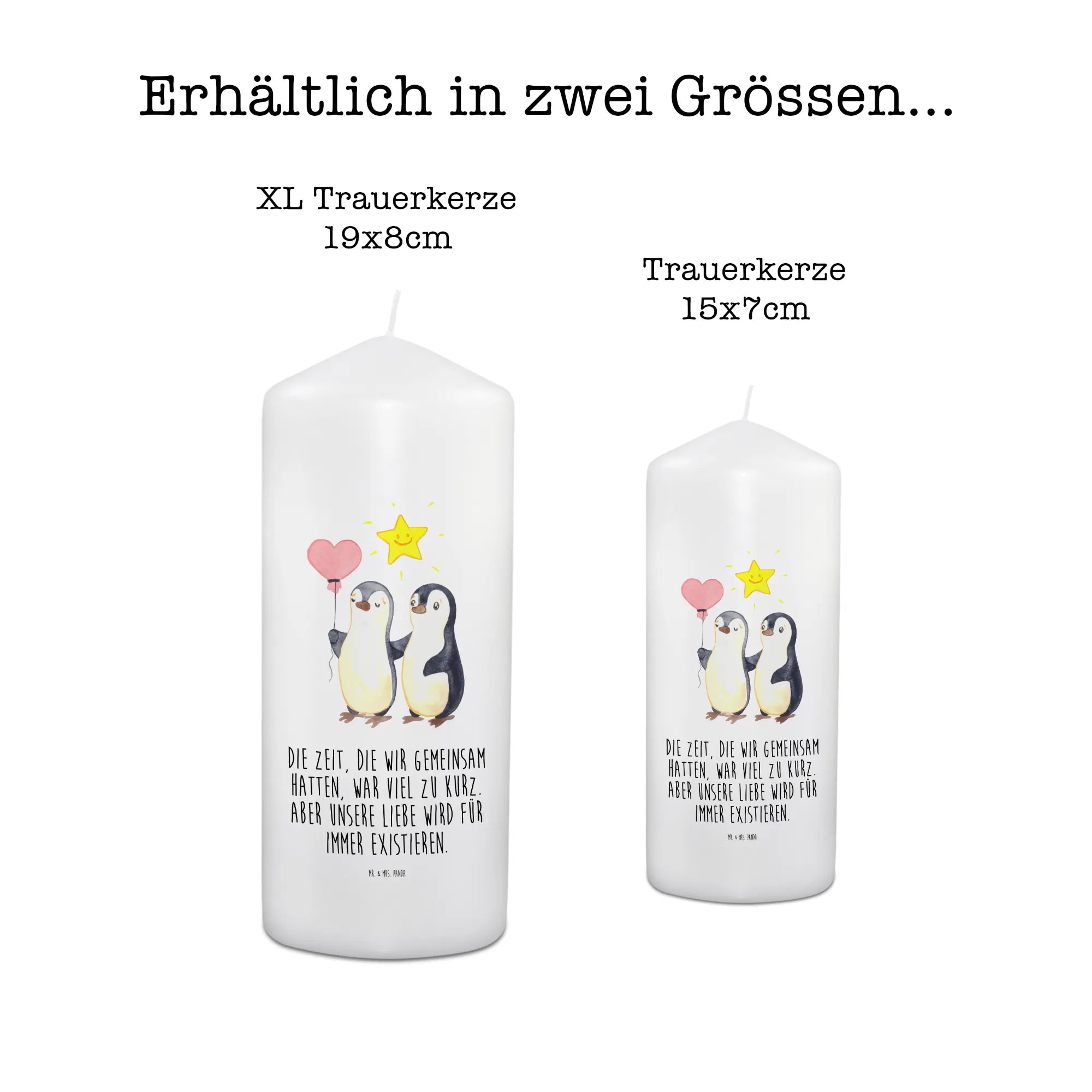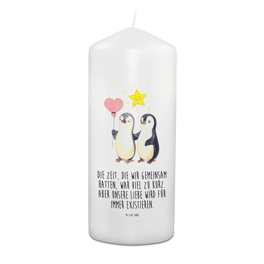 Diese Gedenkkerze trägt das liebevoll gezeichnete Motiv von zwei traurigen Pinguinen, die sich an der Flosse halten und zu den Sternen blicken. Die Mama-Pinguin hält einen Herz-Luftballon – ein Symbol für bleibende Liebe. Als Variante Mit Text steht auf der Kerze der bewegende Spruch: „Die Zeit, die wir gemeinsam hatten, war viel zu kurz. Aber unsere Liebe wird für immer existieren.“ ✨