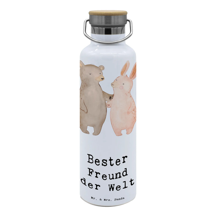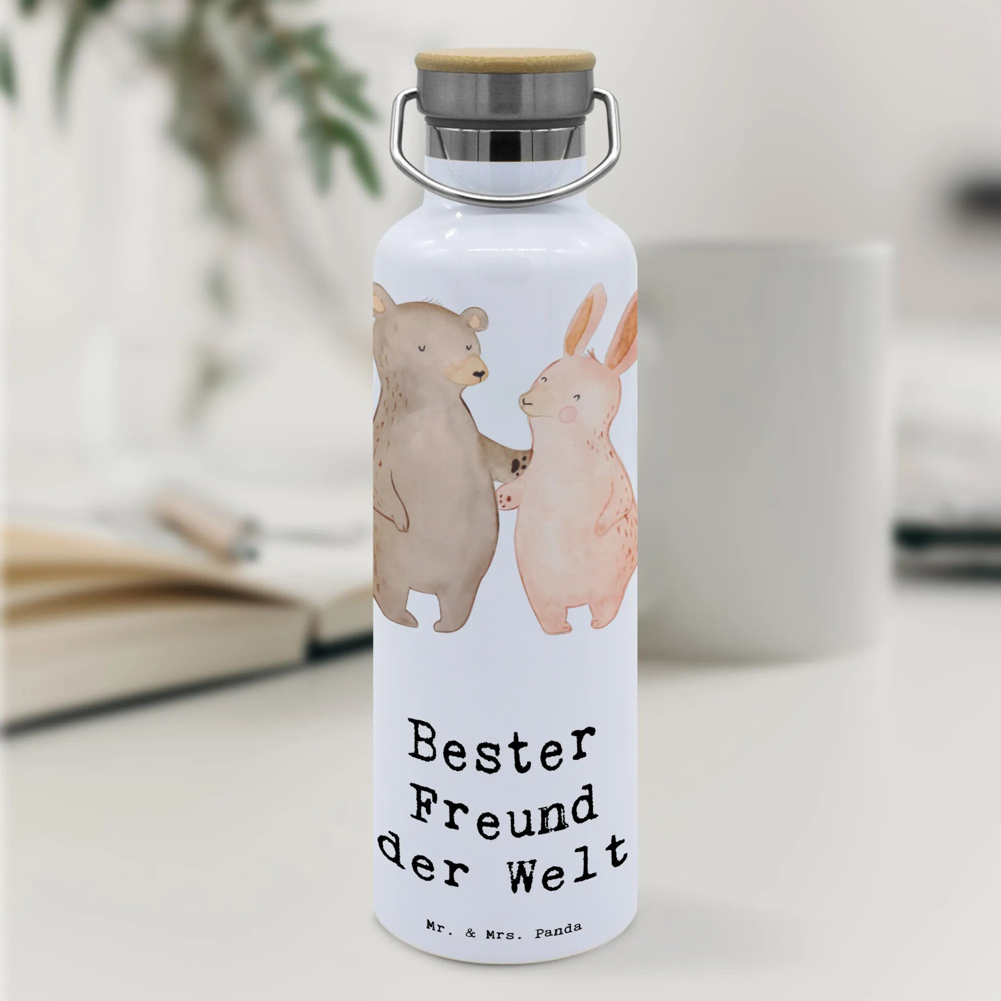 Diese bezaubernde Wasserflasche von Mr. & Mrs. Panda verbindet liebevolles Design mit durchdachter Funktion. Auf hellem Hintergrund siehst du das handgezeichnete Motiv: Ein süßer Bär hält einen niedlichen Hasen im Arm, begleitet vom Schriftzug „Bester Freund der Welt“. Ideal als Geschenkidee für deinen Lieblingsmenschen oder als fröhliche Trinkflasche für den Alltag.