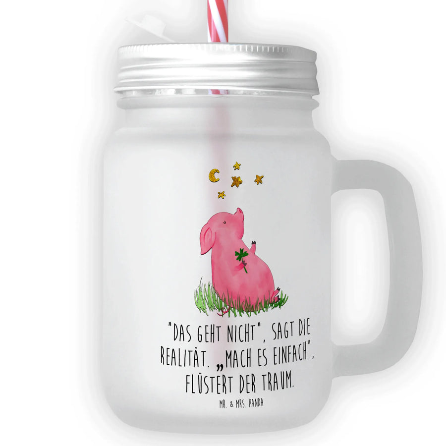 Das edle Trinkglas Mason Jar mit dem Motiv Glücksschwein von Mr. & Mrs. Panda ist nicht nur ein praktischer Begleiter für deine Sommerpartys, sondern auch ein wunderschönes Geschenk für all jene, die ein Stück Glück in ihrem Leben suchen. Mit seiner hohen Qualität aus satiniertem Premiumglas und dem robusten, silberfarbenen Metalldeckel bietet es Funktionalität und einen einzigartigen Charme. Das niedliche Design mit dem kleinen Schweinchen, das ein Kleeblatt hält, macht dieses Glas zu einem echten Blickfang – genau richtig für selbstgemachte Limonaden, Cocktails oder refreshende Eistees!