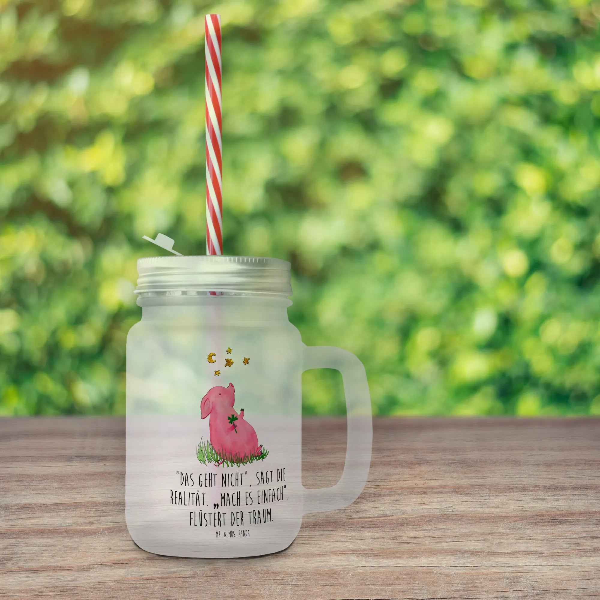 Entdecke das perfekte Trinkglas Mason Jar mit liebevollem Glücksschwein-Motiv aus der Small World Kollektion von Mr. & Mrs. Panda! Dieses edle und sommerliche Trinkglas ist nicht nur ein echter Hingucker, sondern auch ein Glücksbringer für alle, die ihre Träume verwirklichen wollen.
