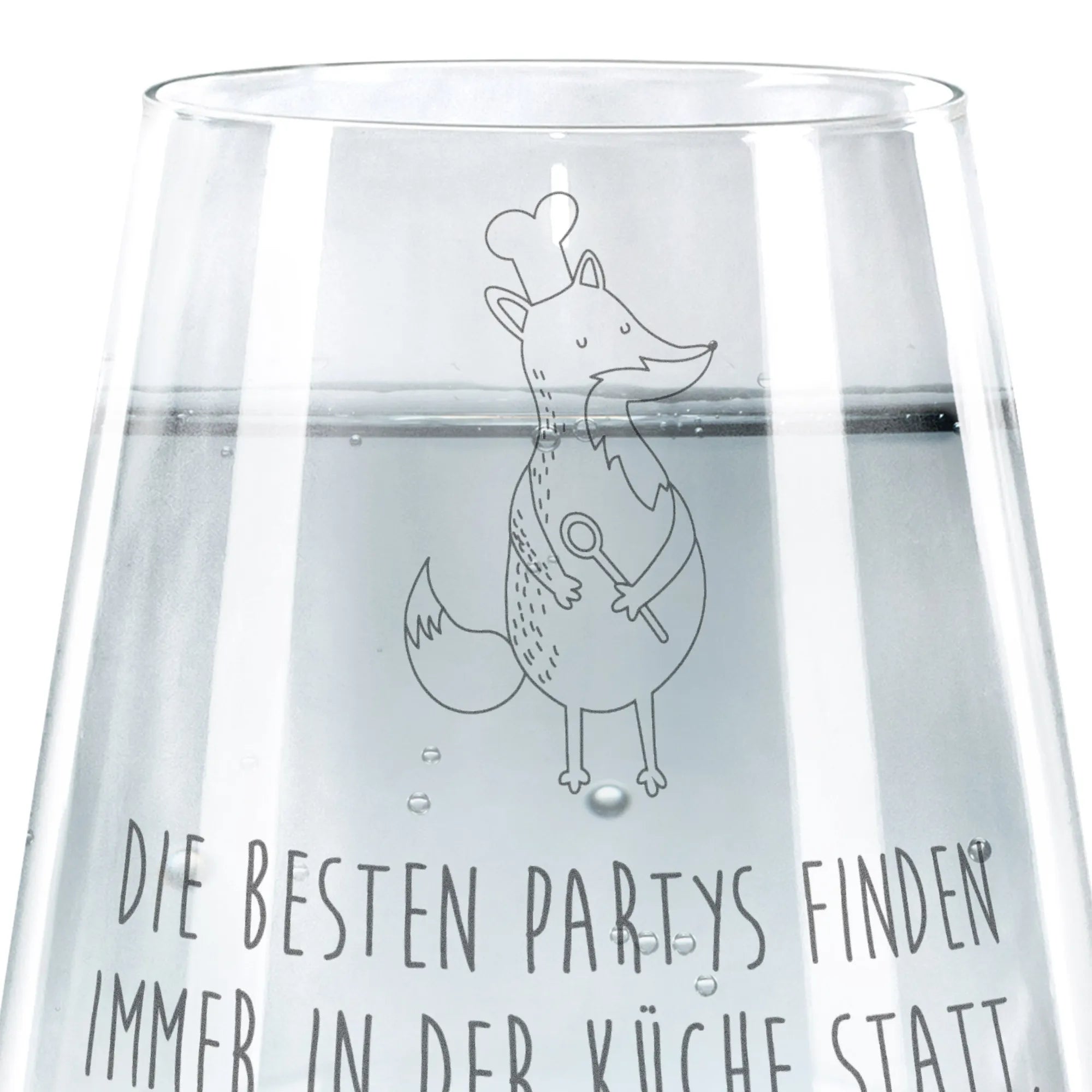 Das Trinkglas mit dem süßen Fuchs Koch Motiv von Mr. & Mrs. Panda ist das perfekte Geschenk für alle Küchenliebhaber und Hobbyköche! Ob als Wasserglas, Saftglas oder schlicht für dein Lieblingsgetränk – dieses Glas bringt Freude in jede Küche.