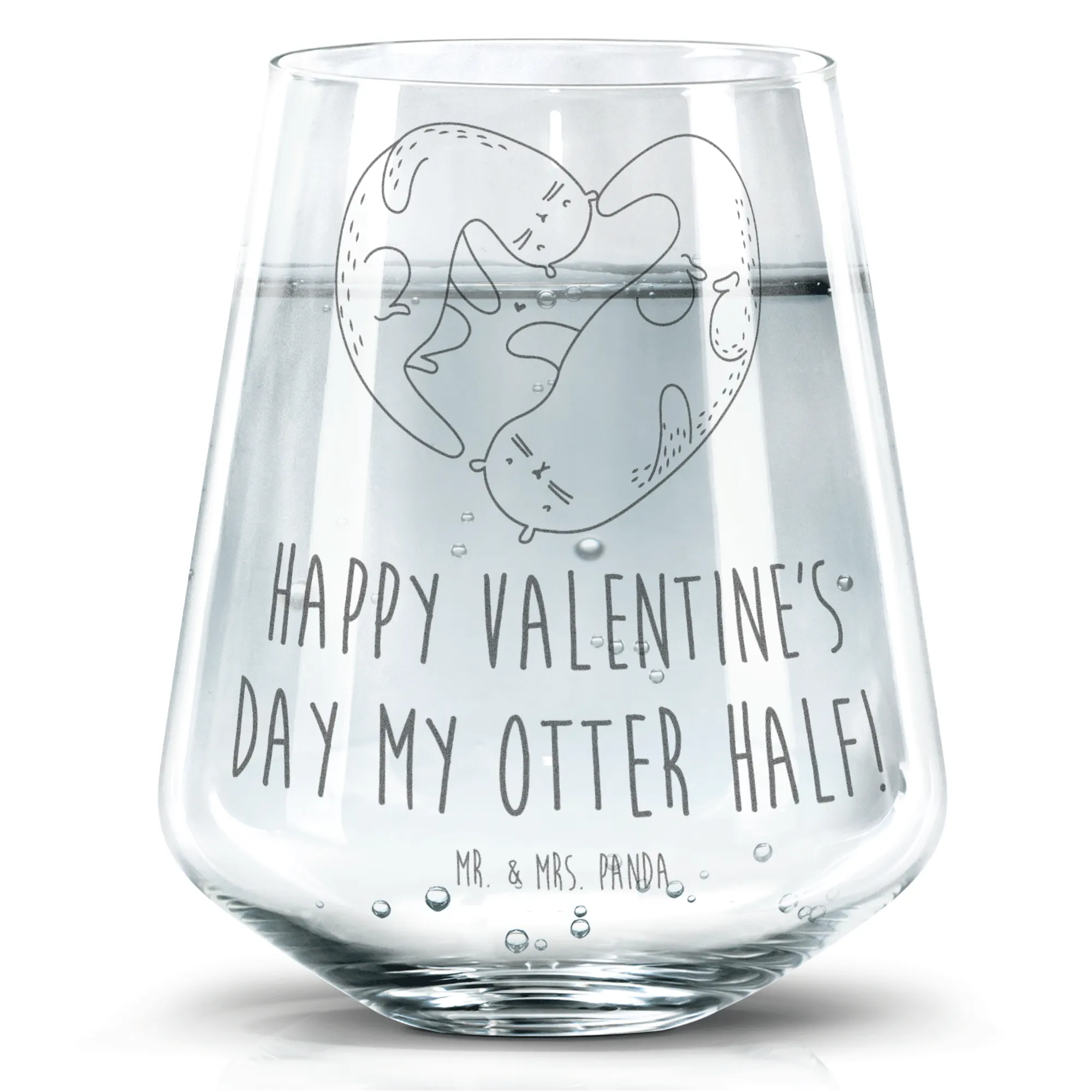 Dieses wunderschöne Trinkglas mit dem süßen Motiv "Otter Valentine" aus der Liebe Kollektion von Mr. & Mrs. Panda ist das perfekte Geschenk für alle Verliebten! Egal ob für den Valentinstag, einen Jahrestag oder einfach nur so - mit der liebevollen Gravur "Happy valentine's day my otter half!" wird dieses Glas zum ganz besonderen Liebesbeweis. Die zwei niedlichen Otter, die sich an den Händen halten und ein Herz formen, bringen jedes Herz zum Schmelzen.