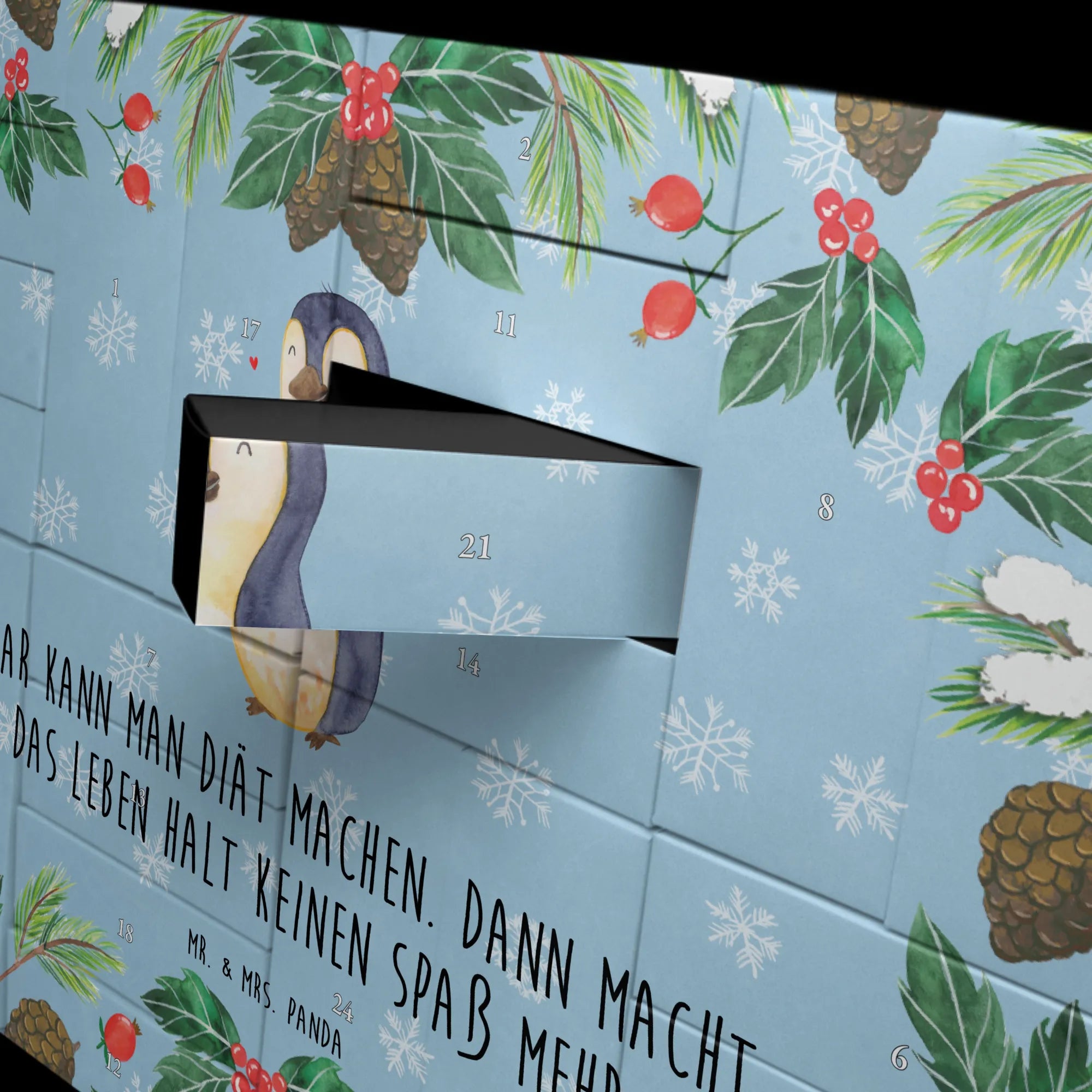 Der befüllbare Adventskalender Pinguin Diät von Mr. & Mrs. Panda ist die perfekte Geschenkidee für jeden, der auf humorvolle und liebevolle Weise die Vorweihnachtszeit erleben möchte. Mit seinen 24 Schachteln zum Selbstbefüllen bleibt es jedem selbst überlassen, was er hineinlegt – sei es Süßes, Kleines oder persönliche Botschaften!