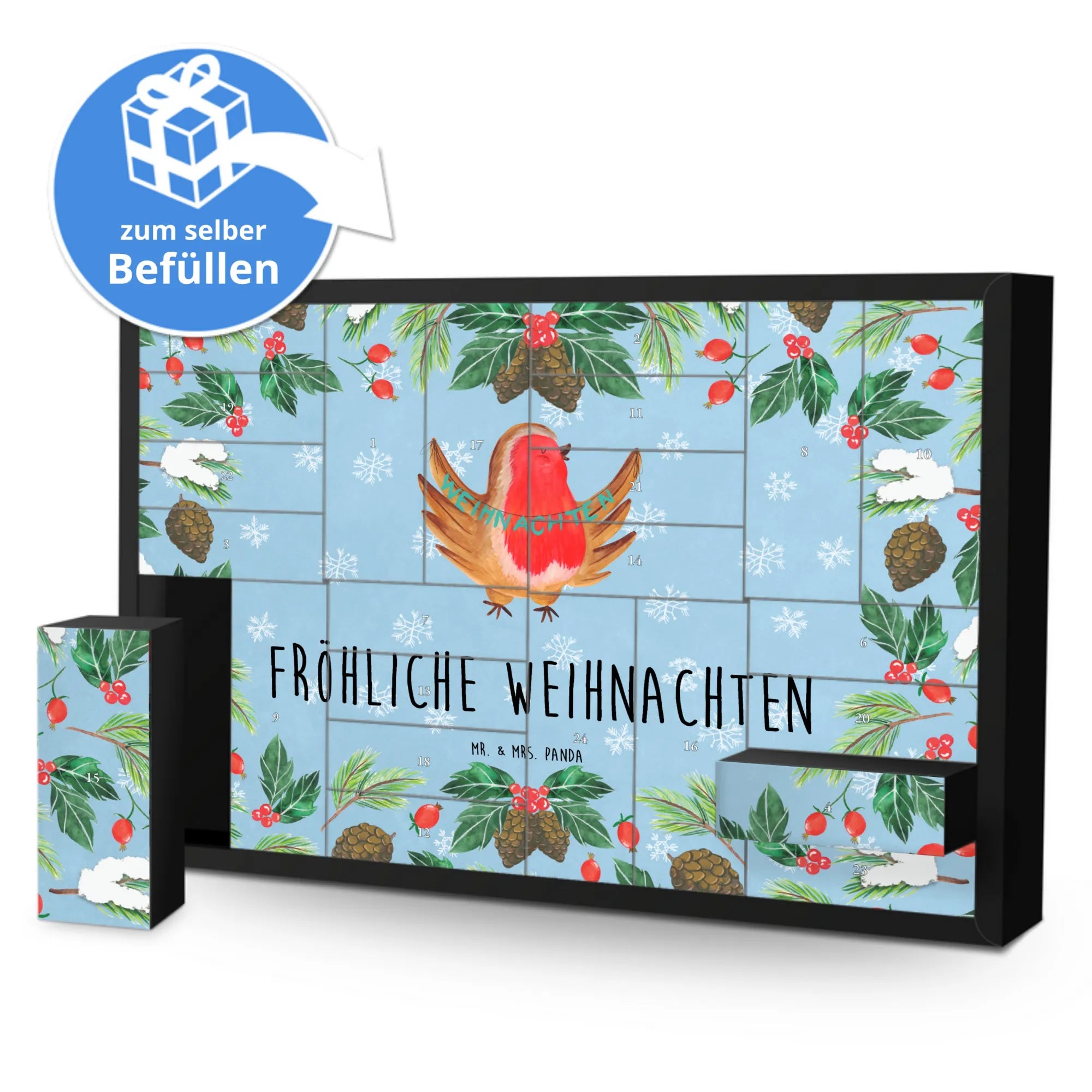 Juhuu – die Weihnachtszeit beginnt! Unser befüllbarer Adventskalender Rotkehlchen Weihnachten von Mr. & Mrs. Panda bringt die gemütliche Stimmung direkt zu dir nach Hause. Das süße Rotkehlchen auf eisblauem Hintergrund und der herzliche Schriftzug Fröhliche Weihnachten machen den Kalender zu einem liebevollen Blickfang in deinem Wohnzimmer.