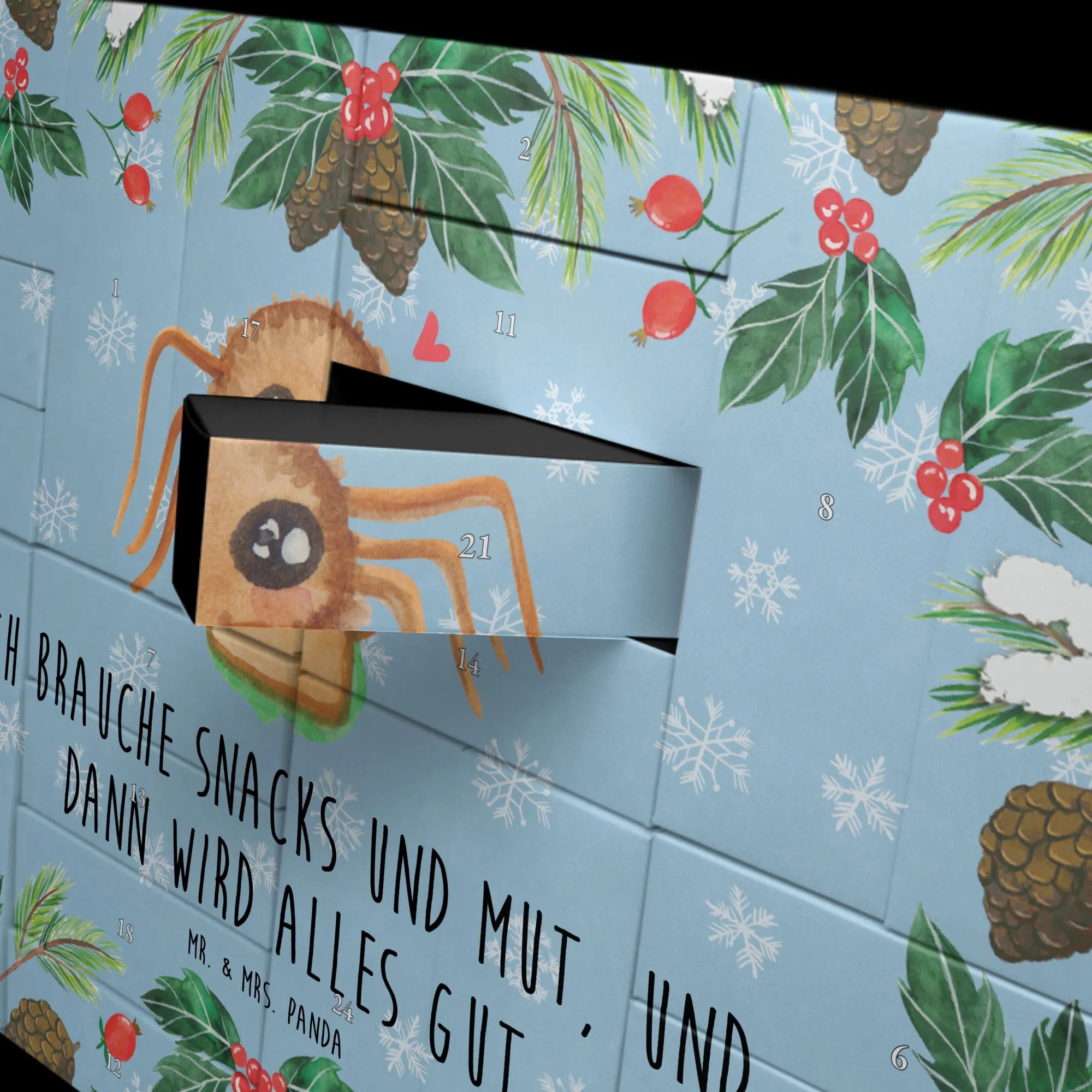 Dieser Adventskalender, der mit funkelnden Motiven und herzlichen Sprüchen von Mr. & Mrs. Panda bedruckt ist, bringt eine gehörige Portion Lebensfreude in die kalte Jahreszeit. Das handgezeichnete Bild von Mrs. Panda zeigt die niedliche Spinne Agathe, die hungrig ein Sandwich snackt und damit den Geist von Glück und Lebensfreude verkörpert. Sie erinnert uns daran, dass kleine Dinge im Leben, wie ein köstlicher Snack, viel Mut verleihen und uns durch die Herausforderungen des Alltags tragen können.