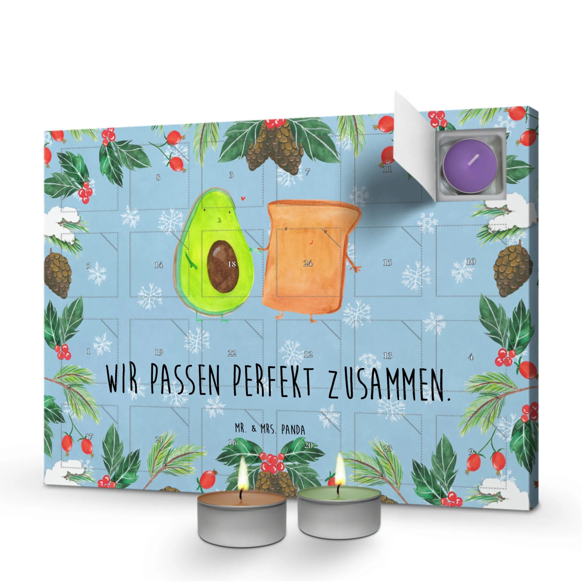Zauberhafte Momente in der Vorweihnachtszeit – unser Duftkerzen Adventskalender mit dem süßen Motiv Avocado + Toast ist das perfekte Geschenk für Paare, Freunde und alle, die Liebe zum Detail schätzen. Er bietet dir jeden Tag einen neuen, wundervollen Duft, der dein Zuhause in festliche Stimmung versetzt. Mit liebevollen Zeichnungen von Mrs. Panda und dem Slogan 'Wir passen perfekt zusammen.' wird jeder Tag zu einem kleinen Fest.