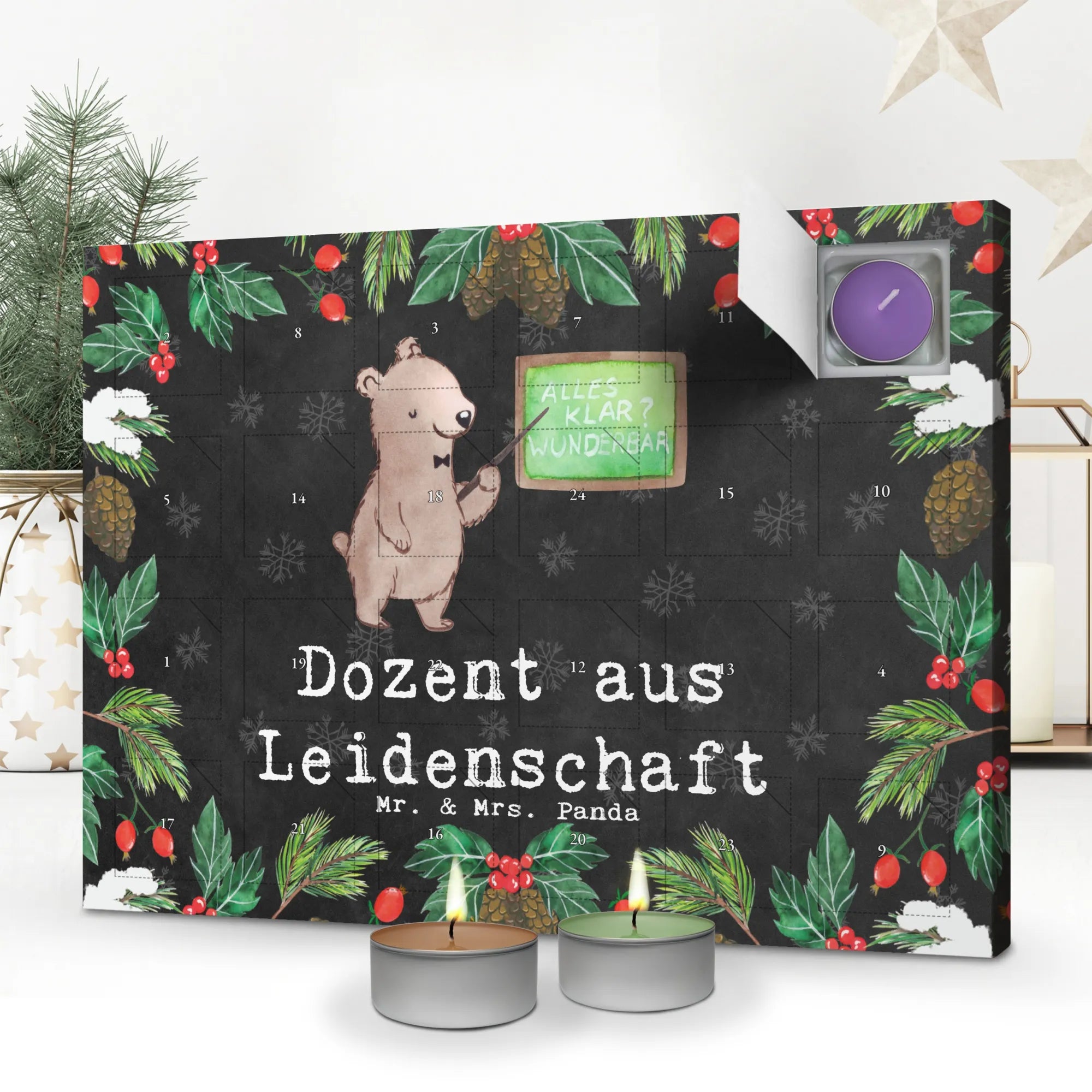 Der Duftkerzen Adventskalender "Dozent aus Leidenschaft" von Mr. & Mrs. Panda ist das perfekte Geschenk für alle Lehrer, Dozenten und Akademiker, die ihre Vorlesungen mit einem Hauch von Gemütlichkeit und Freude bereichern möchten.