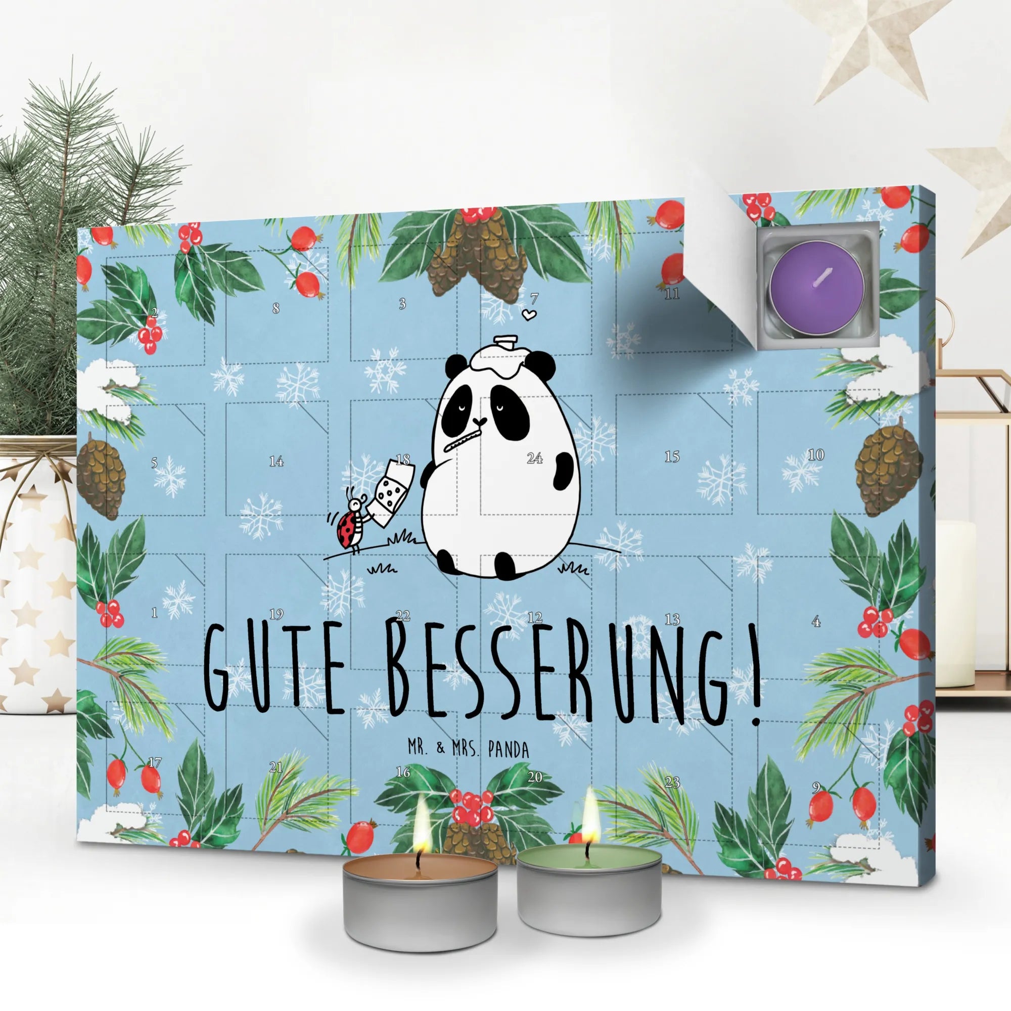 Der Duftkerzen Adventskalender "Easy & Peasy Gute Besserung!" von Mr. & Mrs. Panda ist das perfekte Geschenk für all jene, die in der besinnlichen Adventszeit ihren Lieben eine besondere Freude bereiten möchten. Die liebevolle Zeichnung von Mrs. Panda zeigt einen süßen Panda, der erkältet mit einem Thermometer im Mund auf einer Wiese sitzt, während ihm sein bester Freund, der Marienkäfer, ein Pflaster reicht. Dieses herzerwärmende Motiv wird jedem ein Lächeln auf die Lippen zaubern und lässt das Herz im Winter erstrahlen!