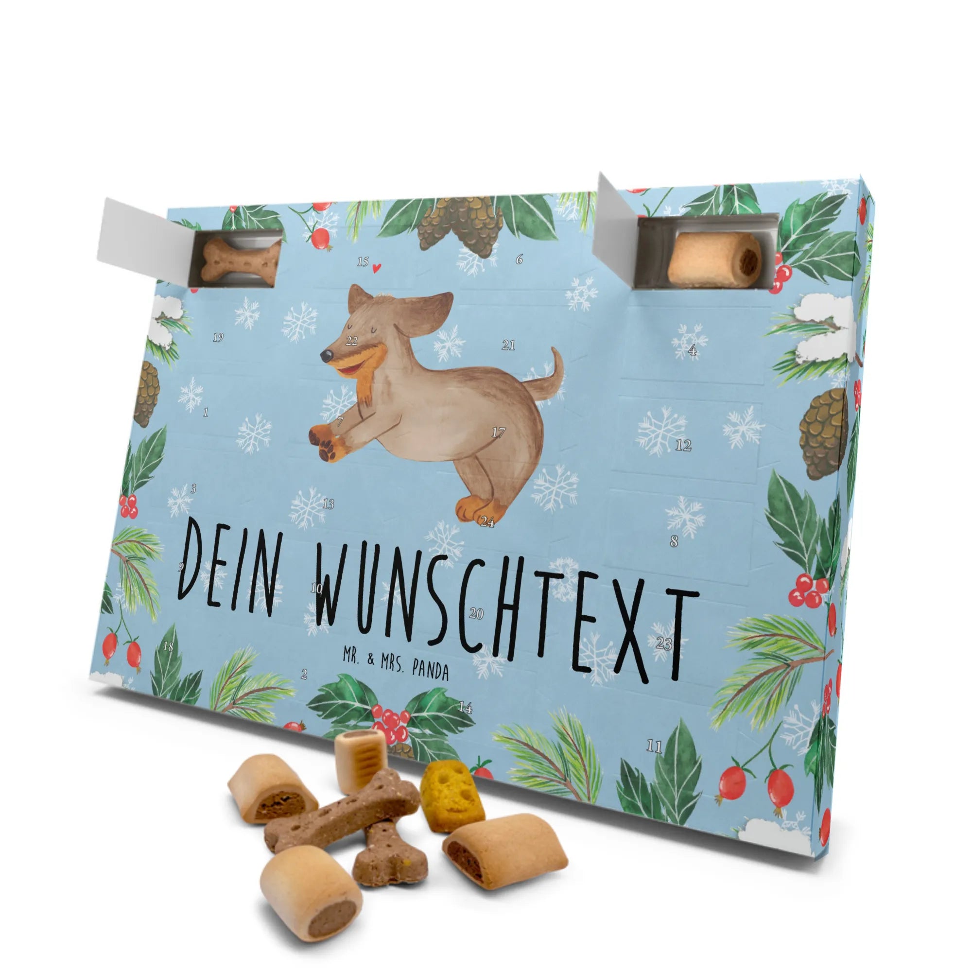 Adventskalender für Hunde personalisiert – entdecke den besonderen Kalender von Mr. & Mrs. Panda, der jeden Tag im Dezember zu einem kleinen Fest für deinen Hund macht. Mit liebevollen Illustrationen und witzigen Sprüchen bedruckt, kannst du den Kalender mit deinem Wunschtext oder Namen versehen. Die hochwertige, seidenmatte Oberflächenveredelung und der brillante Druck sorgen für satte Farben, die auch auf den bedruckten Seitenflächen durchscheinen. Befüllt ist der Kalender mit 24 Premium-Hundekuchen in vier Variationen: Beef Cake Mix, Mini Knabberknochen, Käse Snack und Panino Röllchen. Alle Leckereien sind luftig gebacken und aus sorgfältig ausgewählten Zutaten gemacht: Getreide, Glucose, Fleisch und tierische Nebenerzeugnisse, Öle und Fette, Mineralstoffe. Maße: 325 mm x 225 mm x 27 mm. Der Kalender lässt sich sowohl aufstellen als auch aufhängen – ideal für jede Ecke im Zuhause. Hinweis: Ohne Konservierungsstoffe. Verschenke Vorfreude und viele glückliche Schwänzchenwedler mit diesem individuell gestalteten Adventskalender.
