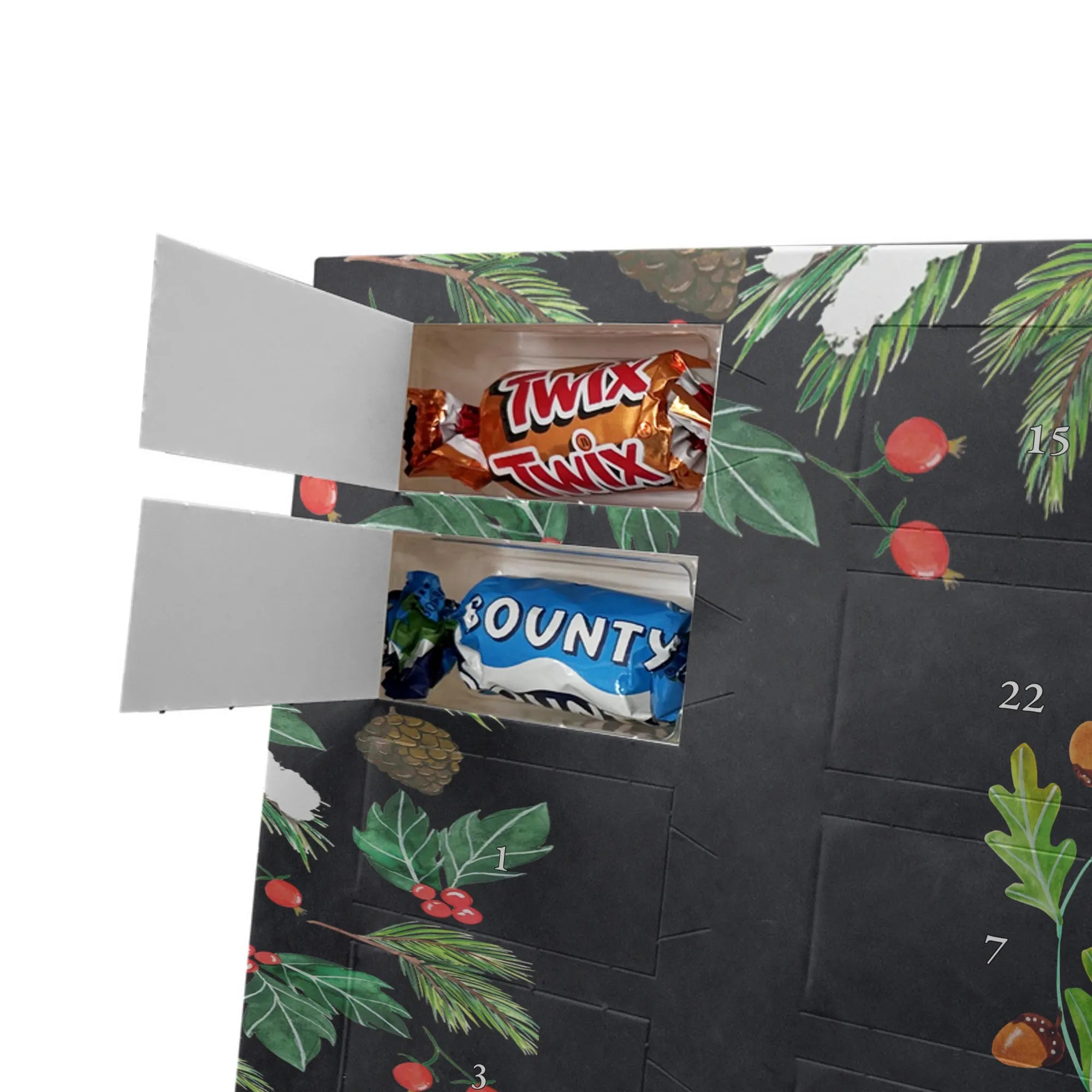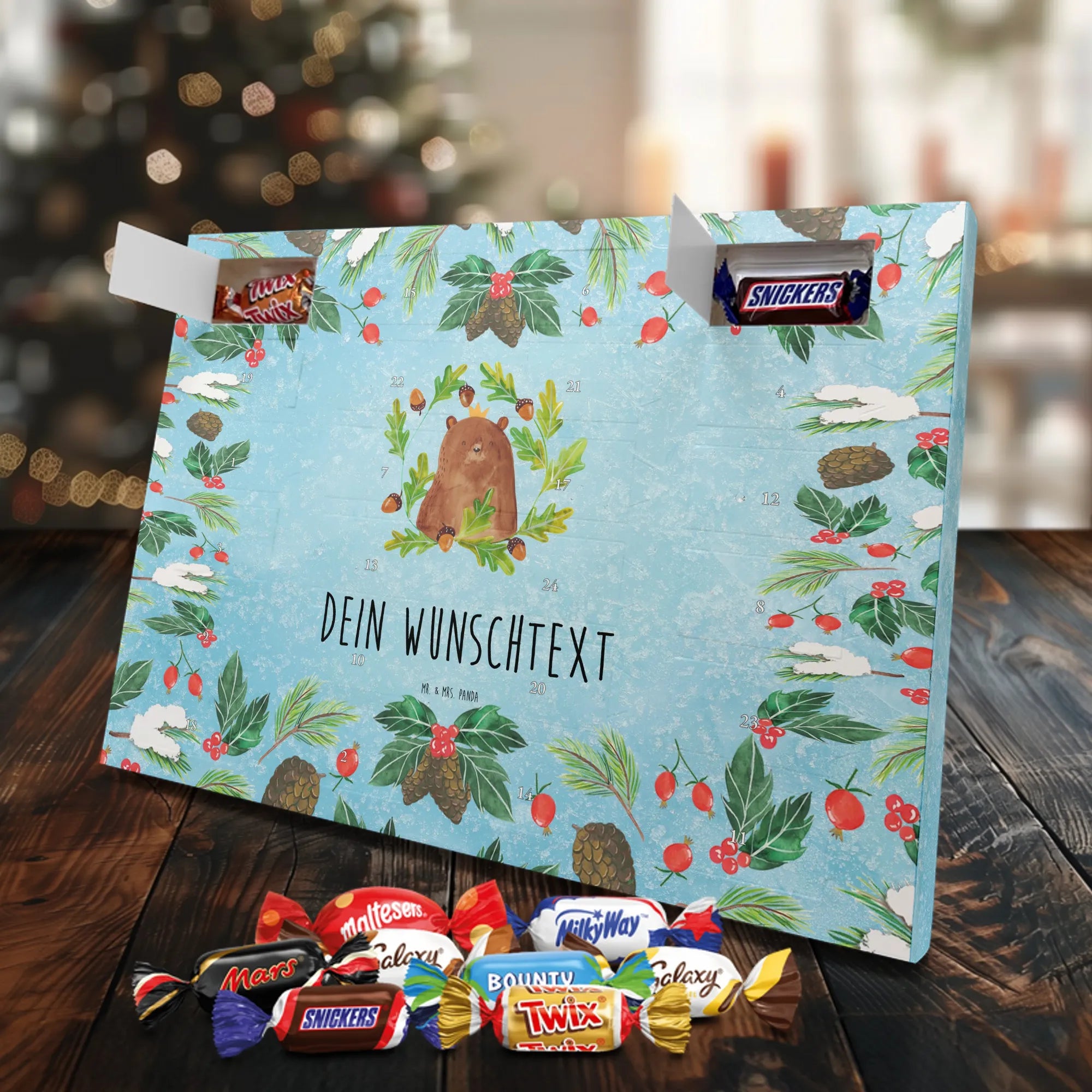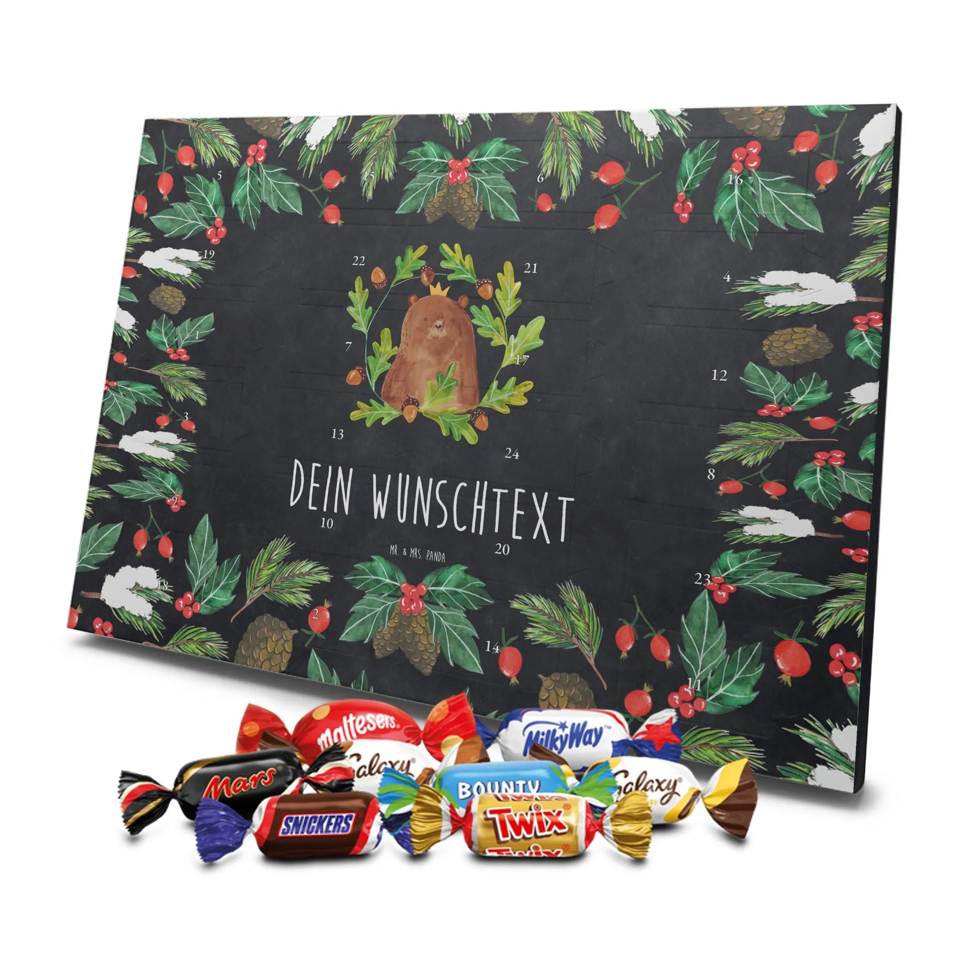 Personalisierter Schoko-Adventskalender von Mr. & Mrs. Panda – liebevoll gestaltet und ideal als individuelles Geschenk in der Adventszeit. Wir bedrucken den Kalender mit zauberhaften Motiven & herzlichen Sprüchen und personalisieren ihn mit deinem Wunschnamen oder Wunschtext. Die hochwertige Druckqualität kombiniert mit einer seidenmatten Oberflächenveredelung sorgt für ein edles Erscheinungsbild, und die bedruckten Seitenflächen geben dem Motiv zusätzlichen Charme. Der Kalender kann aufgehängt oder aufgestellt werden, sodass du ihn flexibel platzieren kannst. Gefüllt ist der Kalender mit Celebrations, die 24 hochwertige Überraschungen in 8 verschiedenen Sorten beinhalten: Maltesers, Mars, Snickers, Twix, Milky Way, Bounty, Galaxy und Galaxy Caramel. Maße: 325 mm x 225 mm x 27 mm – handlich und doch großzügig für die kleinen Leckereien hinter den Türchen. Ob für Kinder, Partner oder beste Freunde: dieser personalisierte Schoko-Adventskalender macht das Warten auf Weihnachten bunter und leckerer. Verschenke eine persönliche Erinnerung und jeden Tag ein kleines Schokoladen-Glück!