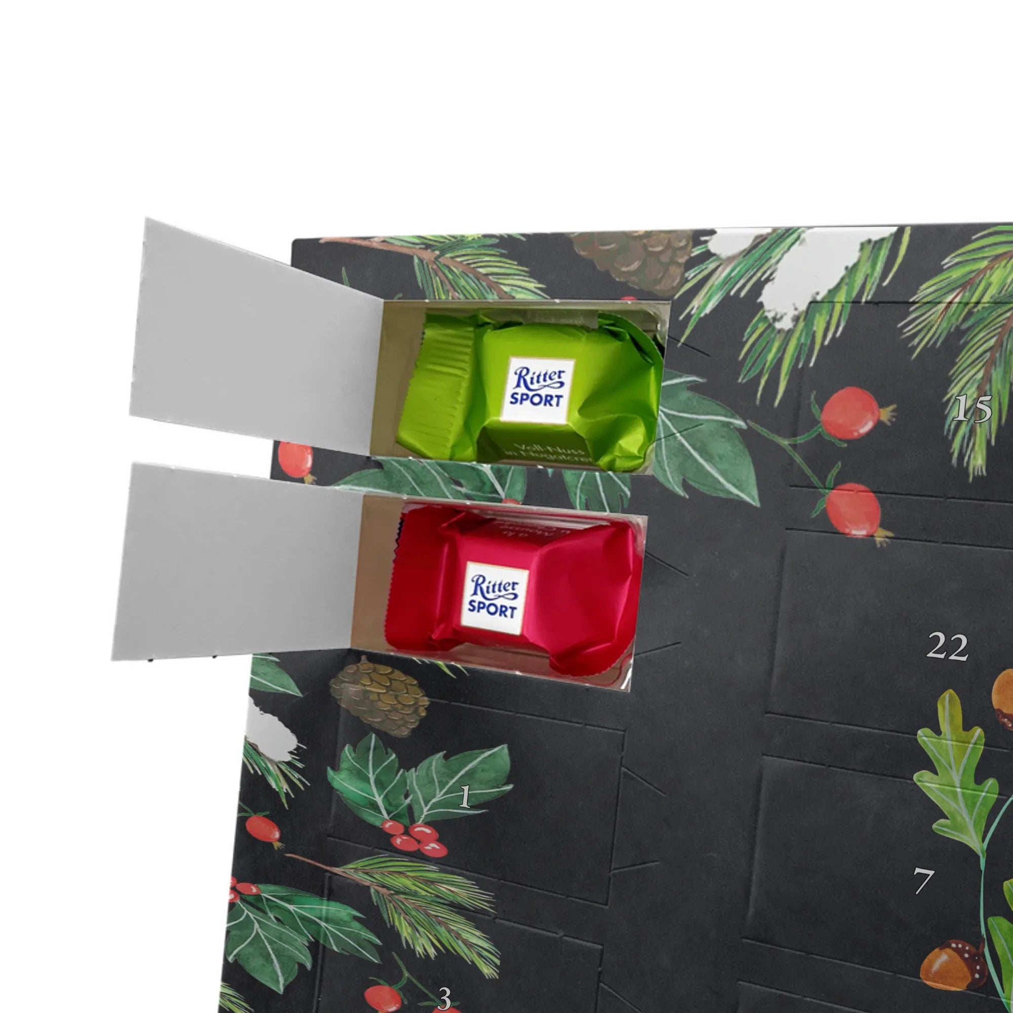 🐼 24 Türchen mit Ritter Sport Schokowürfeln in beliebten Sorten.
