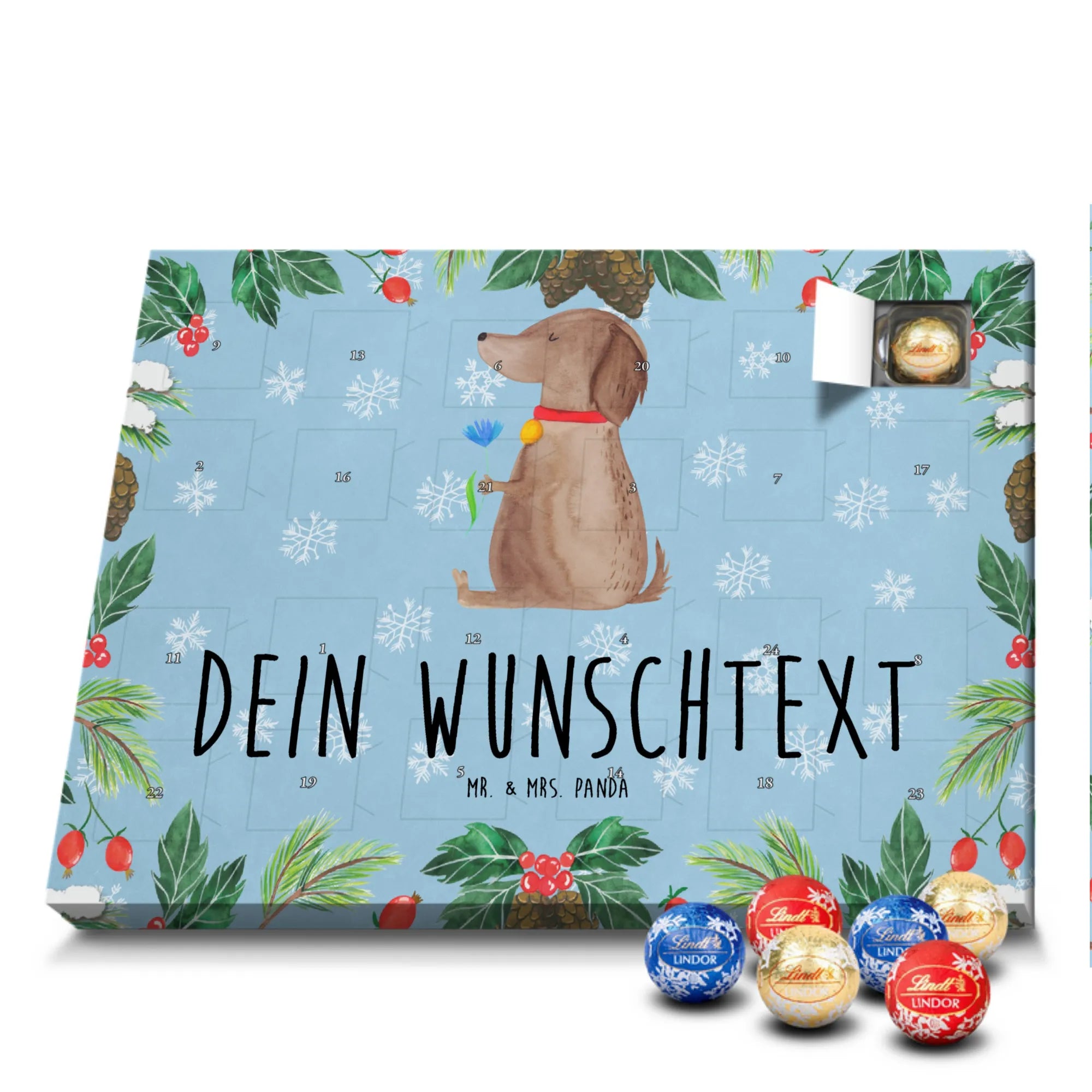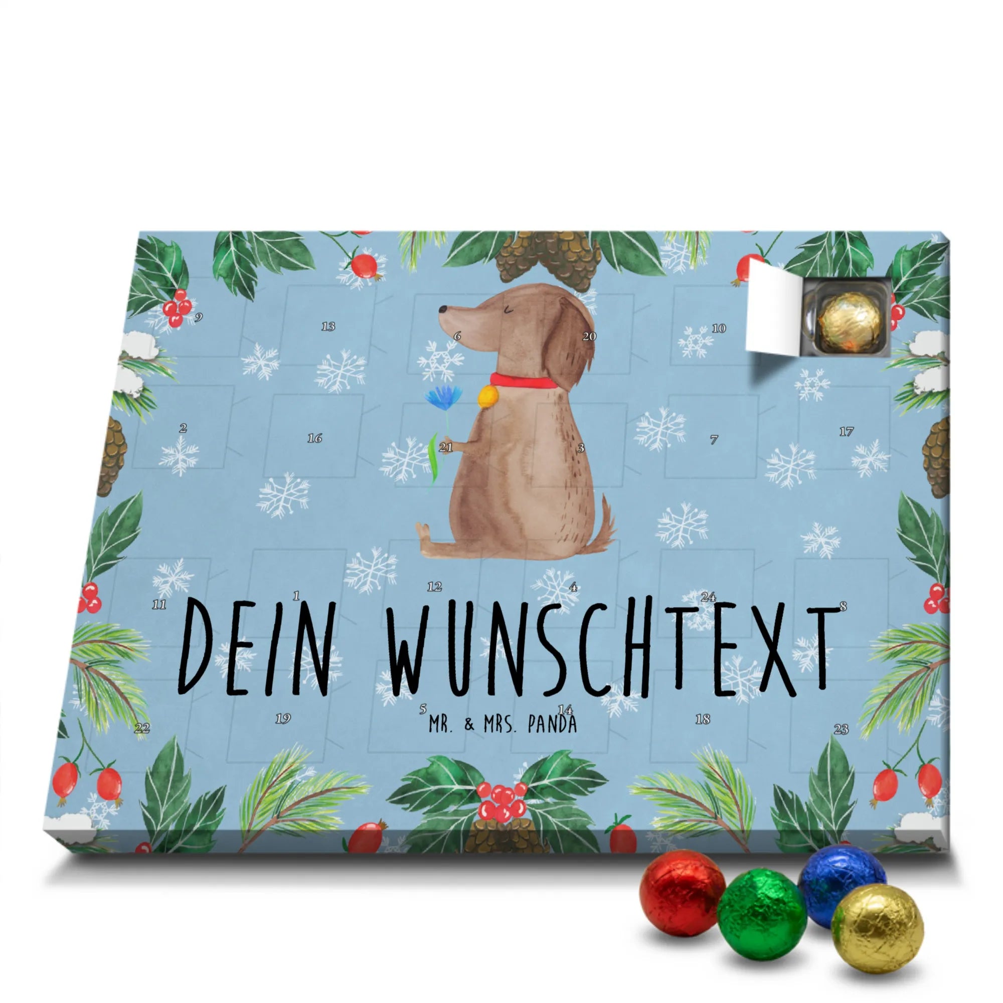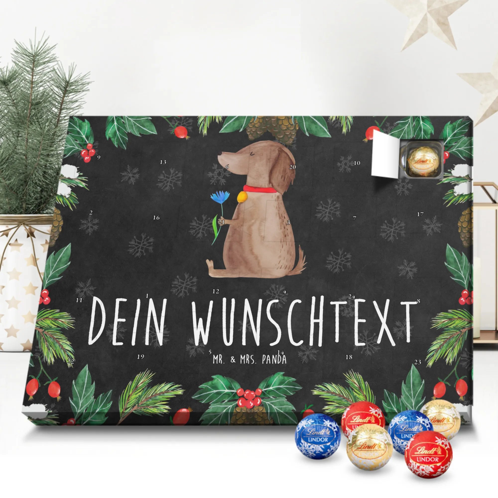 Ideal als Weihnachtsgeschenk, Adventsüberraschung für das Frauchen, Geschenk für Hundebesitzer oder originelle Idee für Hundeliebhaber. Verschenke Freude, Stil und tägliche Genussmomente – mit dem personalisierten Adventskalender „Hund Blume“ von Mr. & Mrs. Panda. 🎁🐾