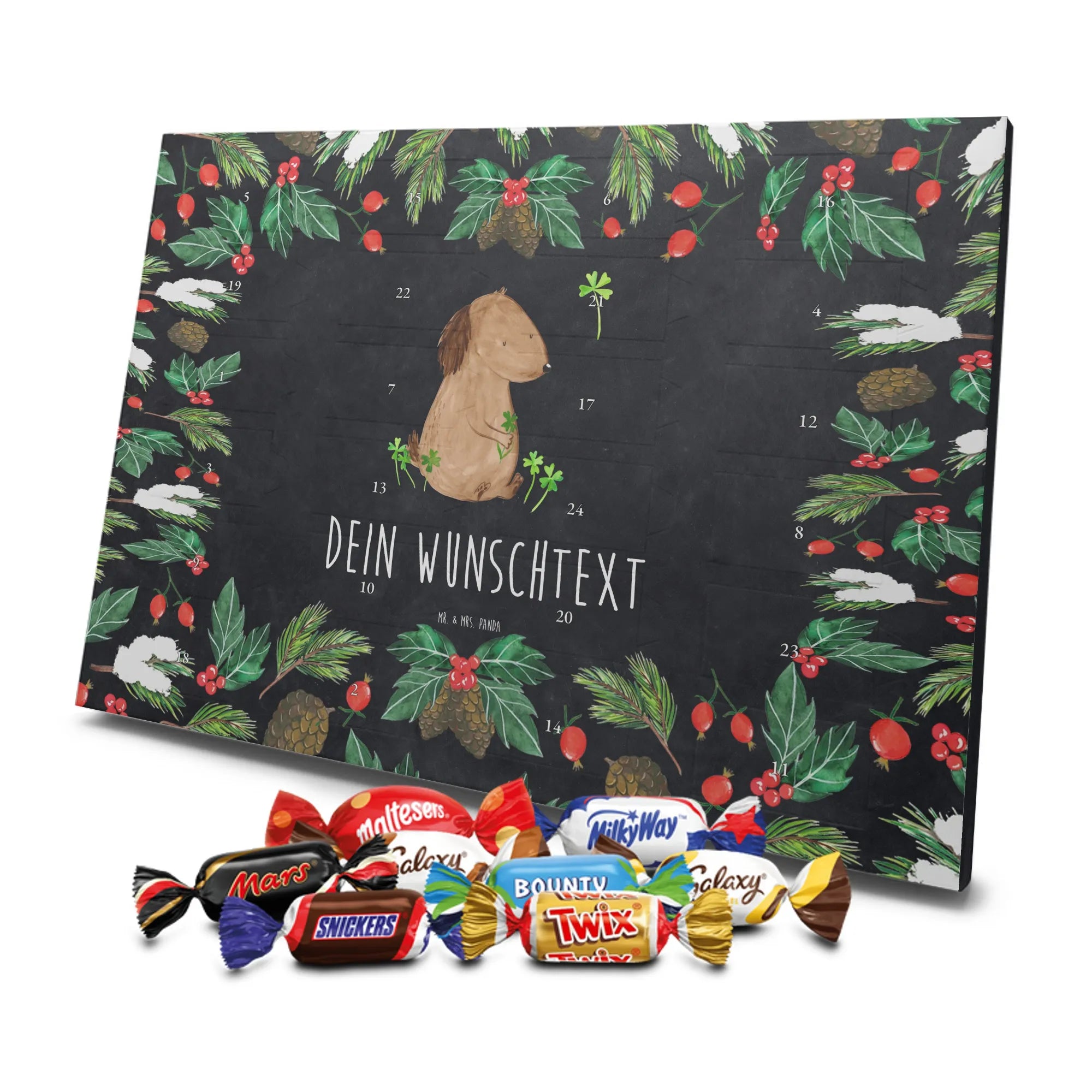 Personalisierter Schoko-Adventskalender von Mr. & Mrs. Panda – liebevoll gestaltet und ideal als individuelles Geschenk in der Adventszeit. Wir bedrucken den Kalender mit zauberhaften Motiven & herzlichen Sprüchen und personalisieren ihn mit deinem Wunschnamen oder Wunschtext. Die hochwertige Druckqualität kombiniert mit einer seidenmatten Oberflächenveredelung sorgt für ein edles Erscheinungsbild, und die bedruckten Seitenflächen geben dem Motiv zusätzlichen Charme. Der Kalender kann aufgehängt oder aufgestellt werden, sodass du ihn flexibel platzieren kannst. Gefüllt ist der Kalender mit Celebrations, die 24 hochwertige Überraschungen in 8 verschiedenen Sorten beinhalten: Maltesers, Mars, Snickers, Twix, Milky Way, Bounty, Galaxy und Galaxy Caramel. Maße: 325 mm x 225 mm x 27 mm – handlich und doch großzügig für die kleinen Leckereien hinter den Türchen. Ob für Kinder, Partner oder beste Freunde: dieser personalisierte Schoko-Adventskalender macht das Warten auf Weihnachten bunter und leckerer. Verschenke eine persönliche Erinnerung und jeden Tag ein kleines Schokoladen-Glück!
