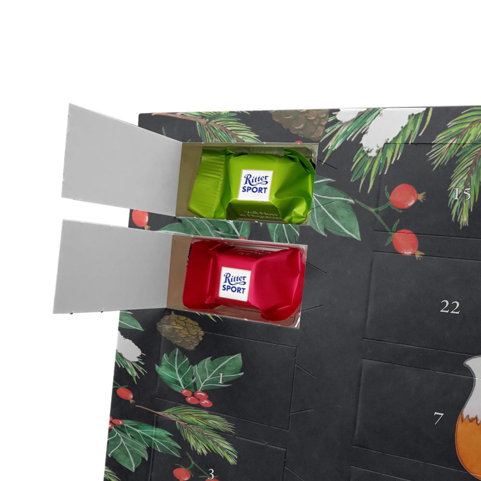 Suchst du einen besonderen Adventskalender, der persönlich und hochwertig ist? Unser Adventskalender mit Namen von Mr. & Mrs. Panda ist genau das – individualisierbar mit dem Namen deiner Liebsten oder einem kurzen Spruch und bedruckt mit unseren beliebten, charmanten Motiven. Die Druckqualität ist brillant, die seidenmatte Oberflächenveredelung verleiht dem Kalender eine elegante Haptik. Auch die Seitenflächen sind liebevoll bedruckt, sodass das Design rundum überzeugt. Du kannst den Kalender aufstellen oder an einer Stelle aufhängen, die du magst – die besondere Form macht beides möglich. Gefüllt ist der Kalender mit Ritter Sport Schokowürfeln in sechs beliebten Sorten: Mousse au Chocolat, Schoko Crisp, Voll-Nuss in Nougatcreme, Karamell Duo, Joghurt und Erdbeer-Joghurt. So gibt es hinter jedem Türchen eine kleine, leckere Überraschung. Maße: 325 mm x 225 mm x 27 mm – kompakt genug, um überall Platz zu finden, groß genug für 24 sorgfältig verpackte Schokowürfel.