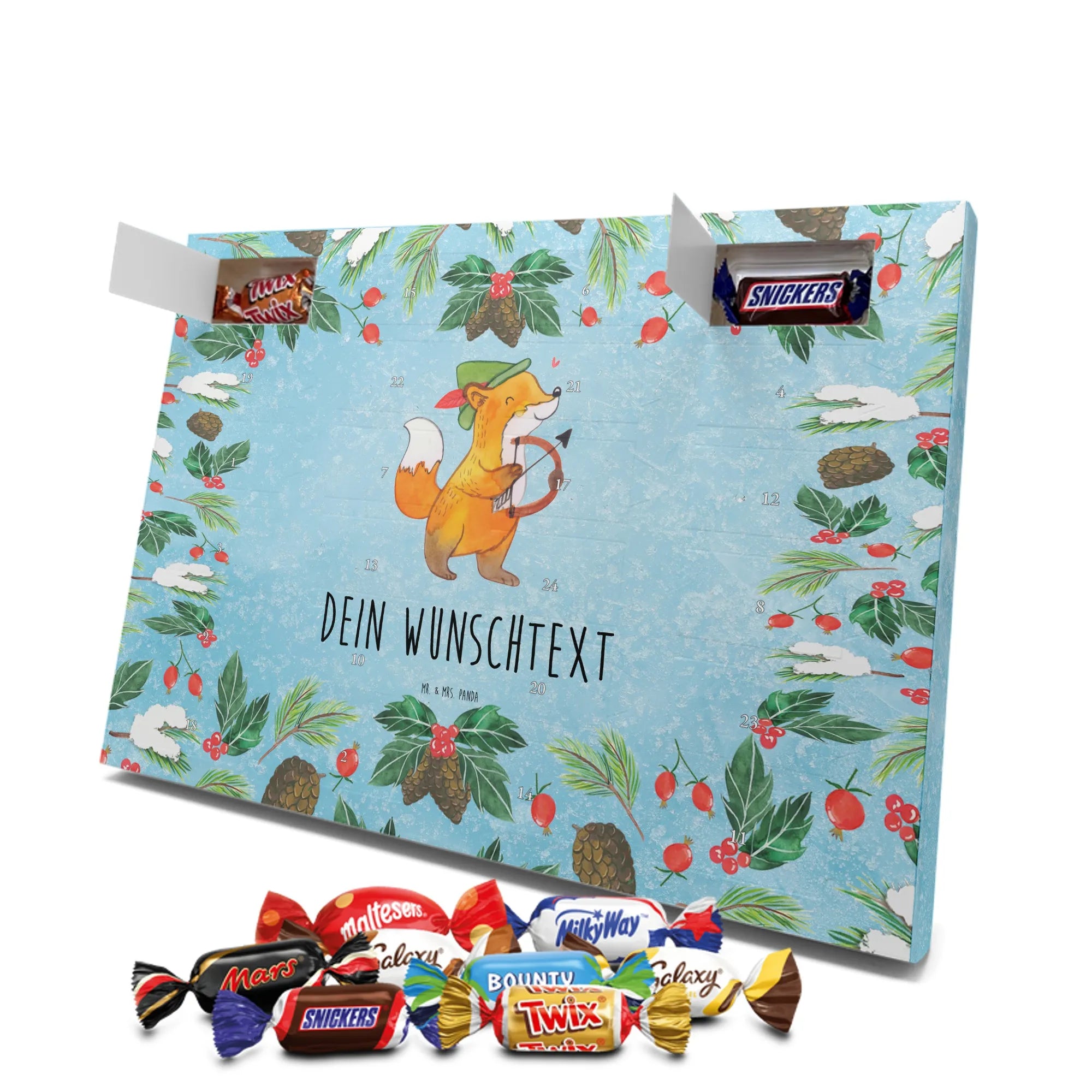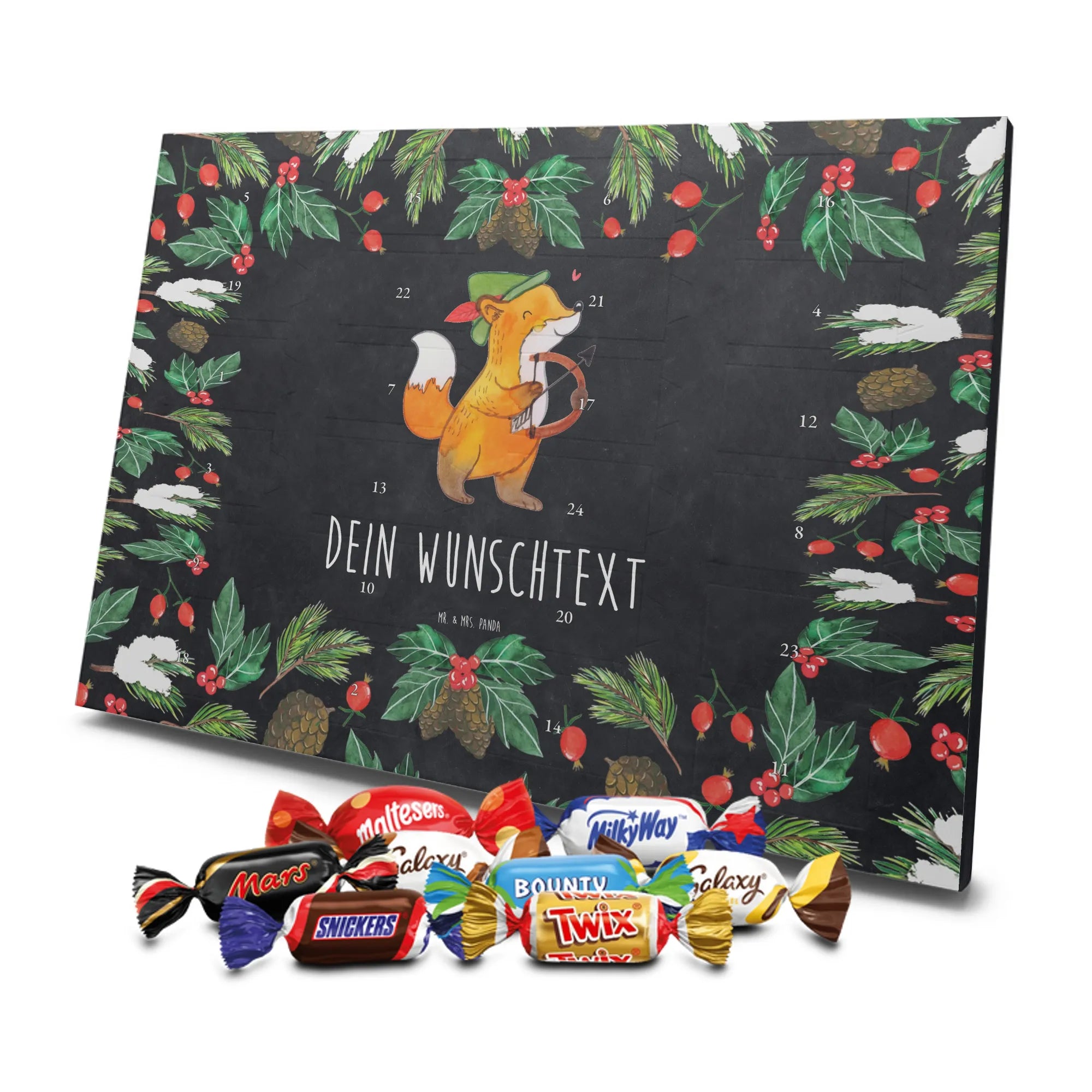 Adventskalender mit deinem Namen – individuell, süß und mit ganz viel Mr. & Mrs. Panda Charme! Dieser personalisierbare Schoko Adventskalender wird mit liebevollen Motiven & frechen Sprüchen bedruckt und lässt sich mit deinem Wunschnamen oder Wunschtext individualisieren. Durch die brillante Druckqualität und die seidenmatte Oberflächenveredelung wirken die Farben besonders intensiv und hochwertig. Auch die Seitenflächen sind bedruckt, sodass das Gesamtbild stimmig ist. Du hast die Wahl: Häng den Kalender auf oder stell ihn auf – beides funktioniert super. Der Kalender ist gefüllt mit Celebrations und enthält 24 hochwertige Füllungen in 8 verschiedenen Sorten, darunter Maltesers, Mars, Snickers, Twix, Milky Way, Bounty, Galaxy und Galaxy Caramel, die dir jeden Tag im Dezember ein Lächeln schenken. Maße: 325 mm x 225 mm x 27 mm – ideal dimensioniert für schöne Türchen-Überraschungen. Verschenke persönliche Vorfreude an Freunde, Familie oder gönn dir selbst diese zuckersüße Adventsüberraschung von Mr. & Mrs. Panda.