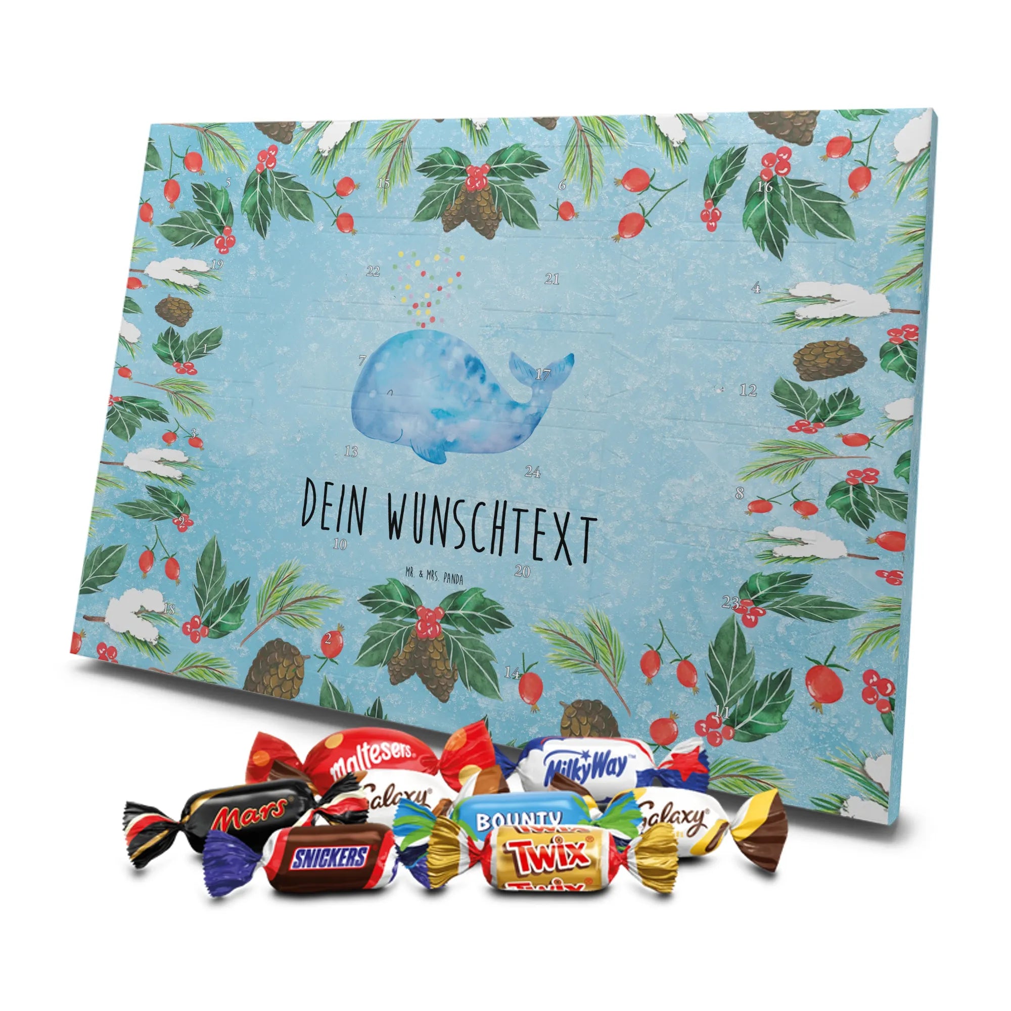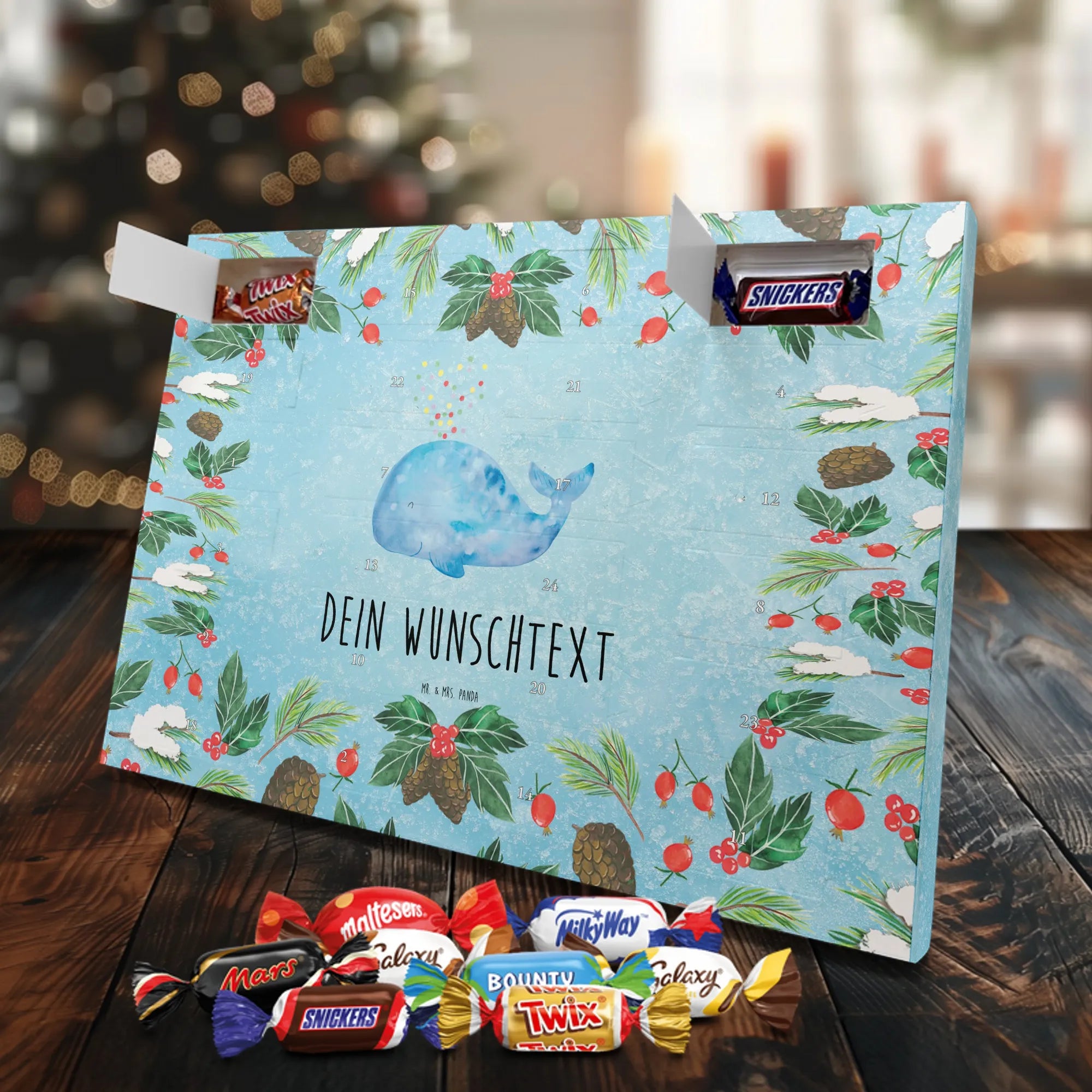 Schoko Adventskalender personalisiert von Mr. & Mrs. Panda – eine besonders liebevolle Geschenkidee für die Adventszeit. Unser Design vereint niedliche Illustrationen und herzliche Sprüche, die wir selbstverständlich mit deinem Wunschtext oder Namen personalisieren. Die brillante Druckqualität wird durch eine seidenmatte Oberflächenveredelung unterstrichen, die Farben und Details wunderschön zur Geltung bringt. Zusätzlich sind die Seitenflächen bedruckt, sodass das Motiv rundum stimmig ist. Du kannst den Kalender entweder aufhängen oder aufstellen – je nachdem, wo die Vorfreude am besten zur Geltung kommt. Gefüllt ist der Kalender mit Celebrations: 24 hochwertige Füllungen in 8 leckeren Sorten wie Maltesers, Mars, Snickers, Twix, Milky Way, Bounty, Galaxy und Galaxy Caramel sorgen für abwechslungsreiche Genussmomente. Maße: 325 mm x 225 mm x 27 mm – ein handliches Format, das trotzdem viel Platz für süße Überraschungen bietet. Ob als Geschenk für Freunde, Familie oder als kleine Verwöhnung für dich selbst: Dieser personalisierte Schoko Adventskalender bringt täglich Freude und ist mit ganz viel Herz gestaltet.
