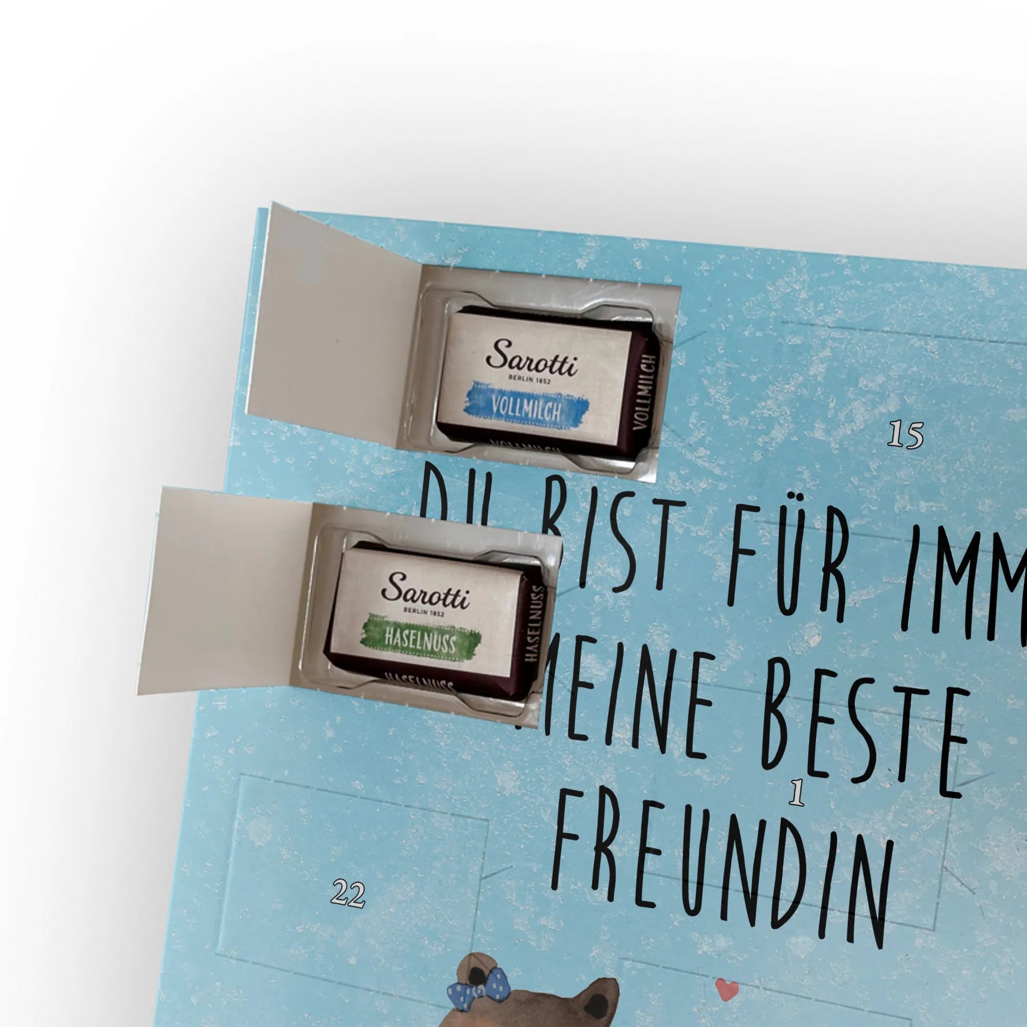 Personalisierter Schoko Foto Adventskalender Bär Freundin - Kinder Schokolade - Eisblau