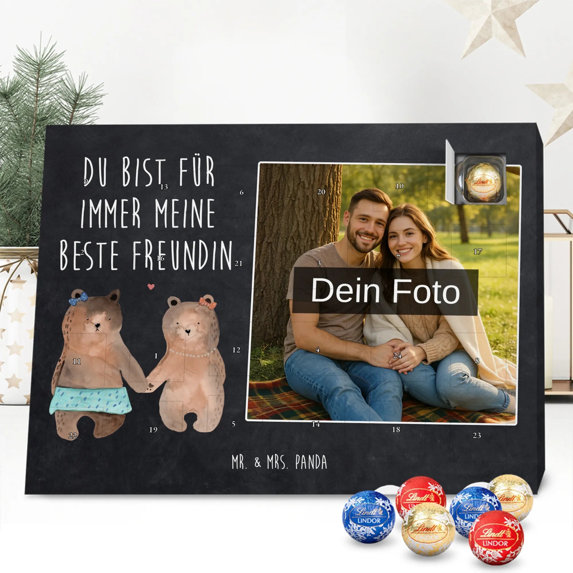 Entdecke unseren charmanten Personalisierter Schoko-Foto Adventskalender von Mr. & Mrs. Panda – ein liebevolles Geschenk für Freunde, Familie oder dich selbst. Aufdrucke mit süßen Motiven und herzlichen Sprüchen begleiten dein persönliches Foto, das du individuell hochlädst. Achte bitte auf eine ausreichende Auflösung des Bildes und einen passenden Bildausschnitt, damit das Druckbild klar bleibt. Wir weisen darauf hin, dass Fotos nicht nachbearbeitet oder zugeschnitten werden; achte daher auf Bildrechte und Zustimmung der abgebildeten Personen. Die Verarbeitung überzeugt durch eine seidenmatte Oberflächenveredelung und bedruckte Seitenflächen; dadurch wirkt der Kalender sehr hochwertig. Der Kalender ist vielseitig: Du kannst ihn sowohl aufstellen als auch aufhängen. Maße: 233 mm x 178 mm x 24 mm. Gefüllt mit Lindt Lindor Markenschokolade – 24 einzeln verpackte Markenschokoladen Kugeln in den Geschmacksrichtungen Vollmilch, Feinherb und Weiße Schokolade. Zutaten und Allergene sind auf der Verpackung angegeben; es kann Spuren von Haselnüssen und Mandeln geben. Hinweis: Personalisierte Foto-Artikel sind vom Umtausch ausgeschlossen.