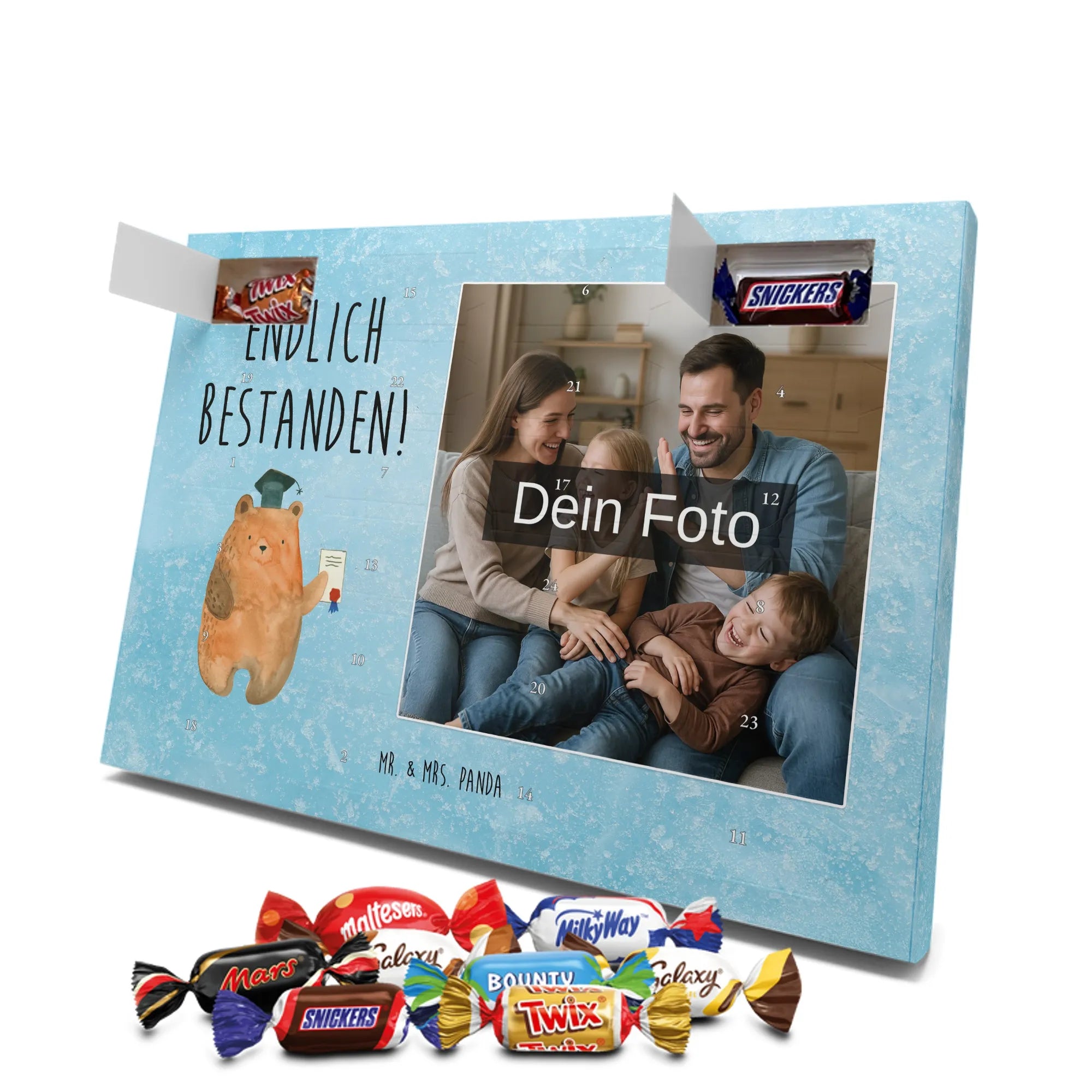 Liebevoller Foto Adventskalender personalisiert von Mr. & Mrs. Panda – der perfekte Begleiter durch die Adventszeit. Bedruckt mit unseren beliebten Motiven & Sprüchen, kannst du den Kalender mit einem persönlichen Foto versehen. Achte auf hohe Auflösung und einen passenden Bildausschnitt, damit das Motiv optimal zur Geltung kommt. Verwende nur Bilder, für die du die Rechte besitzt, um rechtliche Probleme zu vermeiden. Der Kalender bietet brillante Druckqualität, eine seidenmatte Oberflächenveredelung und bedruckte Seitenflächen. Maße: 233 mm x 178 mm x 24 mm. Besonderheit: Er lässt sich sowohl aufstellen als auch aufhängen. Bitte beachte: Die Fotos werden weder aufbereitet noch zugeschnitten, daher ist eine Rücknahme bei personalisierten Foto-Artikeln ausgeschlossen. Gefüllt mit MARKENNAMEN Schokolade und leckeren Schokoladenkugeln. Hinweis: Kann Spuren von Haselnüssen, Mandeln, Gluten und Soja enthalten. Kühl und trocken lagern. Schenke persönliche Vorfreude – jeden Tag ein kleines Highlight mit Schokolade und Erinnerungen.