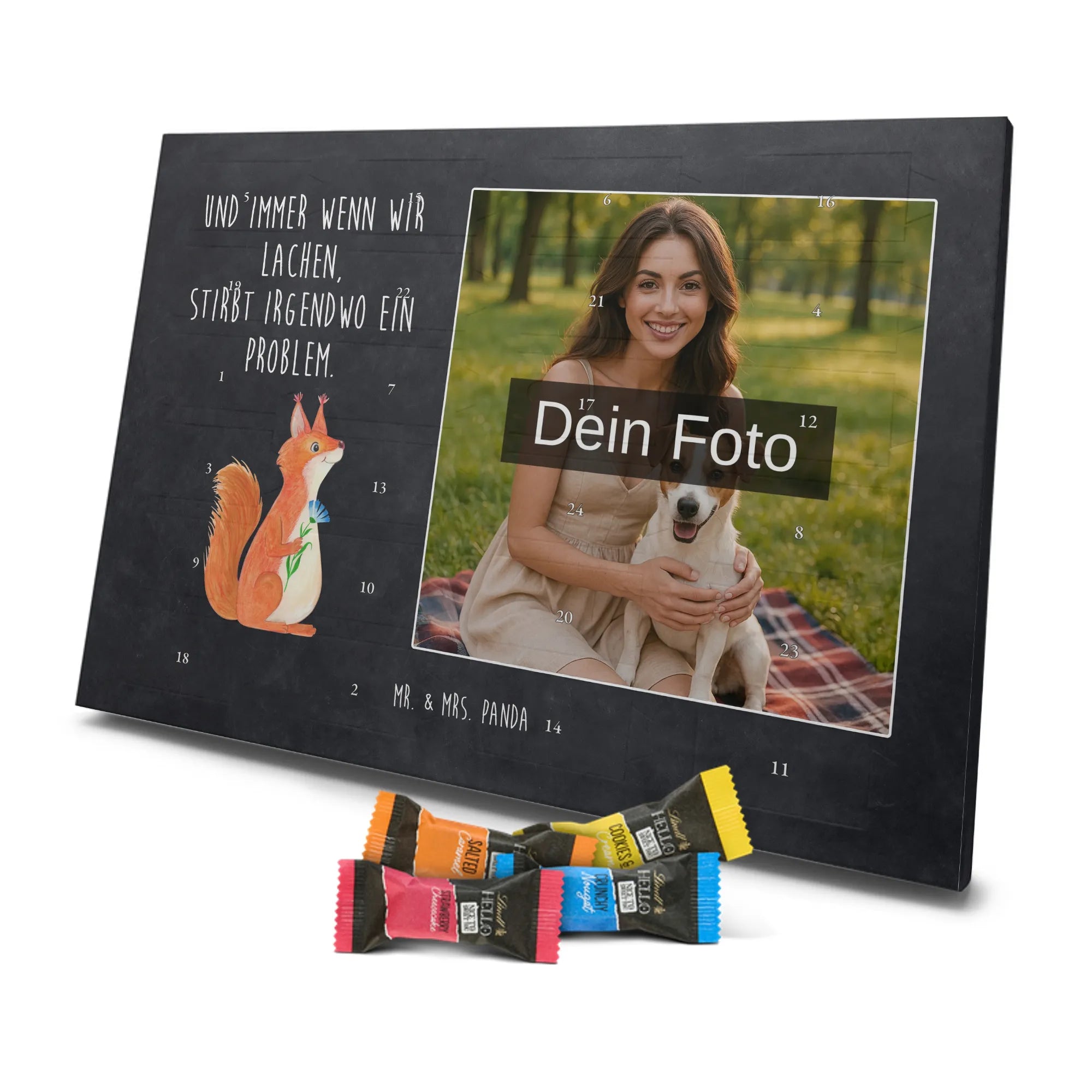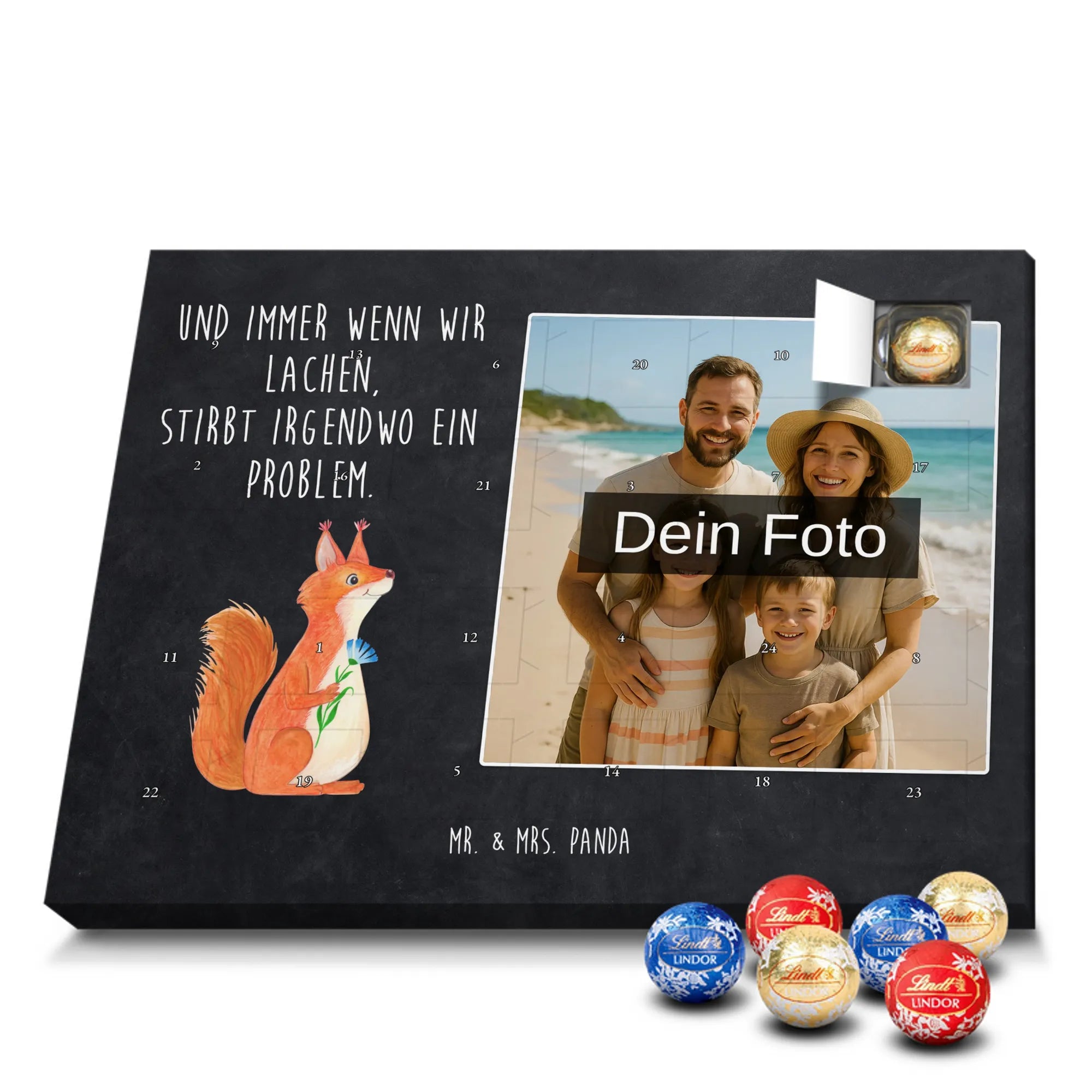 Unser bezaubernder Personalisierter Schokoladen Foto Adventskalender von Mr. & Mrs. Panda bringt persönliche Freude in die Vorweihnachtszeit. Du lädst ein Foto hoch, wir drucken es zusammen mit unseren liebevollen Illustrationen und Sprüchen – so entsteht ein ganz persönliches Geschenk. Achte auf hohe Bildqualität und darauf, dass der Bildausschnitt passt, denn wir nehmen keine Anpassungen am Foto vor. Die Verarbeitung ist hochwertig: seidenmatte Oberflächenveredelung, bedruckte Seitenflächen und eine stabile Konstruktion. Der Kalender kann sowohl aufgehängt als auch aufgestellt werden – flexibel und hübsch. Maße: 233 mm x 178 mm x 24 mm. Gefüllt mit Lindt Lindor Markenschokolade: 24 einzeln verpackte Markenschokoladen Kugeln, Sorten: Vollmilch, Feinherb und Weiße Schokolade. Zutatenhinweis: Zucker, pflanzliches Fett, Kakaobutter u.v.m.; kann Spuren von Haselnüssen und Mandeln enthalten. Wichtig: Lade nur Fotos hoch, für die du Nutzungsrechte hast; personalisierte Foto-Artikel sind vom Umtausch ausgeschlossen. Verschenke einen Advent mit Herz von Mr. & Mrs. Panda.