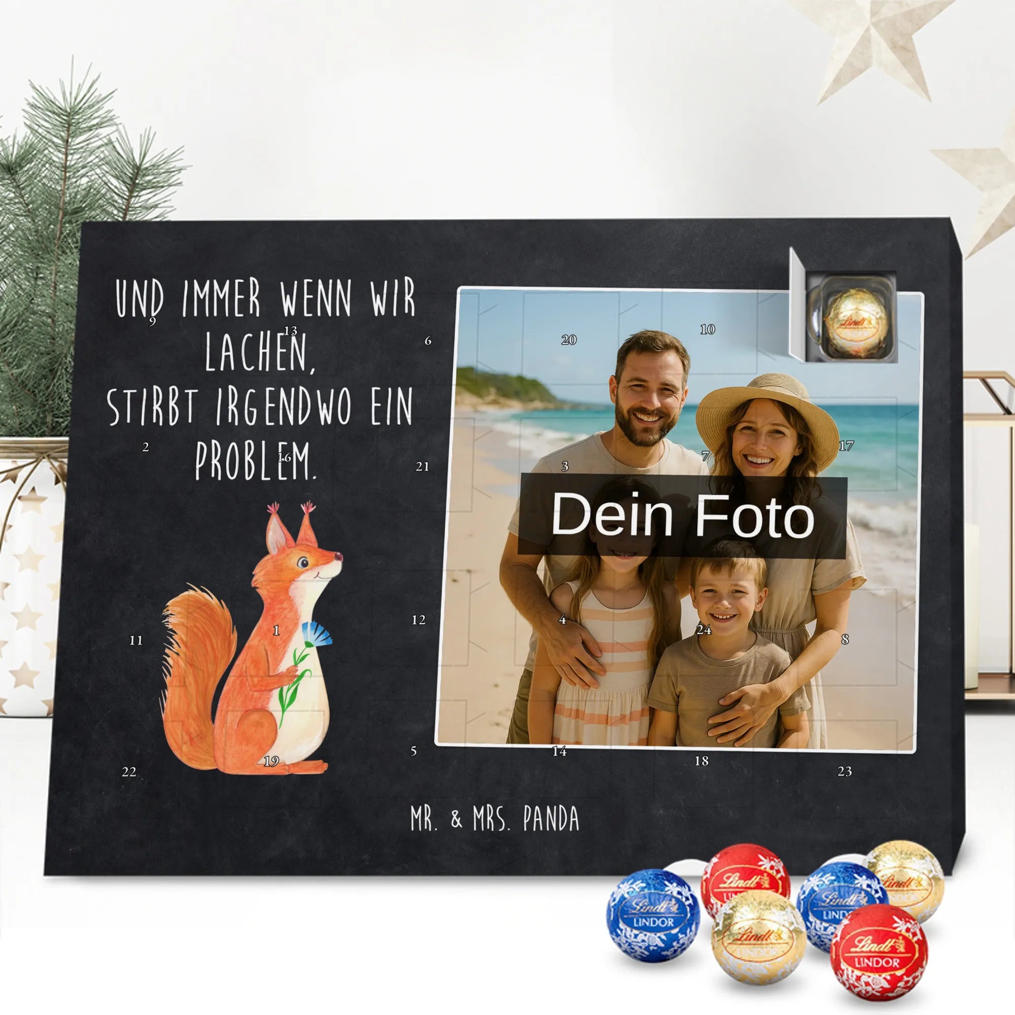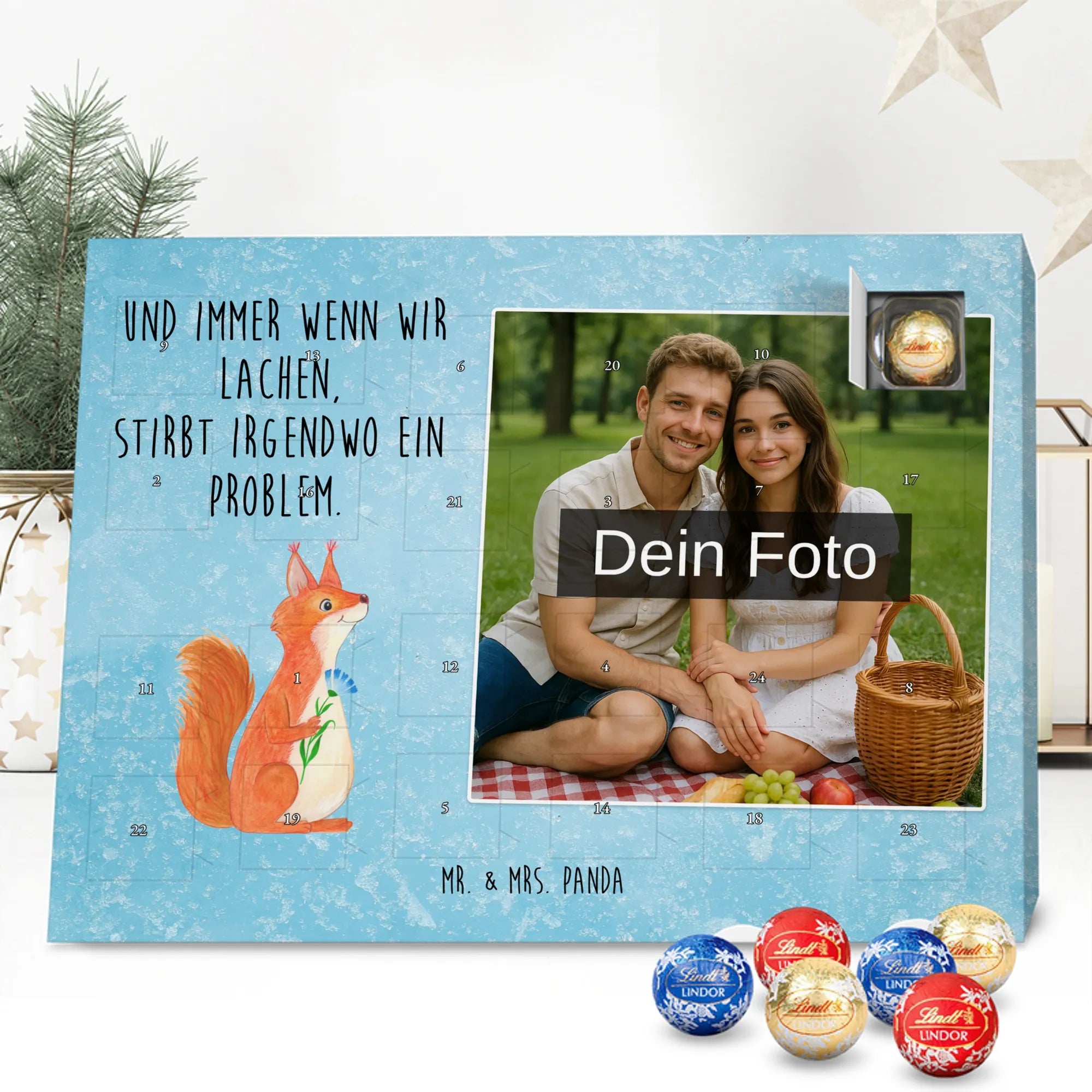 Mach die Adventszeit persönlich mit unserem Personalisiertes Schoko Foto-Adventskalender von Mr. & Mrs. Panda. Dieser Kalender kombiniert dein Lieblingsfoto mit unseren fröhlichen Illustrationen und liebevollen Sprüchen – perfekt als Geschenk für Partner, Familie oder Freunde. Für ein optimales Druckergebnis bitte ein hochauflösendes Bild verwenden und den Bildausschnitt so wählen, dass wichtige Details nicht verloren gehen. Beachte, dass wir Fotos nicht nachbearbeiten oder zuschneiden; lade nur Bilder hoch, für die du die Rechte besitzt. Die hochwertige Verarbeitung beinhaltet eine seidenmatte Oberflächenveredelung und bedruckte Seitenflächen, außerdem ist der Kalender robust und kann aufgehängt oder aufgestellt werden. Maße: 233 mm x 178 mm x 24 mm. Gefüllt mit Lindt Lindor Markenschokolade: 24 einzeln verpackte Kugeln in den Sorten Vollmilch, Feinherb und Weiße Schokolade. Inhaltsstoffe und Allergene sind angegeben; es kann Haselnüsse und Mandeln enthalten. Hinweis: Personalisierte Foto-Artikel sind vom Umtausch ausgeschlossen. Ein süßer, persönlicher Adventsgruß von Mr. & Mrs. Panda.