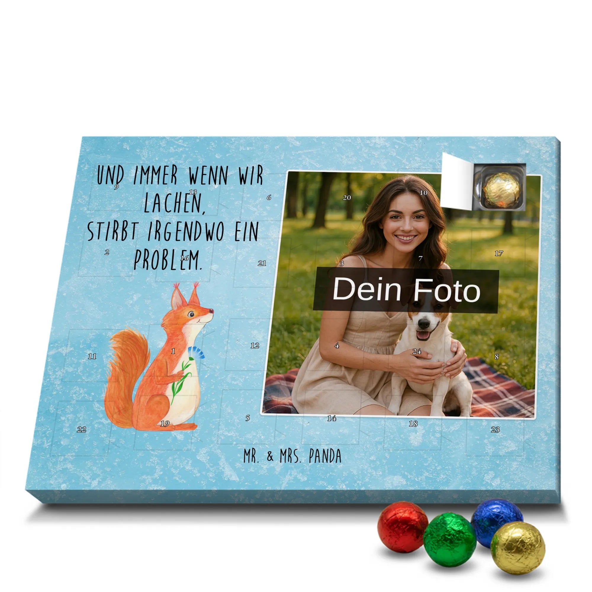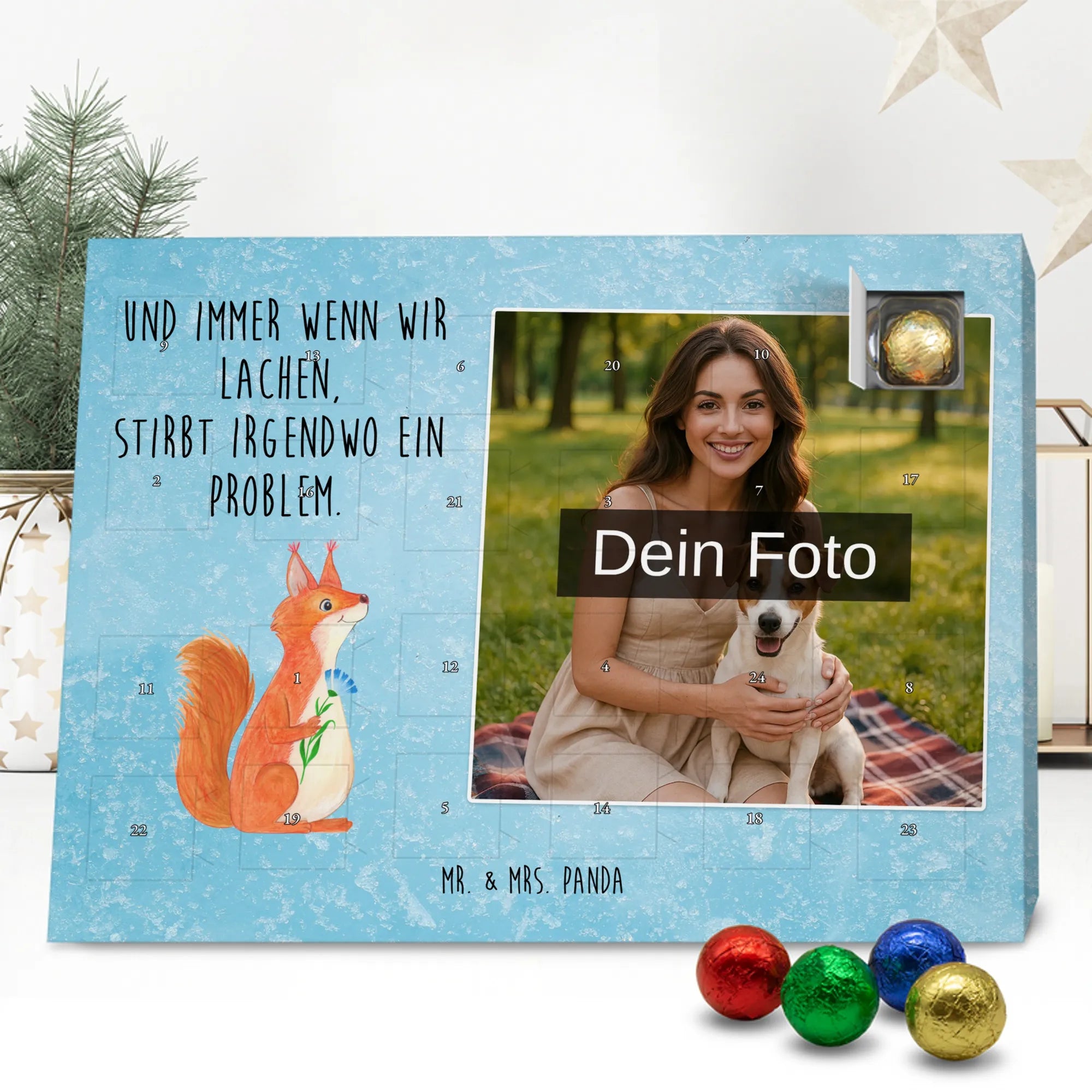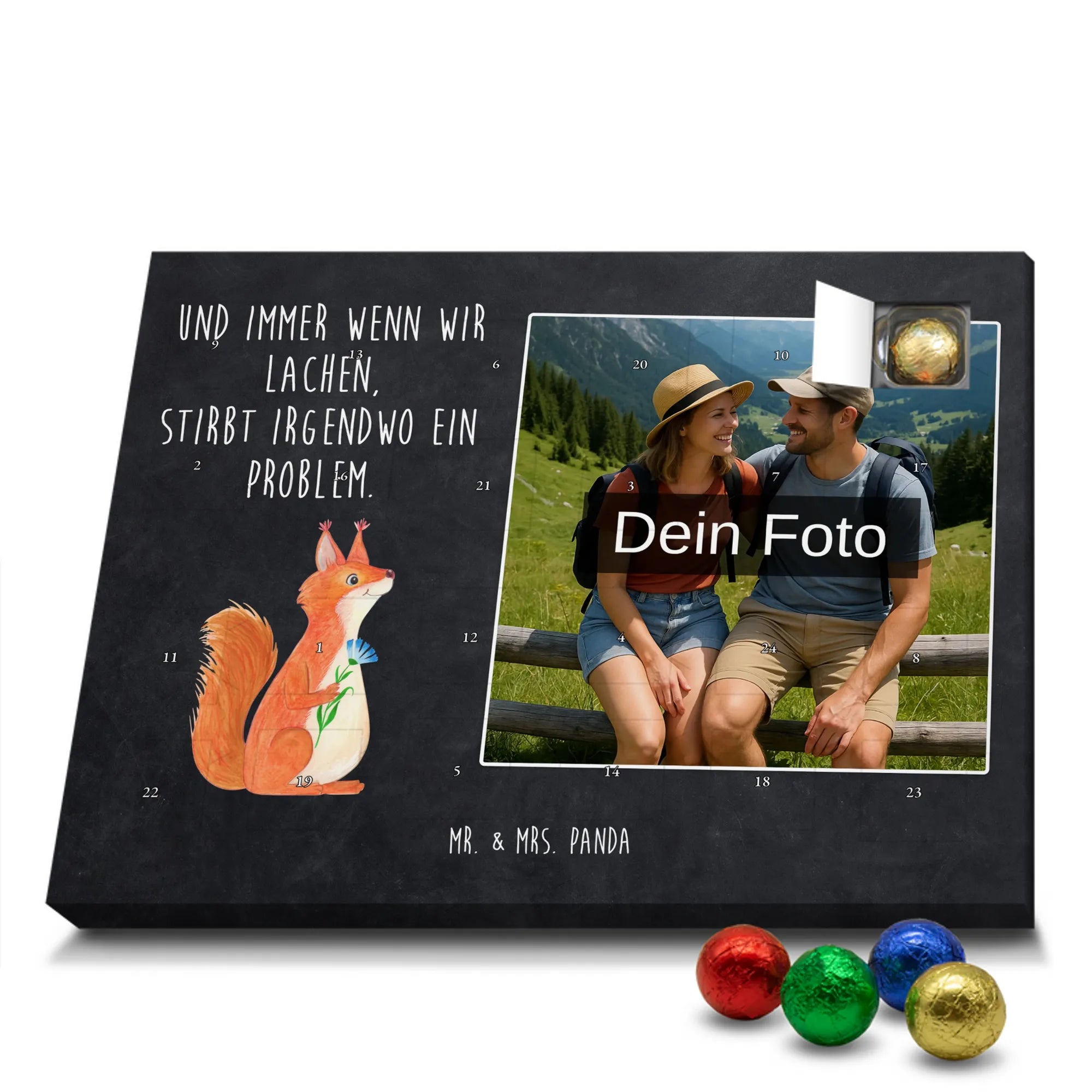 Liebevoller Foto Adventskalender personalisiert von Mr. & Mrs. Panda – der perfekte Begleiter durch die Adventszeit. Bedruckt mit unseren beliebten Motiven & Sprüchen, kannst du den Kalender mit einem persönlichen Foto versehen. Achte auf hohe Auflösung und einen passenden Bildausschnitt, damit das Motiv optimal zur Geltung kommt. Verwende nur Bilder, für die du die Rechte besitzt, um rechtliche Probleme zu vermeiden. Der Kalender bietet brillante Druckqualität, eine seidenmatte Oberflächenveredelung und bedruckte Seitenflächen. Maße: 233 mm x 178 mm x 24 mm. Besonderheit: Er lässt sich sowohl aufstellen als auch aufhängen. Bitte beachte: Die Fotos werden weder aufbereitet noch zugeschnitten, daher ist eine Rücknahme bei personalisierten Foto-Artikeln ausgeschlossen. Gefüllt mit MARKENNAMEN Schokolade und leckeren Schokoladenkugeln. Hinweis: Kann Spuren von Haselnüssen, Mandeln, Gluten und Soja enthalten. Kühl und trocken lagern. Schenke persönliche Vorfreude – jeden Tag ein kleines Highlight mit Schokolade und Erinnerungen.