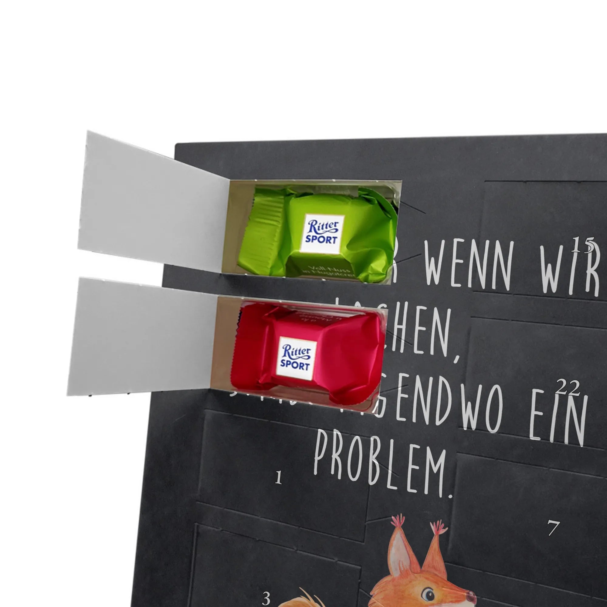 Foto-Adventskalender mit Schokolade von Mr. & Mrs. Panda – personalisiere den Advent mit deinem Lieblingsfoto und unseren liebevollen Motiven & Sprüchen. Dieser Kalender ist ideal, wenn du etwas Persönliches schenken willst: Einfach Foto hochladen, auf hohe Auflösung achten und den passenden Bildausschnitt wählen. Denk daran, nur Bilder zu verwenden, bei denen du die Bildrechte besitzt. Fotos werden nicht nachbearbeitet oder zugeschnitten; Rücknahme bei personalisierten Foto Artikeln ist ausgeschlossen. Die Druckqualität ist brillant, mit seidenmatter Oberflächenveredelung und bedruckten Seitenflächen für ein hochwertiges Erscheinungsbild. Maße: 325 mm x 225 mm x 27 mm. Besonderheit: Du kannst den Kalender sowohl aufhängen als auch aufstellen. Gefüllt ist er mit Ritter Sport Schokowürfeln – köstliche Sorten wie Mousse au Chocolat, Schoko Crisp, Voll-Nuss in Nougatcreme, Karamell Duo, Joghurt und Erdbeer-Joghurt warten hinter den Türchen. Ein liebevoll gestaltetes Geschenk, das Erinnerungen und Genuss verbindet und die Vorfreude auf Weihnachten jeden Tag versüßt.