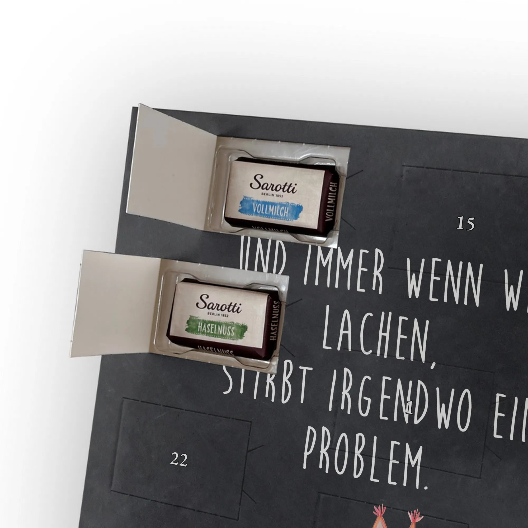 Schoko Foto Adventskalender personalisiert – ein zauberhaftes Geschenk, das Erinnerungen und Geschmack vereint. Mr. & Mrs. Panda haben liebevolle Motive und Sprüche gestaltet, die den Kalender umrahmen; dein Foto setzt die persönliche Note. Für ein optimales Druckbild lade bitte ein Foto mit hoher Auflösung hoch und achte auf einen passenden Bildausschnitt, damit wichtige Details nicht abgeschnitten werden. Bitte nur Bilder verwenden, für die du die Rechte besitzt. Die seidenmatte Oberflächenveredelung sorgt für edle Haptik und die bedruckten Seitenflächen für ein rundum gelungenes Design. Maße: 355 mm x 245 mm x 11 mm – kann aufgehängt oder aufgestellt werden. Wichtiger Hinweis: Wir bearbeiten oder schneiden die Fotos nicht nach; eine Rücknahme personalisierter Foto Artikel ist ausgeschlossen. Gefüllt mit 24 einzeln verpackten Schokoladentäfelchen in den Geschmacksrichtungen Vollmilch, Nougat, Zartbitter und Haselnuss von Sarotti® und Confiserie Heidel®. Insgesamt enthält der Kalender 107 g Markenschokolade. Ideal als Geschenk für Partner, Familie oder Freunde – persönlich, süß und liebevoll verpackt von Mr. & Mrs. Panda.