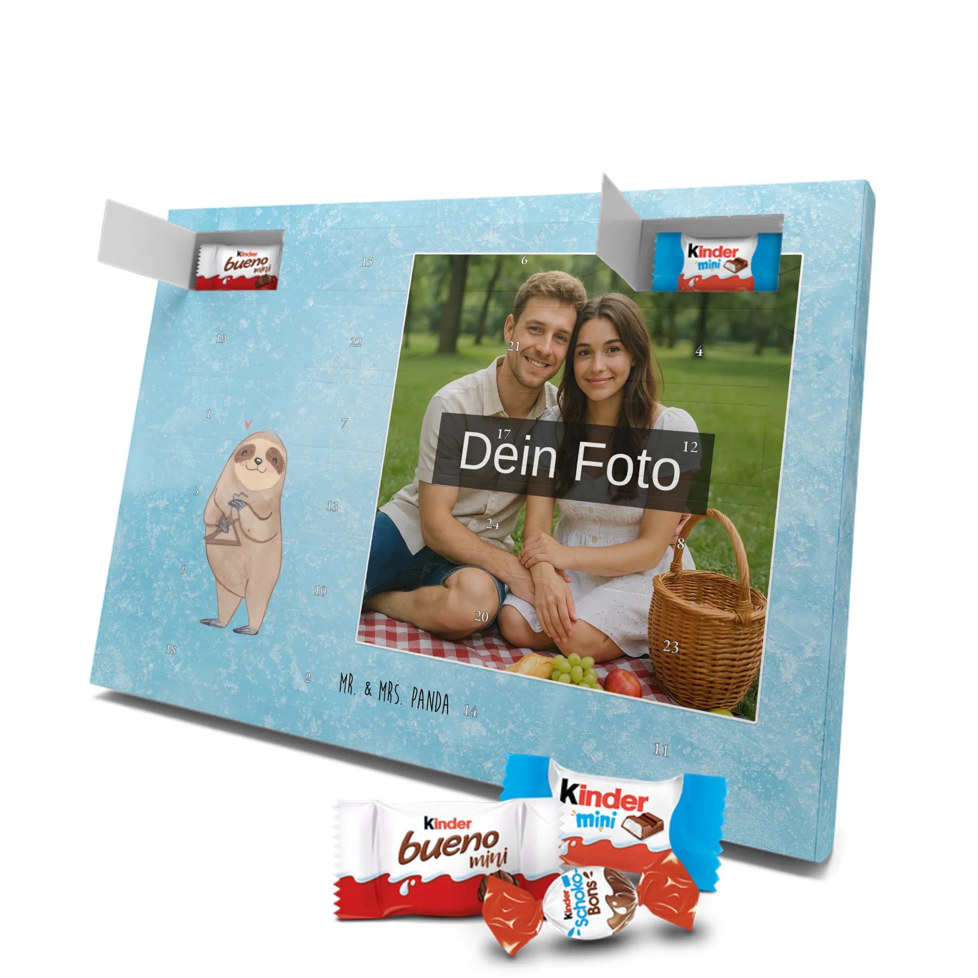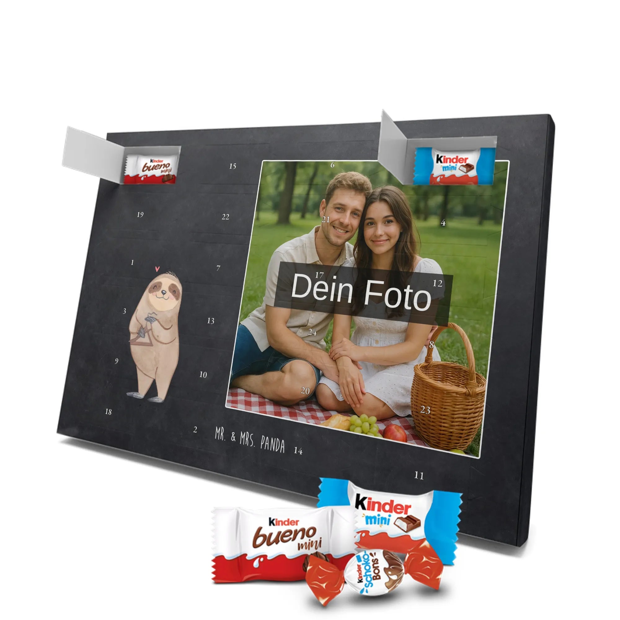 🐼 Personalisierter Schoko-Foto-Adventskalender mit deinem Bild, Mr. & Mrs. Panda Motiven und gefüllt mit kinder® Schokolade.
