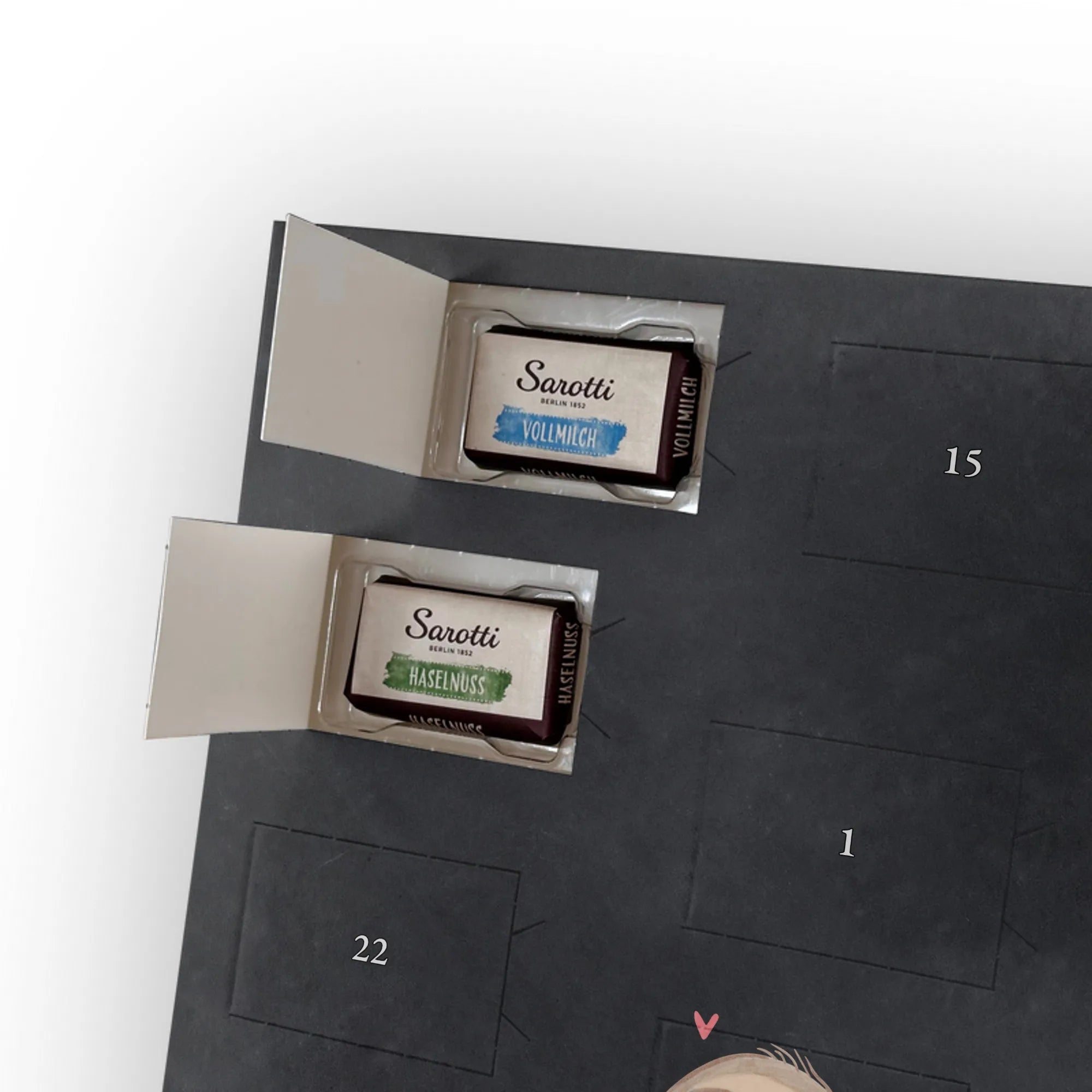 🐼 LECKERE FÜLLUNG: 24 Täfelchen, 107 g Markenschokolade (Sarotti® & Confiserie Heidel®) in vier Sorten.