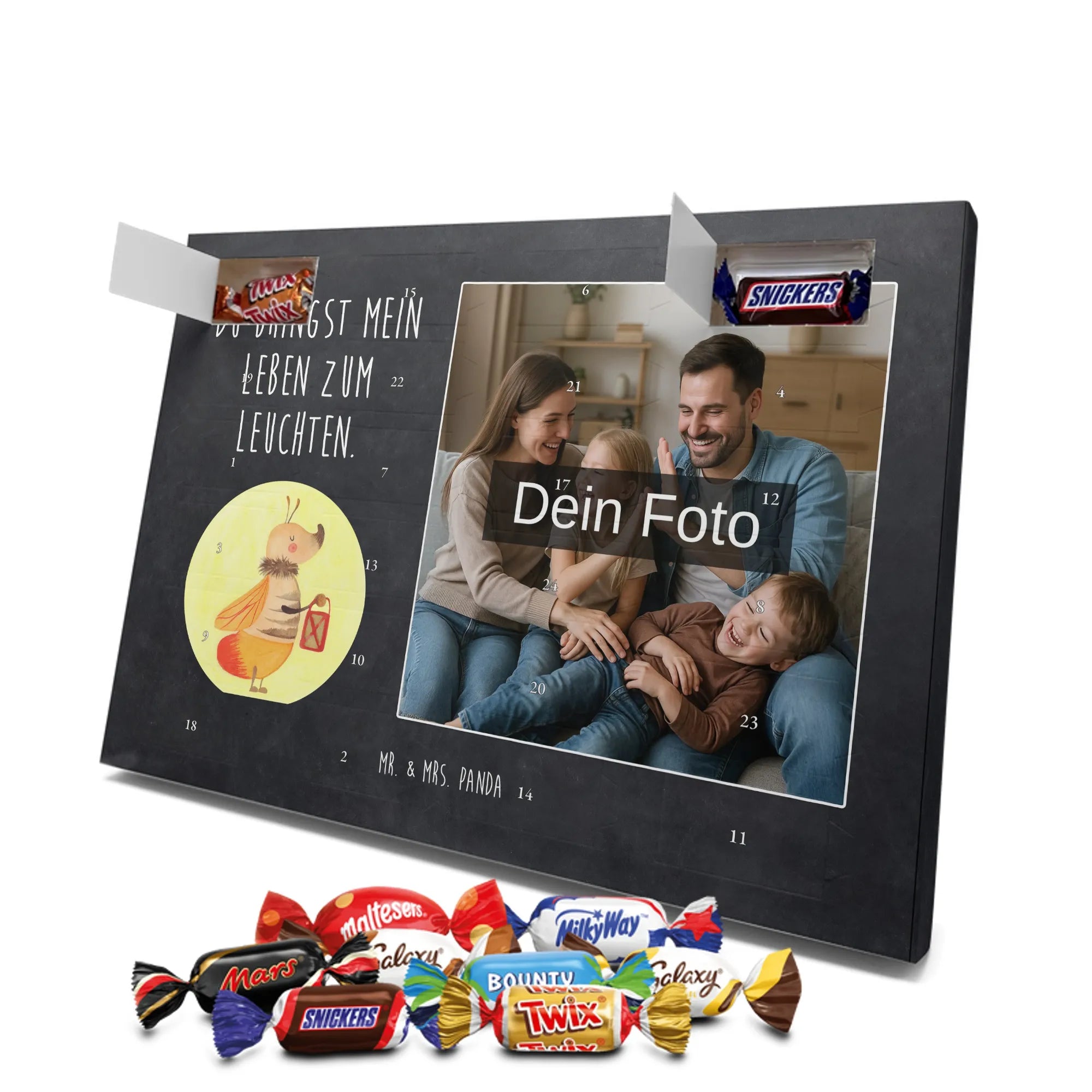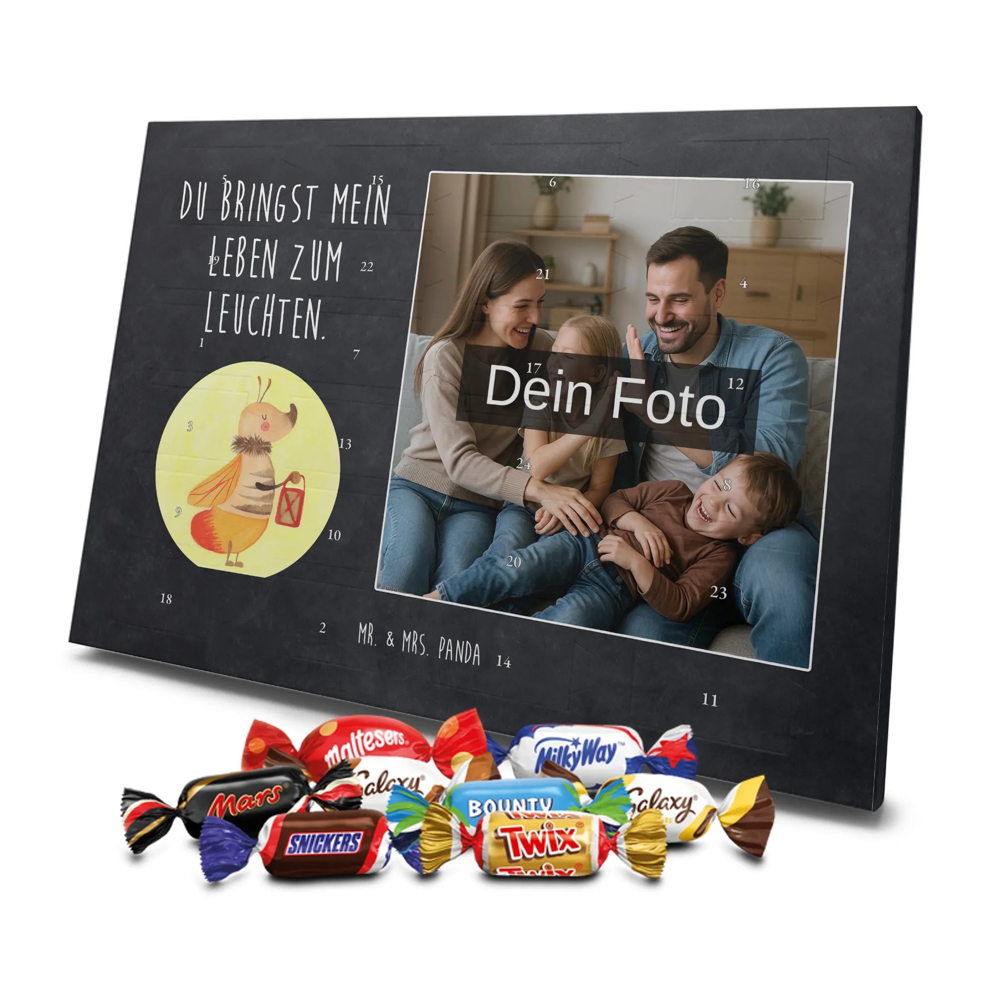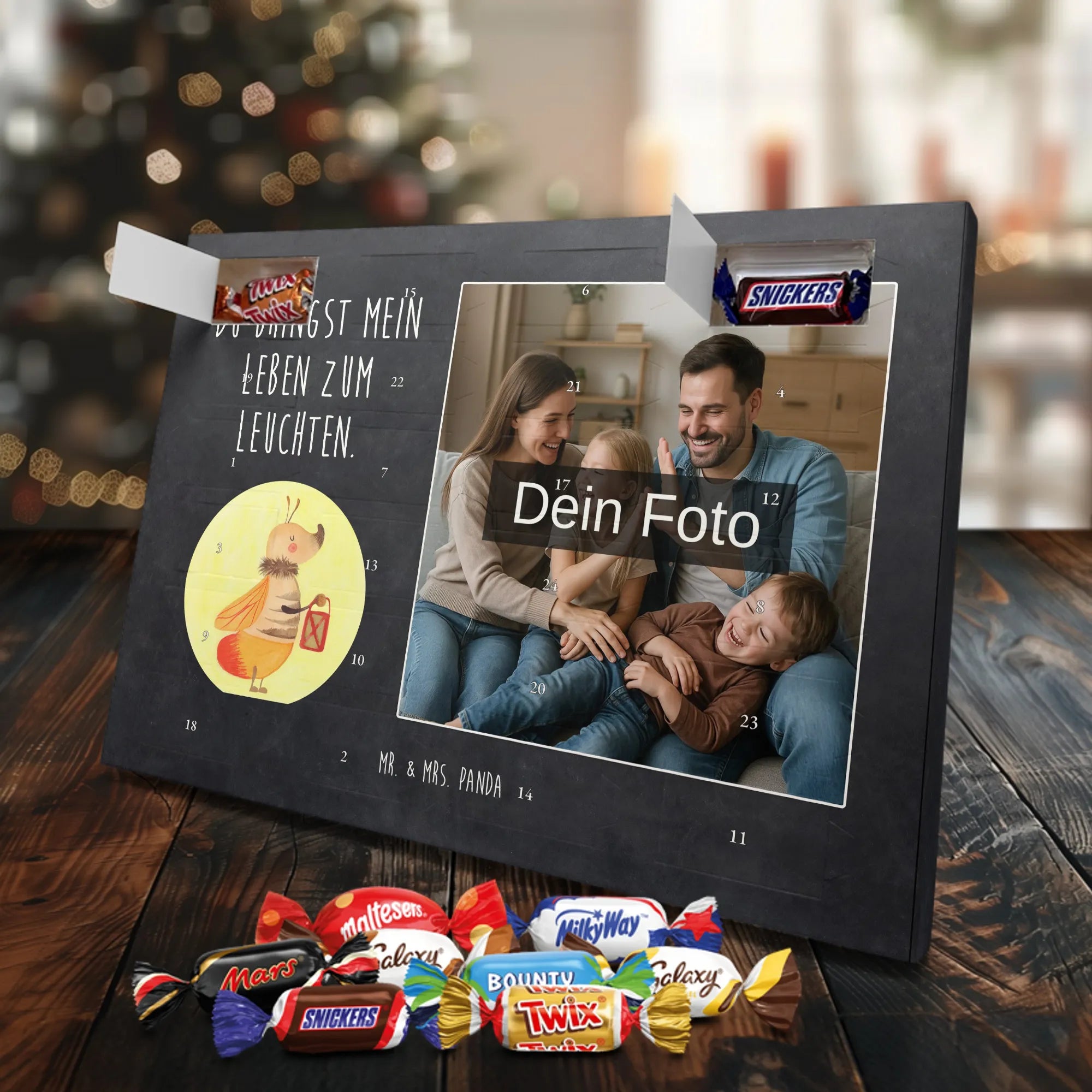 Lustiger Personalisierter Schoko Foto-Adventskalender – das Must-have für eine persönliche Adventszeit von Mr. & Mrs. Panda. Jeder Kalender wird mit unseren charmanten Illustrationen und liebevollen Sprüchen bedruckt, während dein Foto die Vorderseite einzigartig macht. Achte bitte darauf, ein Foto mit guter Qualität und ausreichend hoher Auflösung hochzuladen, damit der Druck gestochen scharf wirkt. Überprüfe den Bildausschnitt, damit wichtige Bereiche nicht verloren gehen. Denk daran, nur Bilder zu verwenden, bei denen du die nötigen Rechte besitzt. Die Verarbeitung ist hochwertig: brillante Druckqualität mit seidenmatter Oberflächenveredelung und bedruckten Seitenflächen. Maße: 325 mm x 225 mm x 27 mm. Du kannst den Kalender aufhängen oder aufstellen – sehr praktisch. Hinweis: Die hochgeladenen Fotos werden nicht nachbearbeitet oder zugeschnitten; Rücknahme bei personalisierten Foto-Artikeln ist ausgeschlossen. Gefüllt ist der Kalender mit Celebrations Schokolade – 24 Stück in 8 verschiedenen Sorten (Maltesers, Mars, Snickers, Twix, Milky Way, Bounty, Galaxy, Galaxy Caramel). Verschenke ein Stück persönlich gestaltete Vorfreude und mache jeden Dezembertag zu etwas Besonderem.