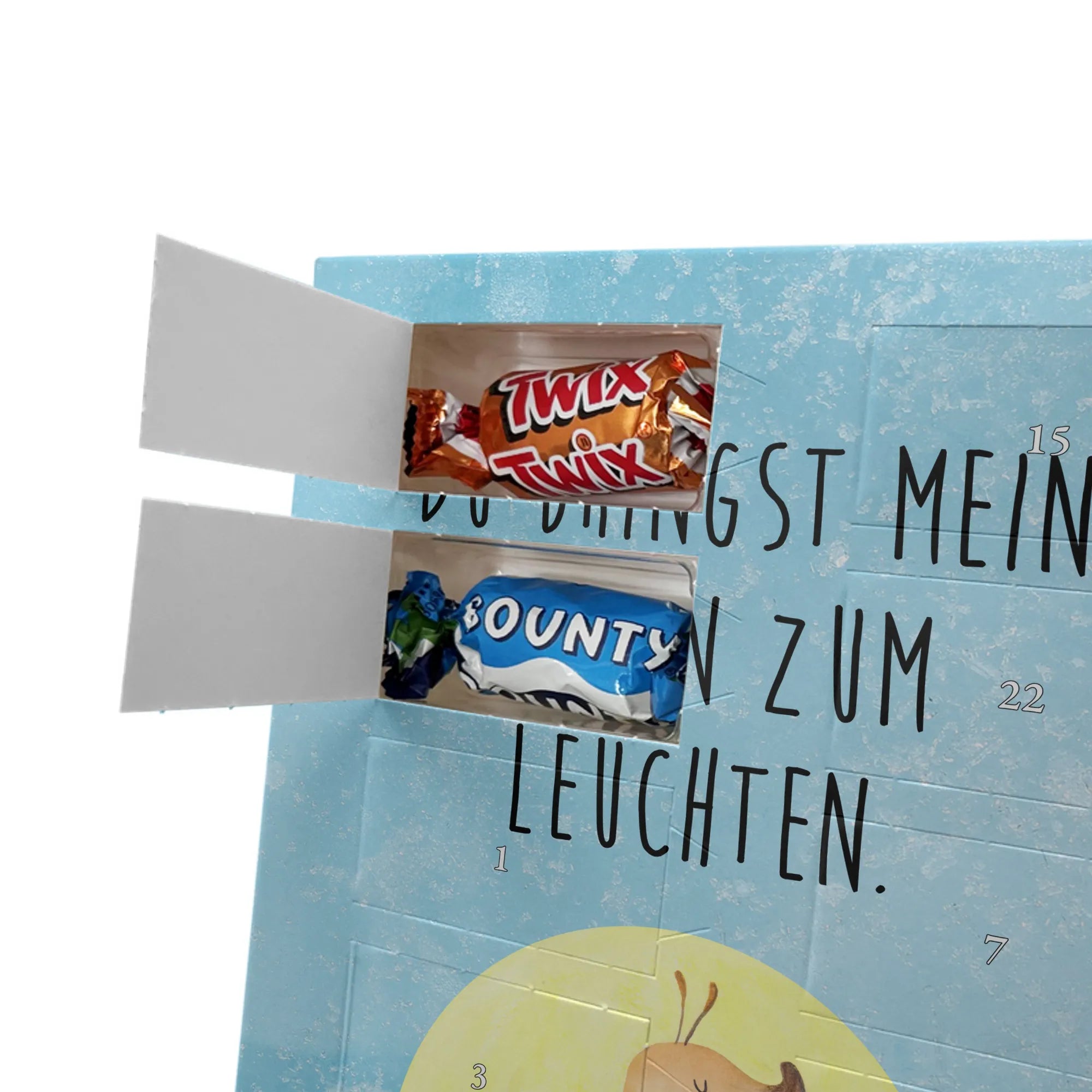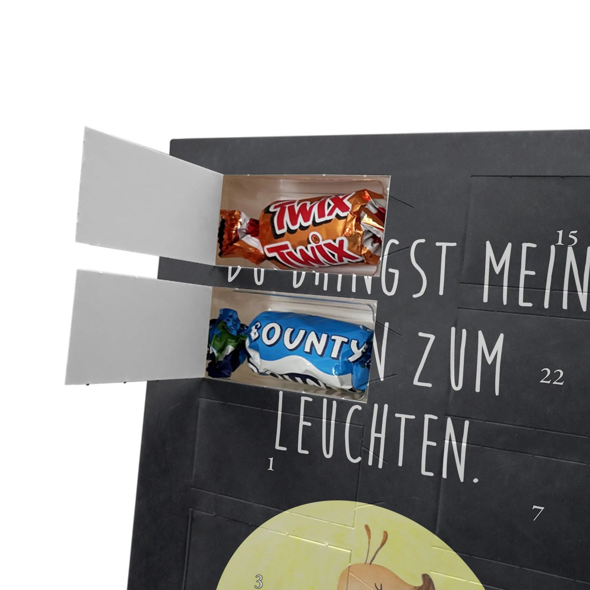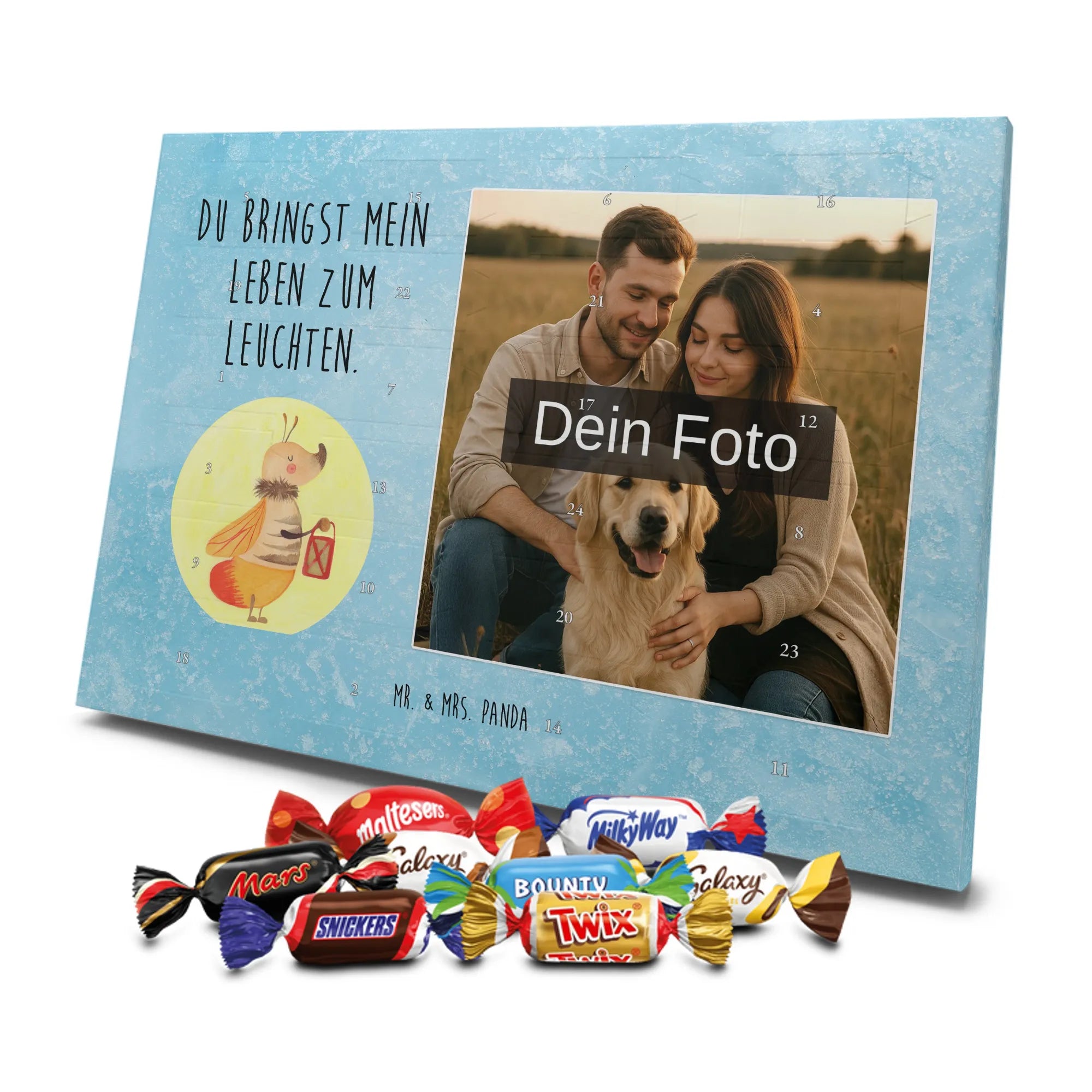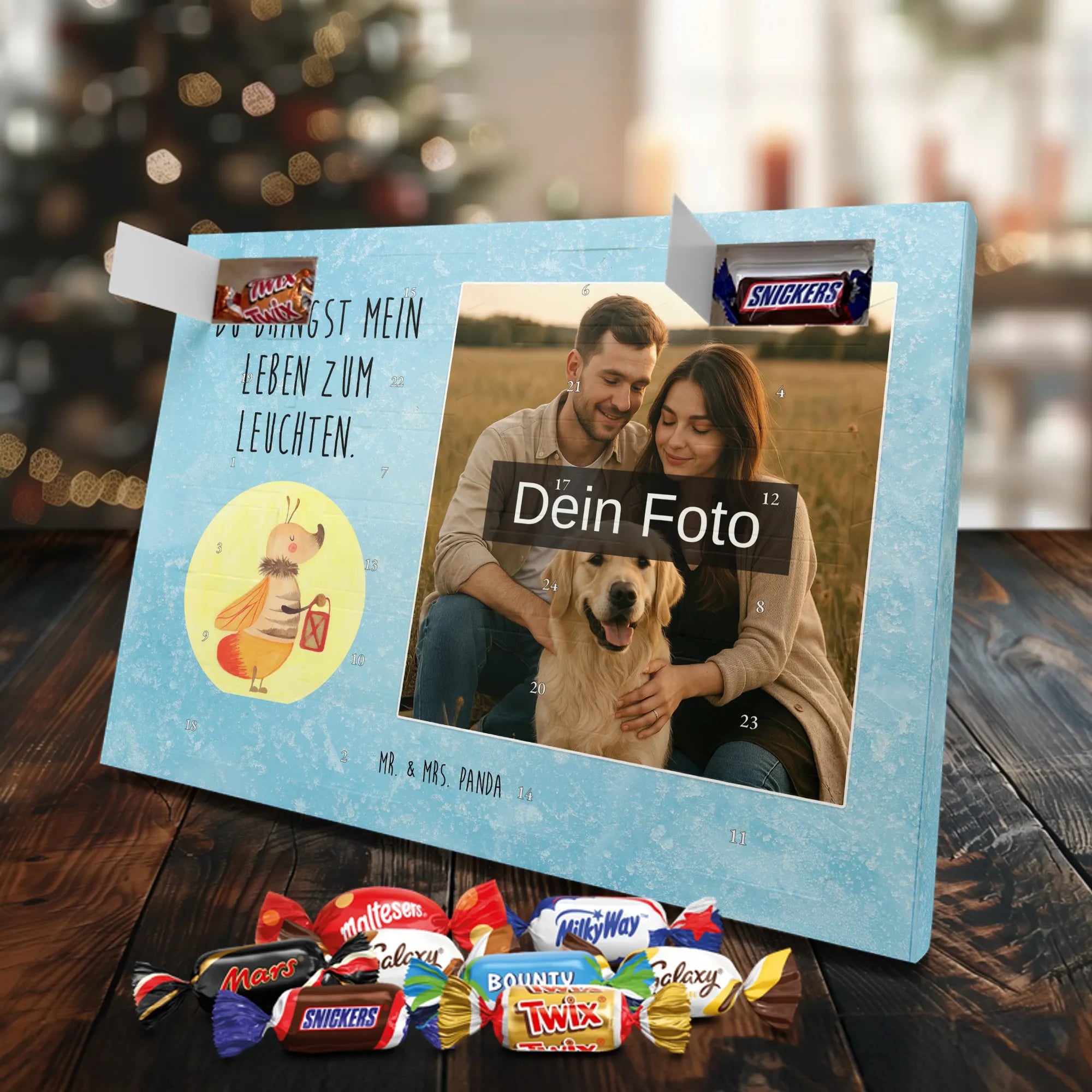 Lustiger Personalisierter Schoko Foto-Adventskalender – das Must-have für eine persönliche Adventszeit von Mr. & Mrs. Panda. Jeder Kalender wird mit unseren charmanten Illustrationen und liebevollen Sprüchen bedruckt, während dein Foto die Vorderseite einzigartig macht. Achte bitte darauf, ein Foto mit guter Qualität und ausreichend hoher Auflösung hochzuladen, damit der Druck gestochen scharf wirkt. Überprüfe den Bildausschnitt, damit wichtige Bereiche nicht verloren gehen. Denk daran, nur Bilder zu verwenden, bei denen du die nötigen Rechte besitzt. Die Verarbeitung ist hochwertig: brillante Druckqualität mit seidenmatter Oberflächenveredelung und bedruckten Seitenflächen. Maße: 325 mm x 225 mm x 27 mm. Du kannst den Kalender aufhängen oder aufstellen – sehr praktisch. Hinweis: Die hochgeladenen Fotos werden nicht nachbearbeitet oder zugeschnitten; Rücknahme bei personalisierten Foto-Artikeln ist ausgeschlossen. Gefüllt ist der Kalender mit Celebrations Schokolade – 24 Stück in 8 verschiedenen Sorten (Maltesers, Mars, Snickers, Twix, Milky Way, Bounty, Galaxy, Galaxy Caramel). Verschenke ein Stück persönlich gestaltete Vorfreude und mache jeden Dezembertag zu etwas Besonderem.