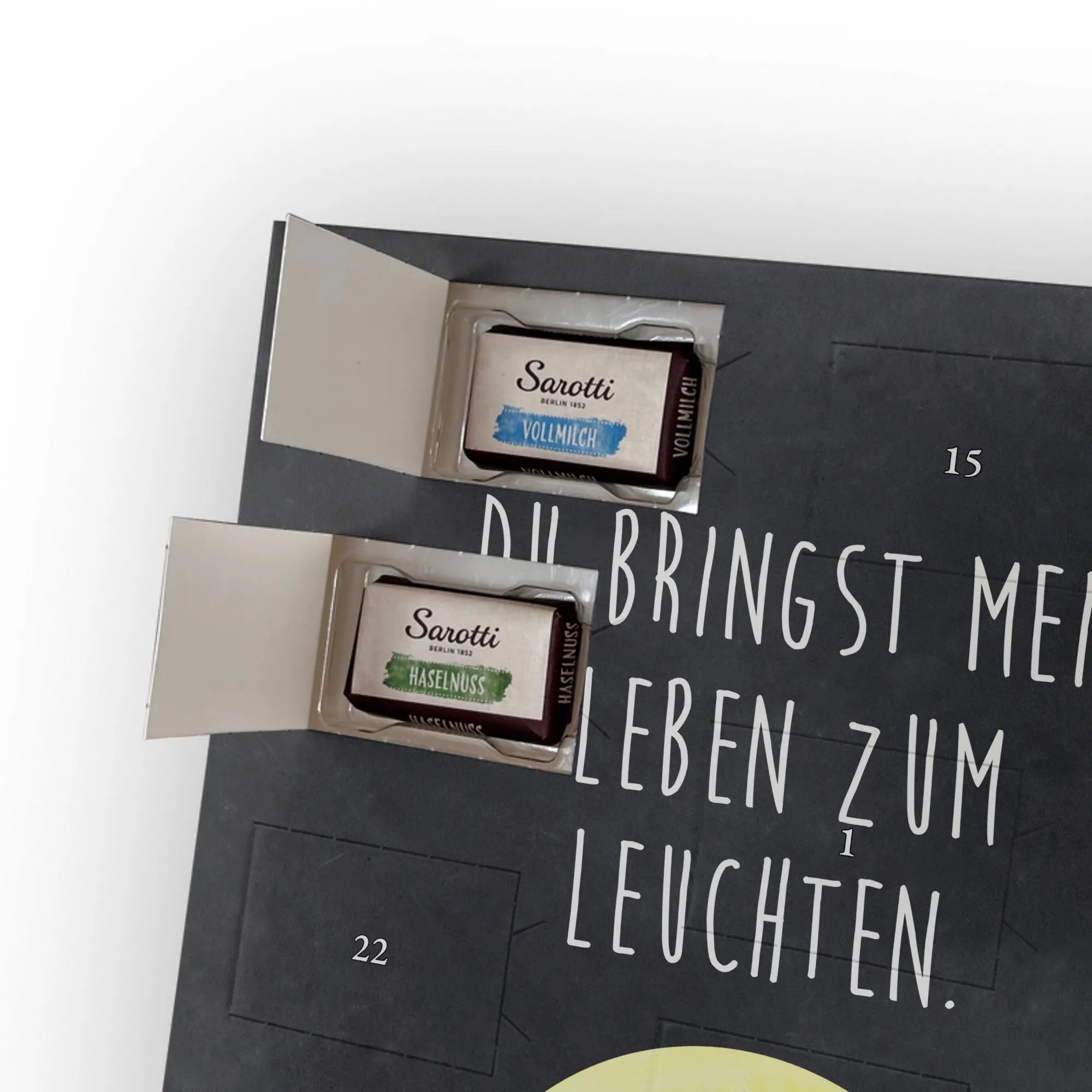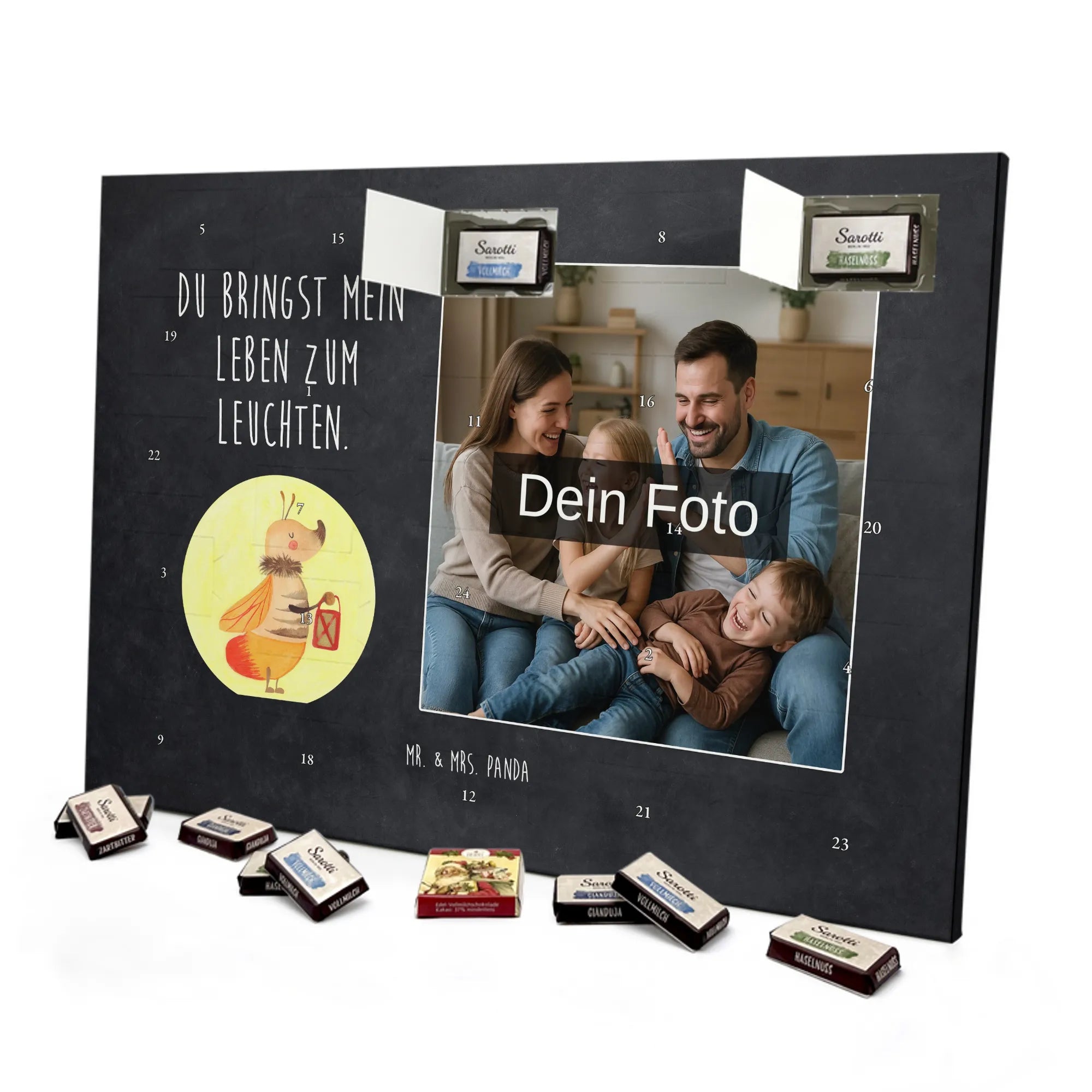 Personalisierter Schoko-Adventskalender mit Foto – das kleine Weihnachtswunder von Mr. & Mrs. Panda! Verschenke jeden Tag Vorfreude: Der Kalender ist liebevoll gestaltet mit unseren herzlichen Illustrationen und Sprüchen, während dein Foto die persönliche Mitte bildet. Bitte lade ein hochauflösendes Foto hoch und prüfe den Bildausschnitt, damit nichts Wichtiges verloren geht. Nutze nur Bilder, für die du die Rechte hast. Die hochwertige, seidenmatte Veredelung und die bedruckten Seitenflächen garantieren ein edles Erscheinungsbild. Maße: 355 mm x 245 mm x 11 mm; lässt sich sowohl aufhängen als auch aufstellen. Achtung: Fotos werden nicht nachbearbeitet oder zugeschnitten; personalisierte Artikel sind vom Rückgaberecht ausgeschlossen. Gefüllt mit 24 einzeln verpackten Schokoladentäfelchen aus den vier Geschmacksrichtungen Vollmilch, Nougat, Zartbitter und Haselnuss – von Sarotti® und Confiserie Heidel®. Insgesamt enthält der Kalender 107 g Markenschokolade. Ein persönliches Geschenk mit süßem Inhalt, ideal für Partner, Familie und Freunde, verpackt mit der typischen Mr. & Mrs. Panda Liebe zum Detail.
