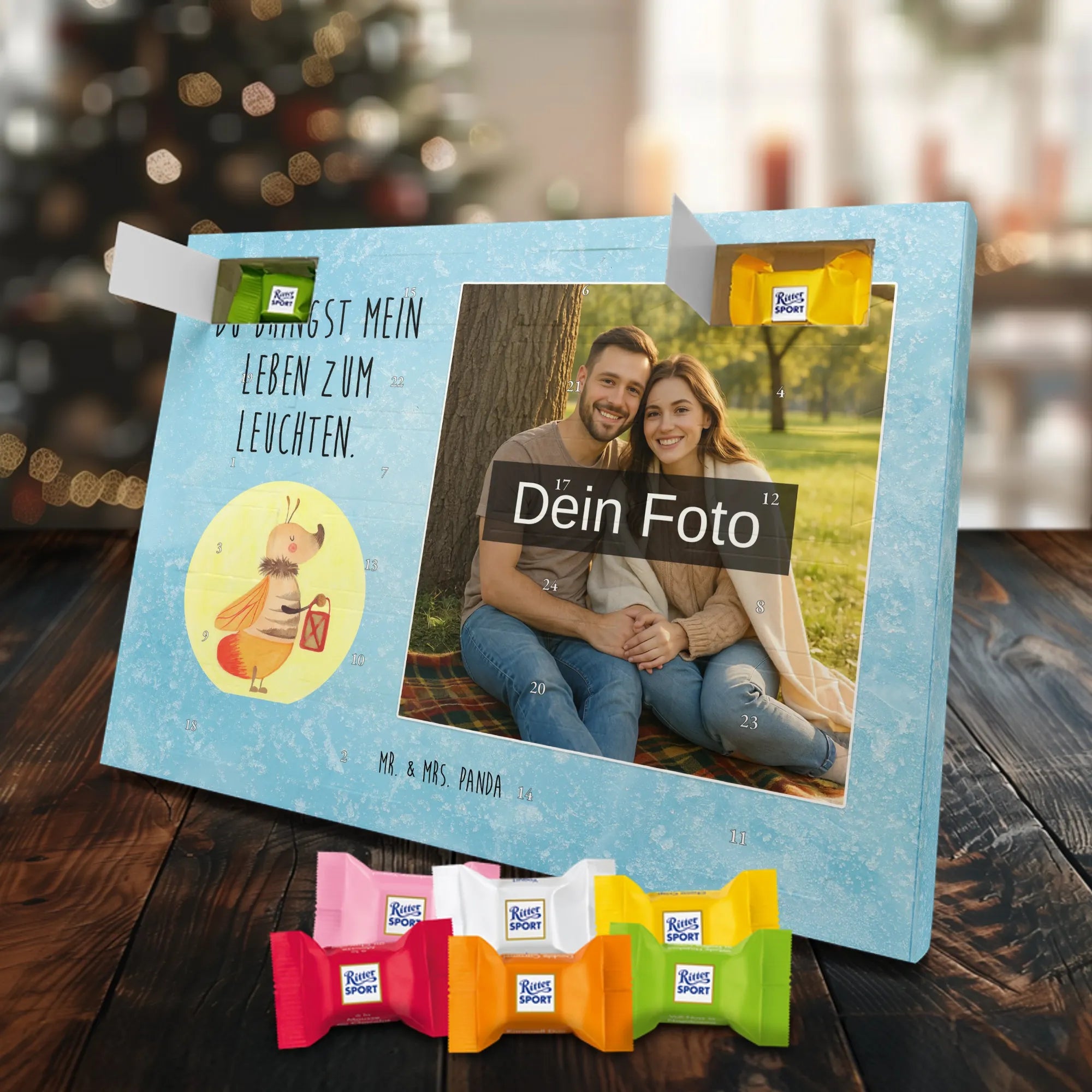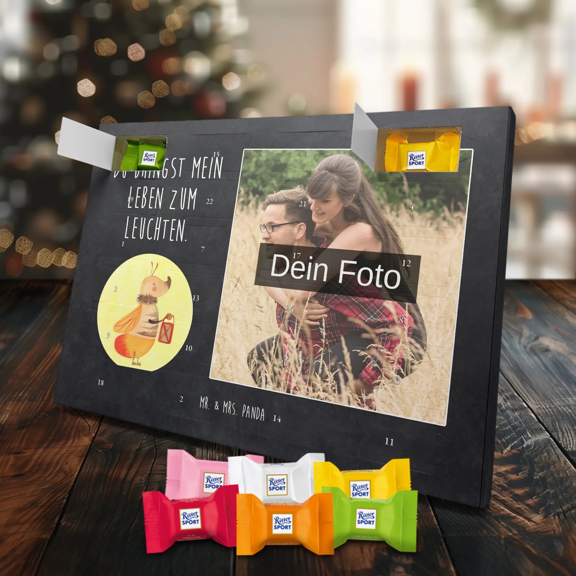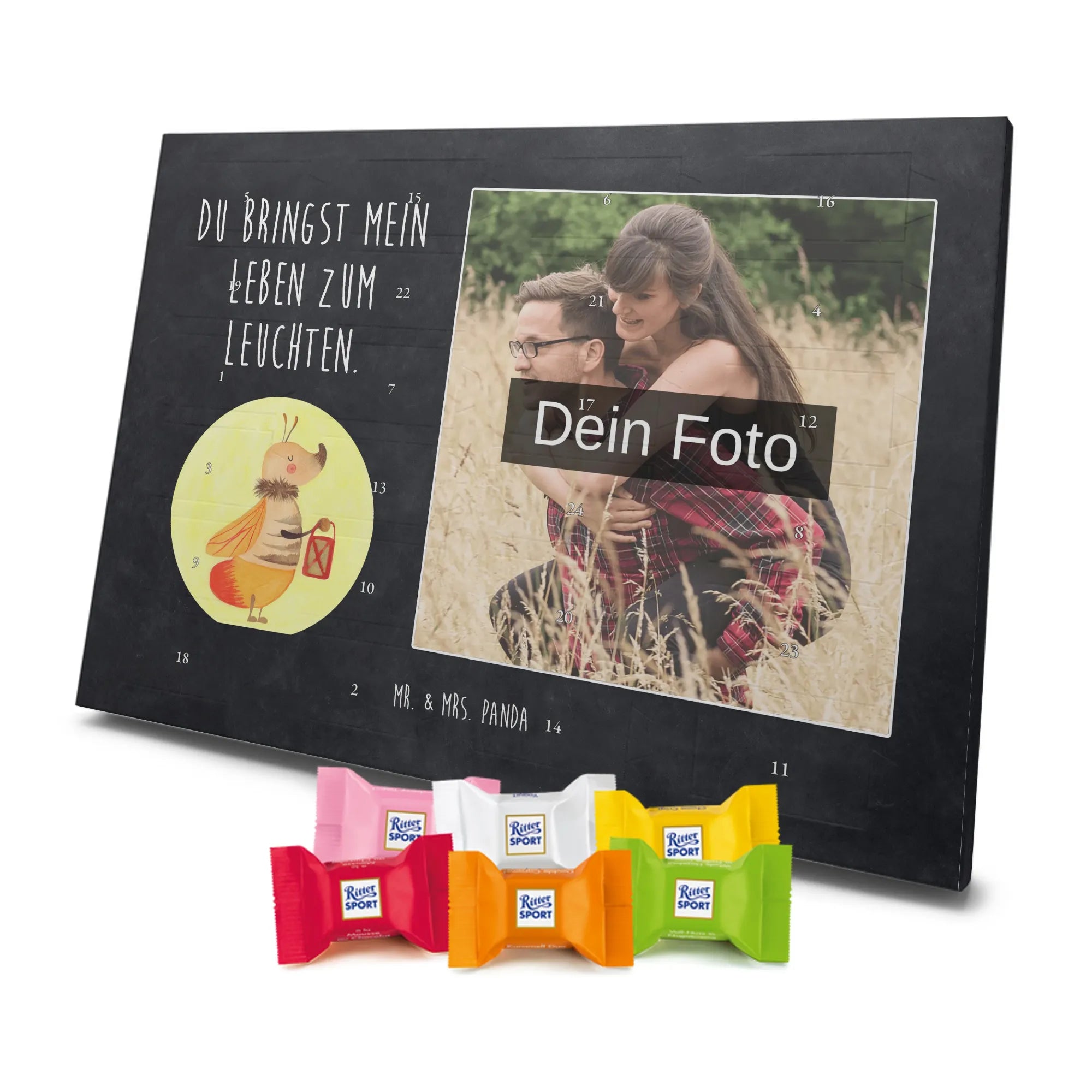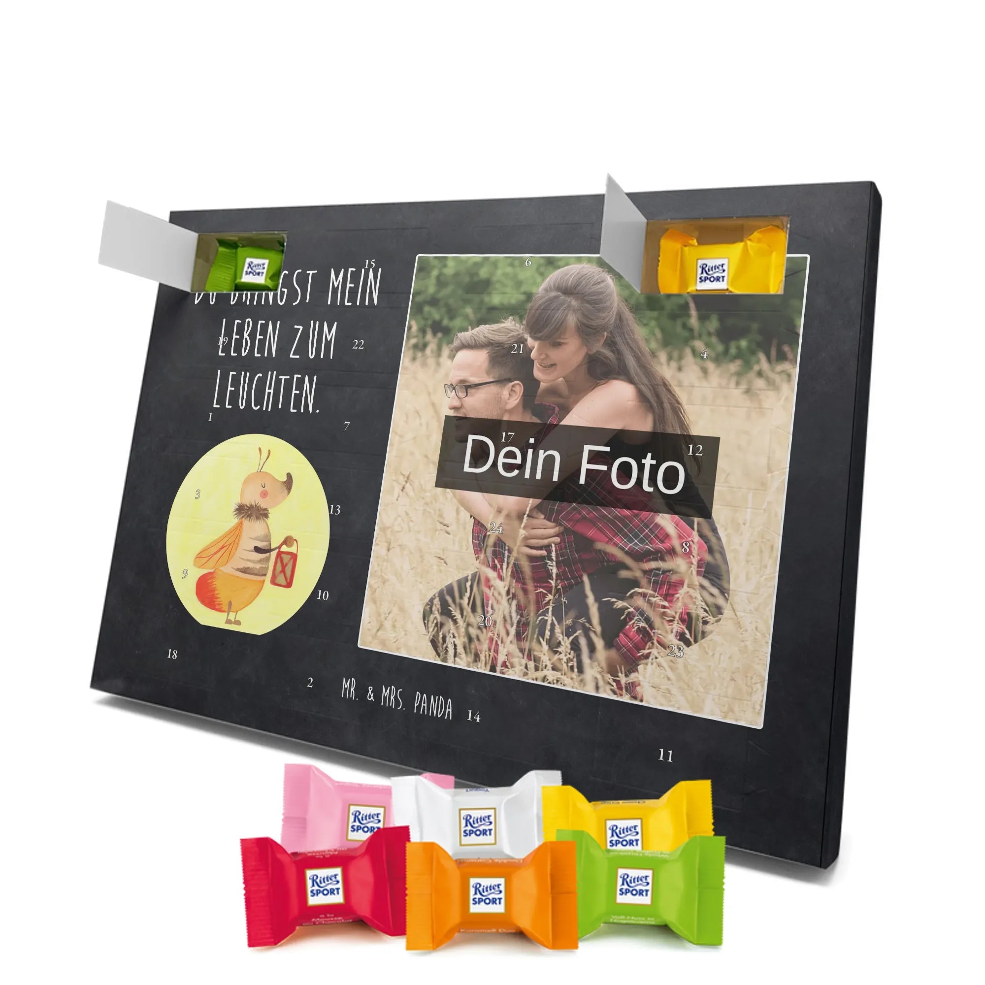 Schoko Foto Adventskalender personalisiert – ein fröhlicher Hingucker von Mr. & Mrs. Panda, der Adventszeit und Erinnerungen verbindet. Der Kalender ist bedruckt mit zauberhaften Motiven & Sprüchen von Mr. & Mrs. Panda und lässt sich ganz leicht mit einem Foto deiner Wahl personalisieren. Achtung Bildqualität: Für ein scharfes Druckbild solltest du ein Foto in hoher Auflösung verwenden. Kontrolliere den Bildausschnitt, damit wichtige Gesichter oder Details nicht verloren gehen. Verwende nur Fotos, für die du die Rechte besitzt oder die frei nutzbar sind. Bitte beachte: Die Fotos werden weder nachbearbeitet noch zugeschnitten und personalisierte Foto Artikel sind vom Umtausch ausgeschlossen. Die Verarbeitung überzeugt mit seidenmatter Oberflächenveredelung und bedruckten Seitenflächen für ein edles Finish. Maße: 325 mm x 225 mm x 27 mm. Besonderheit: Du kannst den Kalender aufhängen oder aufstellen – ganz flexibel. Gefüllt ist der Kalender mit Ritter Sport Schokowürfeln in leckeren Geschmacksrichtungen wie Mousse au Chocolat, Schoko Crisp, Voll-Nuss in Nougatcreme, Karamell Duo, Joghurt und Erdbeer-Joghurt. Ein liebevolles Geschenk, das jeden Tag im Advent versüßt.