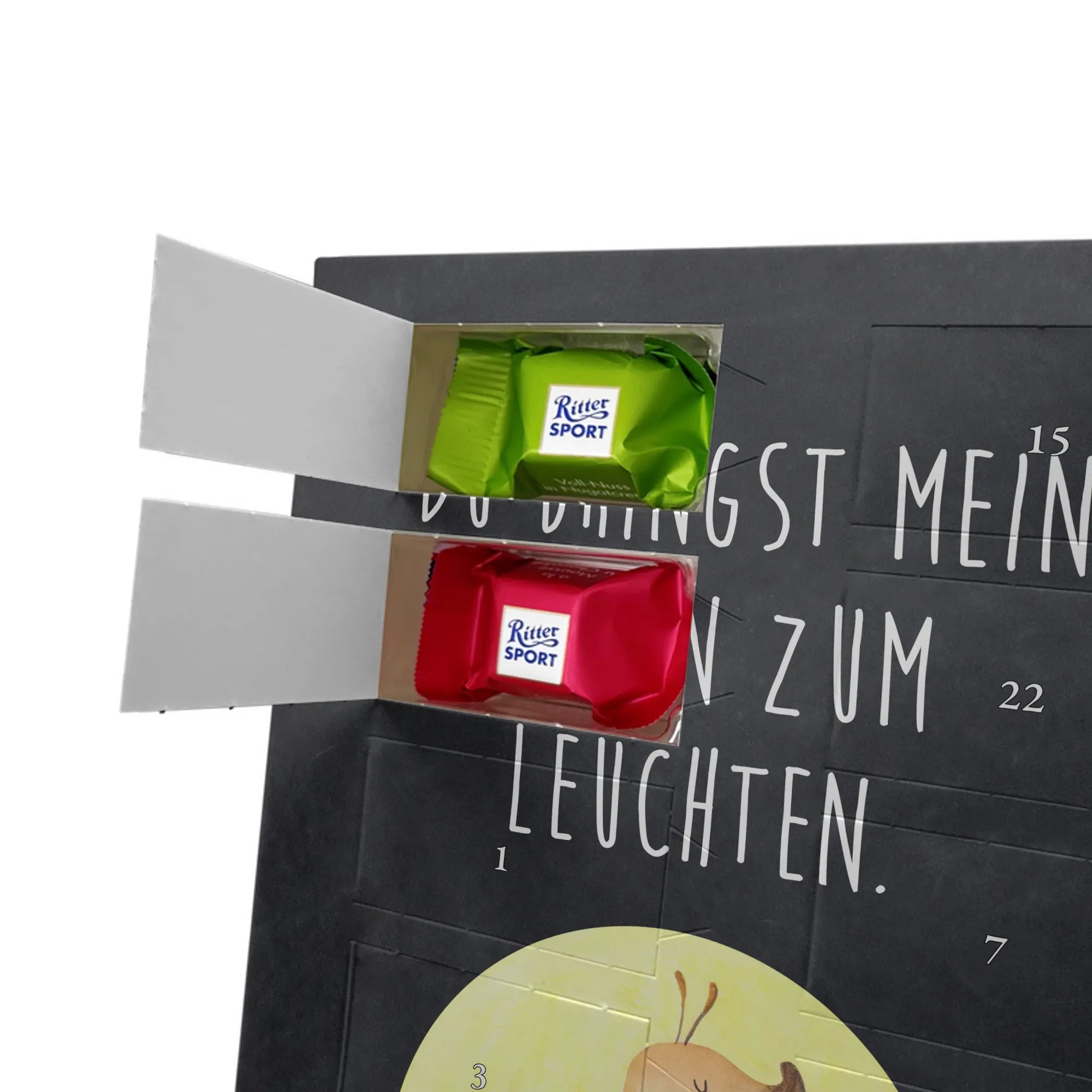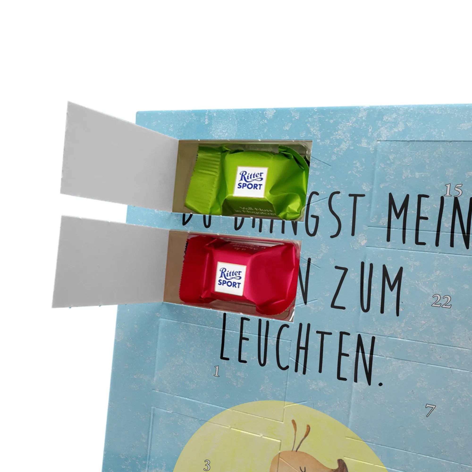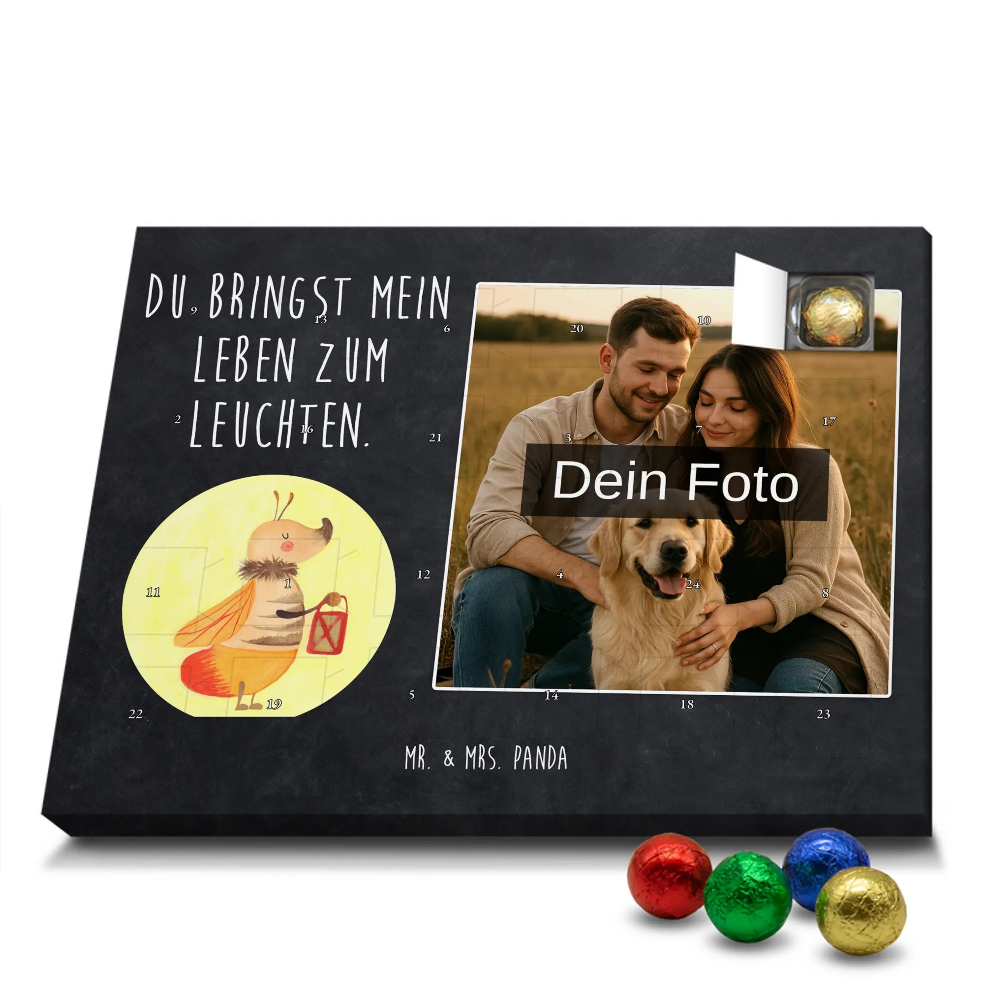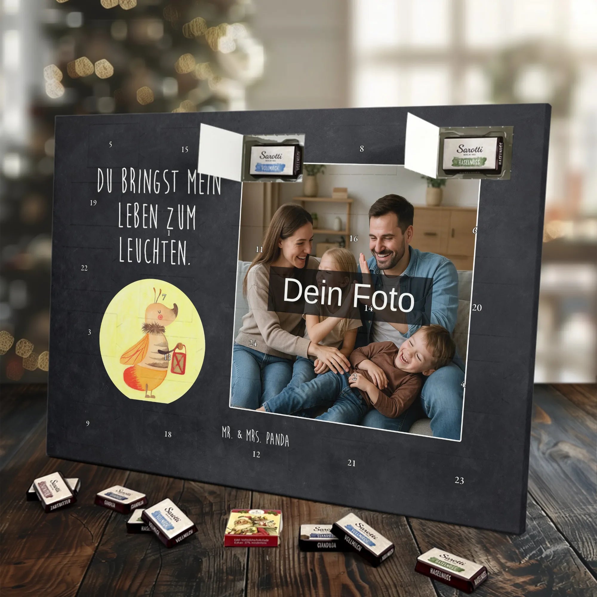 Schoko Foto Adventskalender personalisiert – ein fröhlicher Hingucker von Mr. & Mrs. Panda, der Adventszeit und Erinnerungen verbindet. Der Kalender ist bedruckt mit zauberhaften Motiven & Sprüchen von Mr. & Mrs. Panda und lässt sich ganz leicht mit einem Foto deiner Wahl personalisieren. Achtung Bildqualität: Für ein scharfes Druckbild solltest du ein Foto in hoher Auflösung verwenden. Kontrolliere den Bildausschnitt, damit wichtige Gesichter oder Details nicht verloren gehen. Verwende nur Fotos, für die du die Rechte besitzt oder die frei nutzbar sind. Bitte beachte: Die Fotos werden weder nachbearbeitet noch zugeschnitten und personalisierte Foto Artikel sind vom Umtausch ausgeschlossen. Die Verarbeitung überzeugt mit seidenmatter Oberflächenveredelung und bedruckten Seitenflächen für ein edles Finish. Maße: 325 mm x 225 mm x 27 mm. Besonderheit: Du kannst den Kalender aufhängen oder aufstellen – ganz flexibel. Gefüllt ist der Kalender mit Ritter Sport Schokowürfeln in leckeren Geschmacksrichtungen wie Mousse au Chocolat, Schoko Crisp, Voll-Nuss in Nougatcreme, Karamell Duo, Joghurt und Erdbeer-Joghurt. Ein liebevolles Geschenk, das jeden Tag im Advent versüßt.