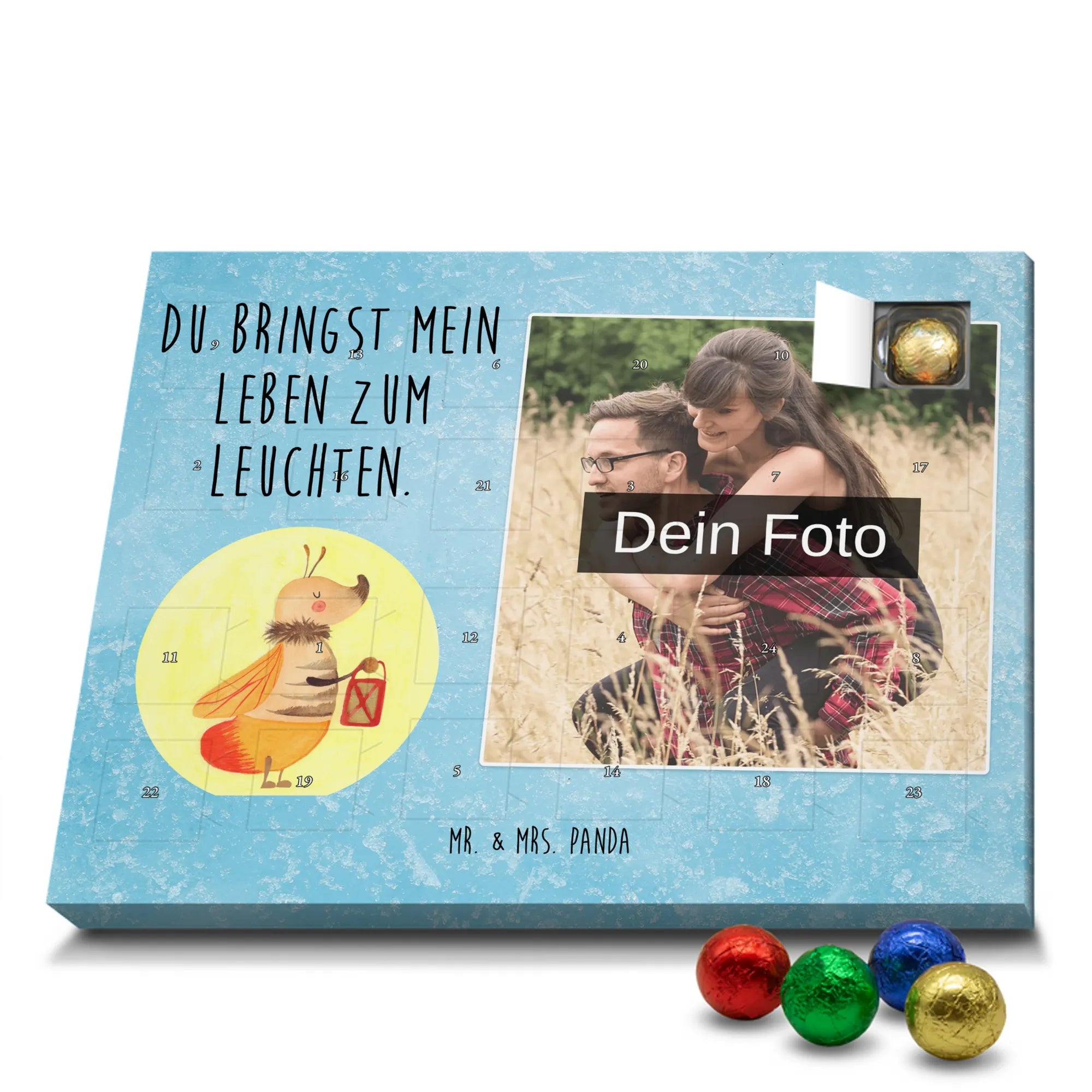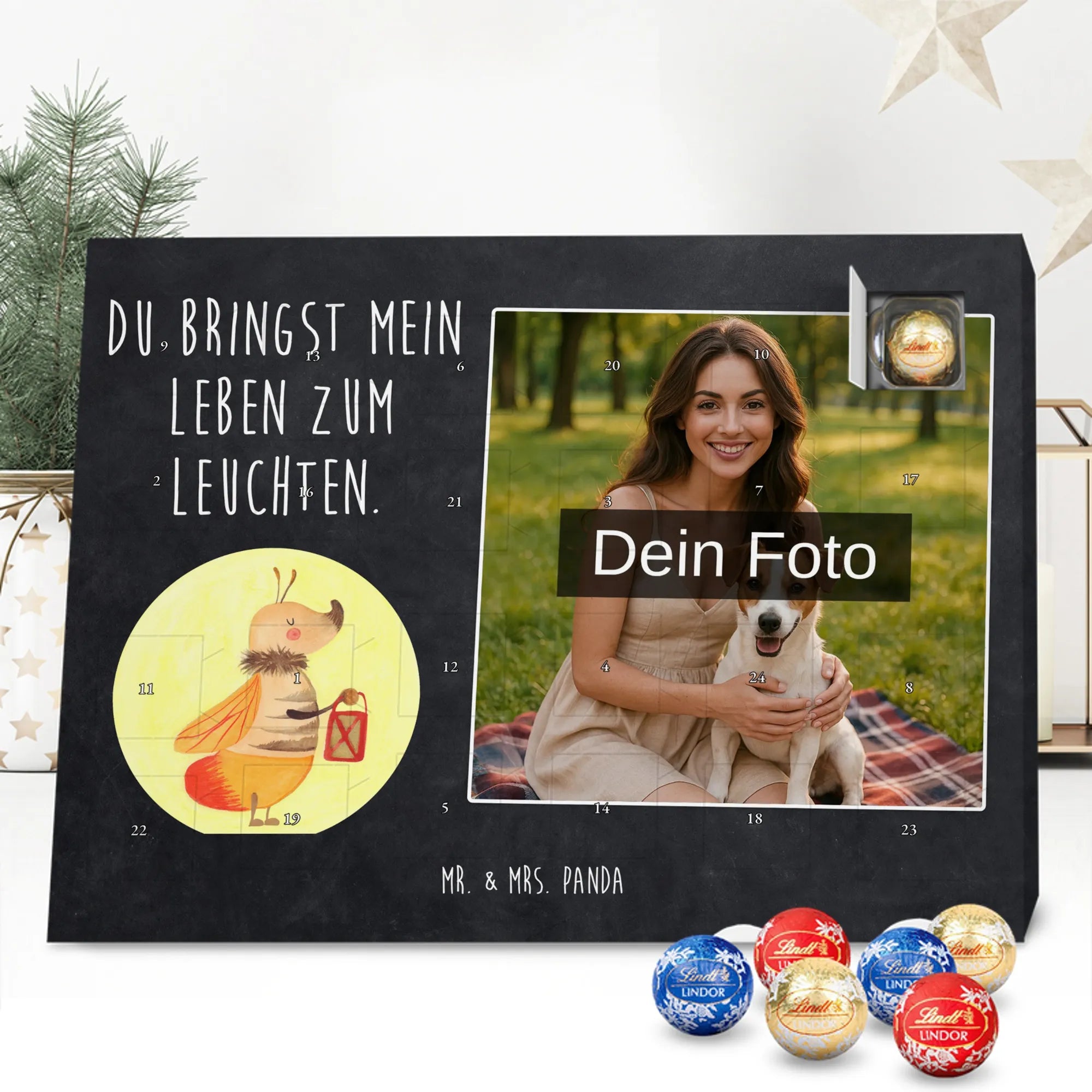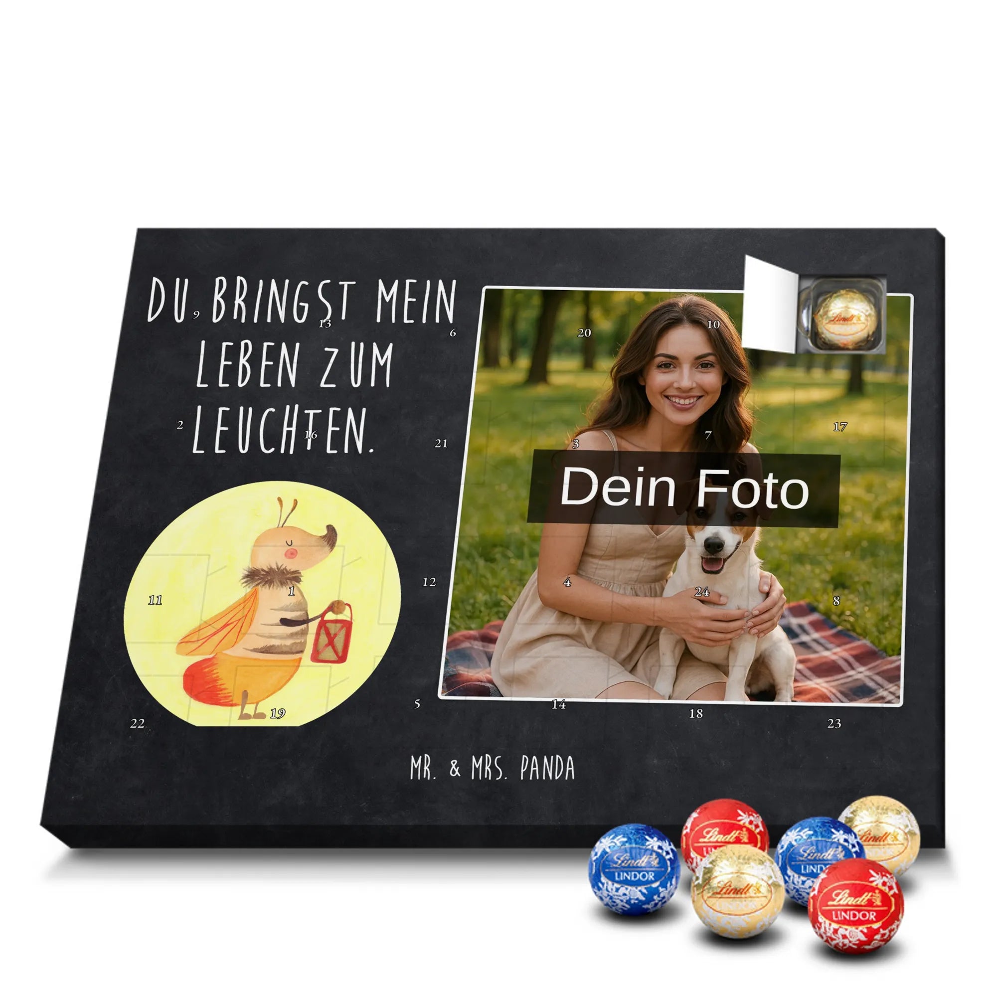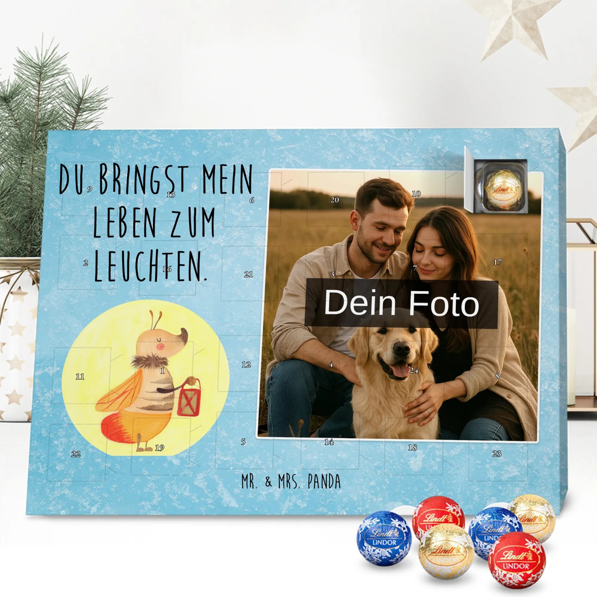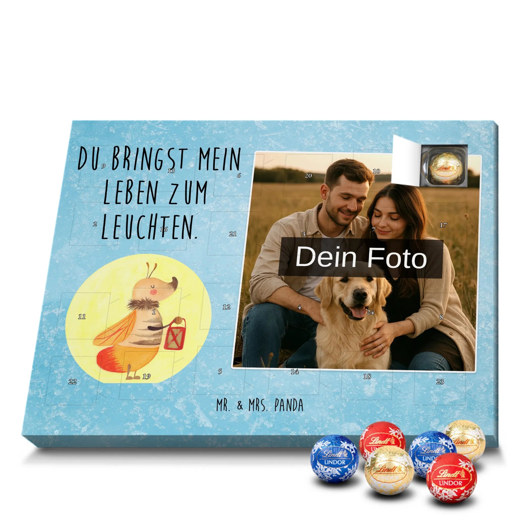 Wunderschöner Personalisierter Schoko Foto Adventskalender von Mr. & Mrs. Panda – perfekt zum Verschenken oder zum Verwöhnen. Dieser Adventskalender verbindet liebevolle Mr. & Mrs. Panda-Motive und Sprüche mit deinem persönlichen Foto auf der Vorderseite. Die hochwertige Verarbeitung mit seidenmatter Oberflächenveredelung sorgt für brillante Farben und eine edle Haptik, die man gerne anfasst. Bedruckte Seitenflächen und die stabile Ausführung machen den Kalender zum echten Hingucker in der Adventszeit. Bitte achte auf eine hohe Auflösung deines Fotos, damit das Druckergebnis klar und scharf wird, und wähle einen passenden Bildausschnitt, damit keine wichtigen Details abgeschnitten werden. Lade nur Bilder hoch, bei denen du die Rechte besitzt oder die Erlaubnis hast, besonders bei Fotos mit Personen. Wichtig: Die Fotos werden weder aufbereitet noch zugeschnitten – eine Rücknahme bei personalisierten Foto-Artikeln ist ausgeschlossen. Der Kalender kann aufgehängt oder aufgestellt werden, so wie es dir gefällt. Maße: 233 mm x 178 mm x 24 mm. Gefüllt mit Lindt Lindor Markenschokolade: 24 einzeln verpackte Markenschokoladen Kugeln in drei Sorten (Vollmilch, Feinherb, Weiße Schokolade). Zutatenhinweis: Kann Haselnüsse und Mandeln enthalten. Ein liebevoller, personalisierter Adventsmoment von Mr. & Mrs. Panda.