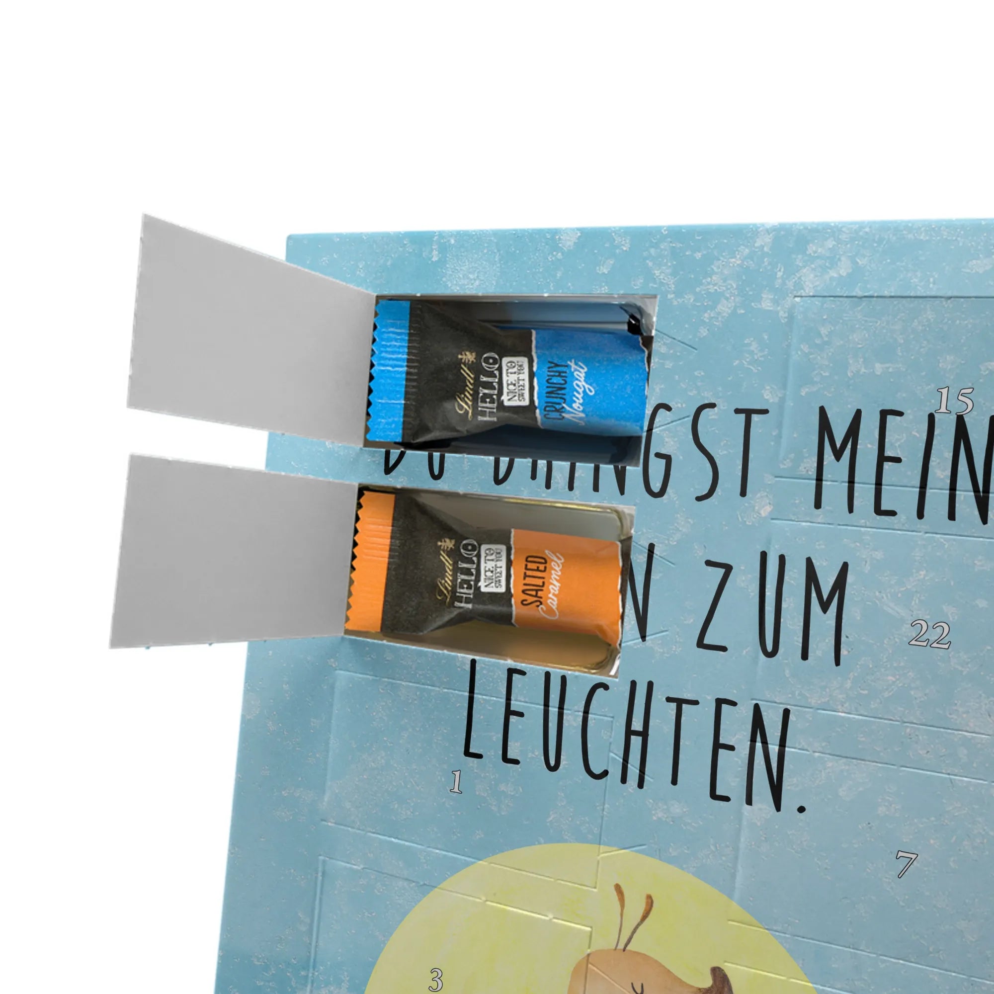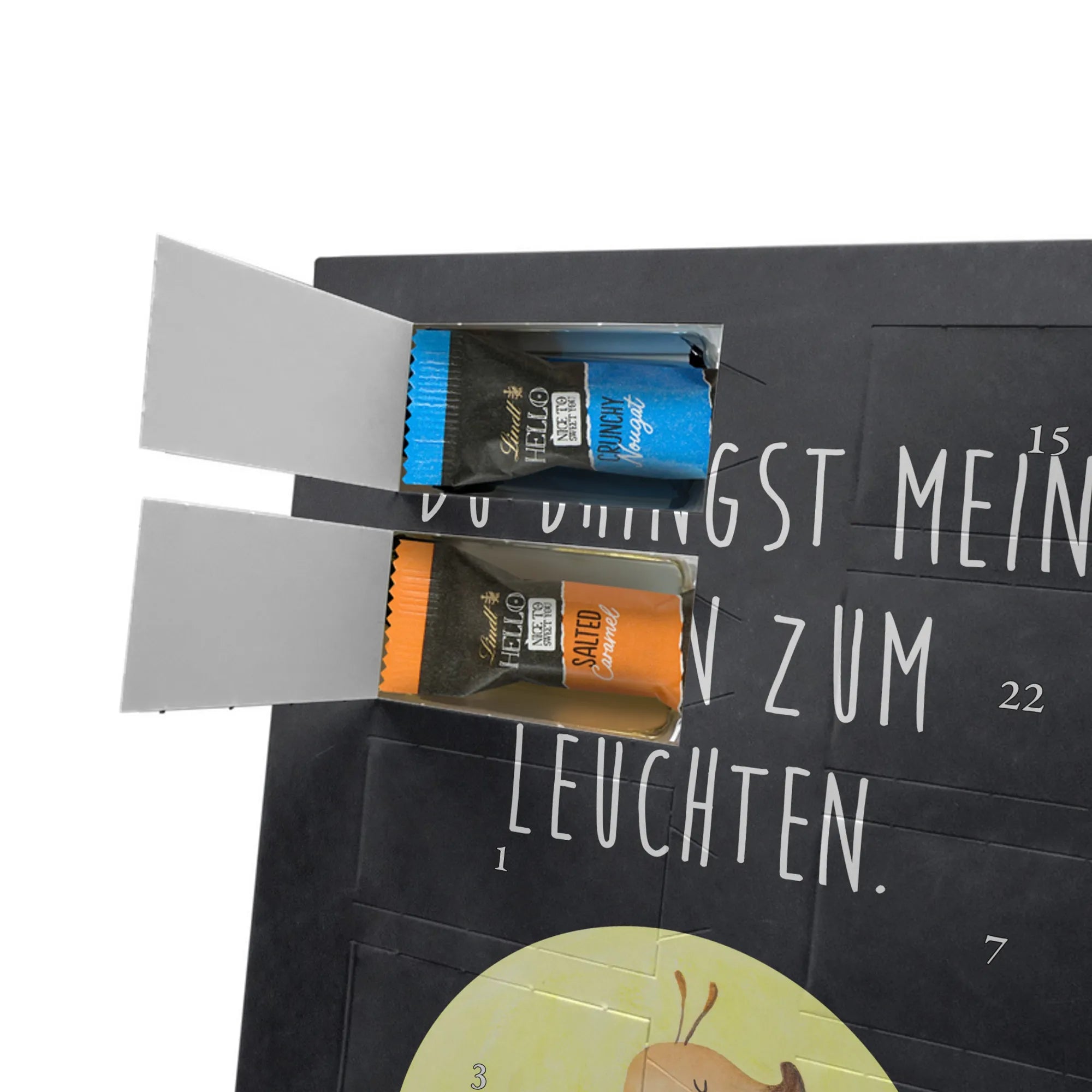 Entdecke unseren personalisierten Schoko-Foto-Adventskalender von Mr. & Mrs. Panda – ein liebevoll gestalteter Adventsbegleiter, der dich jeden Tag im Dezember mit süßen Überraschungen verwöhnt. Der Kalender ist mit charmanten Motiven und kurzen Sprüchen bedruckt und lässt sich mit deinem Lieblingsfoto personalisieren. Achte auf eine gute Bildqualität und den richtigen Bildausschnitt, damit dein Foto sauber gedruckt wird. Bitte nur Fotos hochladen, bei denen du die Rechte besitzt. Die hochwertige, seidenmatte Oberfläche und die bedruckten Seitenflächen verleihen dem Kalender einen besonderen Look. Maße: 325 mm x 225 mm x 27 mm. Innen findest du 24 einzeln verpackte Schokoladen Mini Sticks in vier köstlichen Sorten: Karamell-Schokoladenkuchen, Kekse, Knuspriger Nougat und Erdbeer-Cheesecake. Gefüllt mit Lindt Hello Schokolade. Wichtige Hinweise: Allergene wie Milcheiweiß, Milchzucker, Soja, Weizen und Haselnüsse sind enthalten. Kann Spuren von Mandeln und anderen Schalenfrüchten enthalten. Der Kalender kann aufgehängt oder aufgestellt werden. Hinweis: Fotos werden nicht nachbearbeitet oder zugeschnitten – Rücknahme ausgeschlossen. Verschenke Vorfreude mit deinem individuellen Foto-Adventskalender!