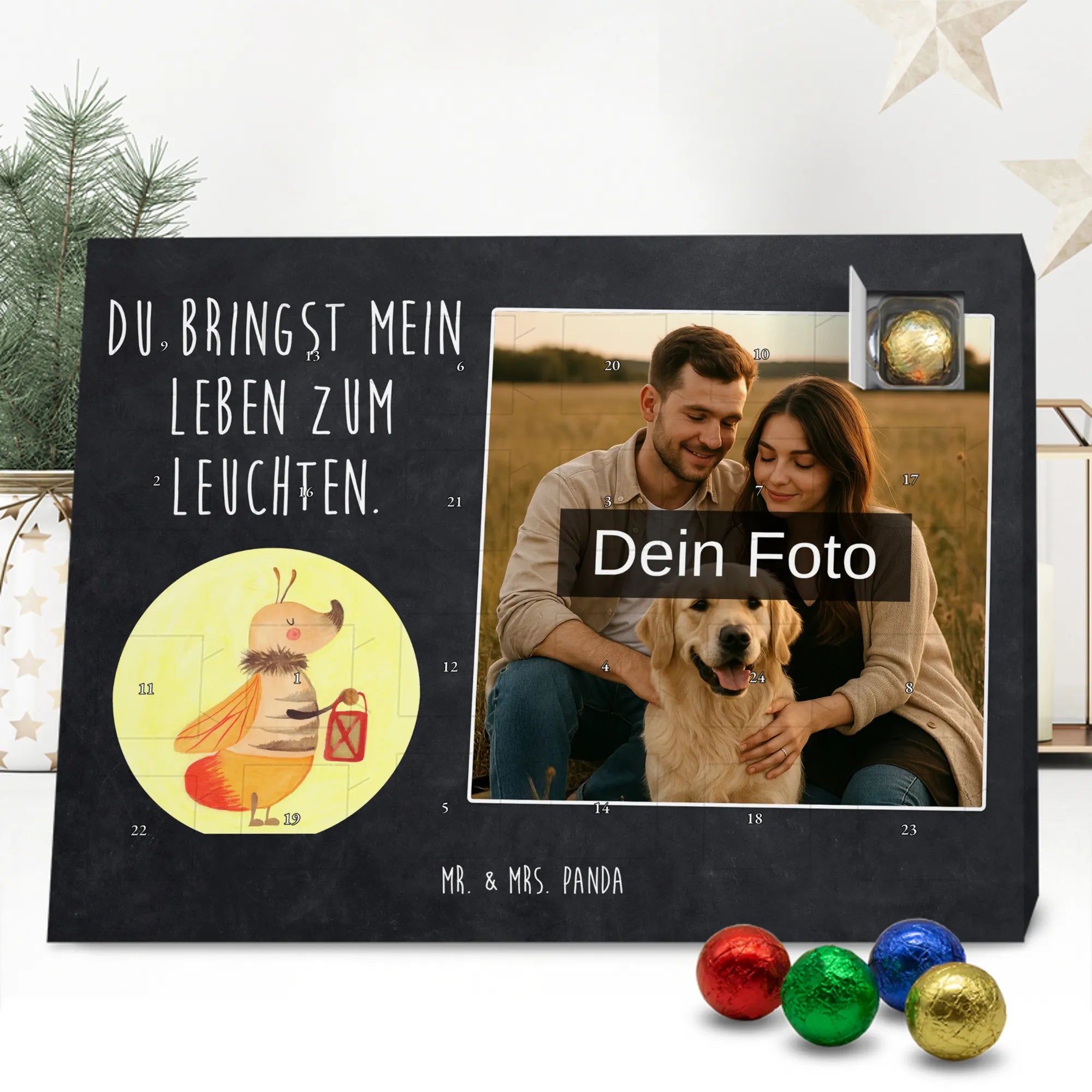 Zauberhafter Personalisierter Schoko-Foto-Adventskalender von Mr. & Mrs. Panda – ein kleines Stück Weihnachten zum Aufhängen oder Aufstellen. Der Kalender ist mit wunderschönen Motiven & Sprüchen bedruckt und du kannst ihn ganz einfach mit einem Foto personalisieren. Bitte achte auf hohe Auflösung: Lade ein Foto in guter Qualität und ausreichender Auflösung hoch, damit das Druckergebnis schön klar wird. Prüfe den Bildausschnitt, damit nichts Wichtiges abgeschnitten wird. Achte außerdem auf Bildrechte: Verwende nur Fotos, bei denen du die Rechte besitzt. Unsere Drucke glänzen durch brillante Qualität mit seidenmatter Oberflächenveredelung und bedruckten Seitenflächen. Maße: 233 mm x 178 mm x 24 mm. Besonderheit: Fotos werden weder aufbereitet noch zugeschnitten – daher ist eine Rücknahme bei personalisierten Foto-Artikeln ausgeschlossen. Gefüllt mit MARKENNAMEN Schokolade und leckeren Schokoladenkugeln, kann der Kalender Spuren von Haselnüssen, Mandeln, Gluten und Soja enthalten. Kühl und trocken lagern! Verschenke Erinnerungen in Schokoladeform – perfekt für Freunde, Familie oder als liebevolle Überraschung für dich selbst.