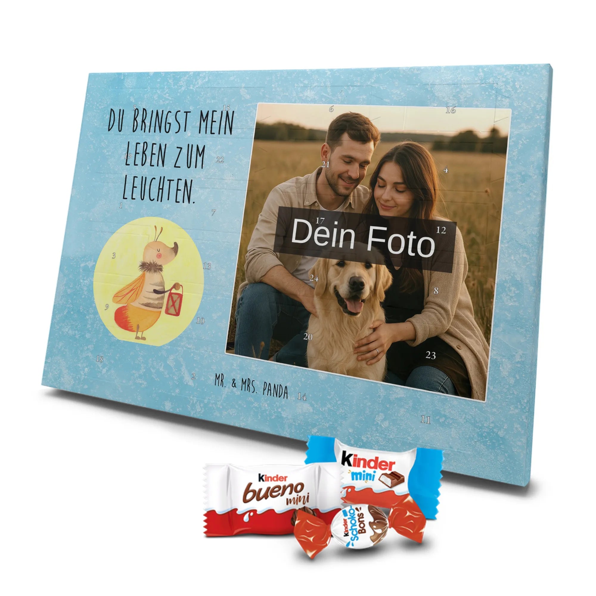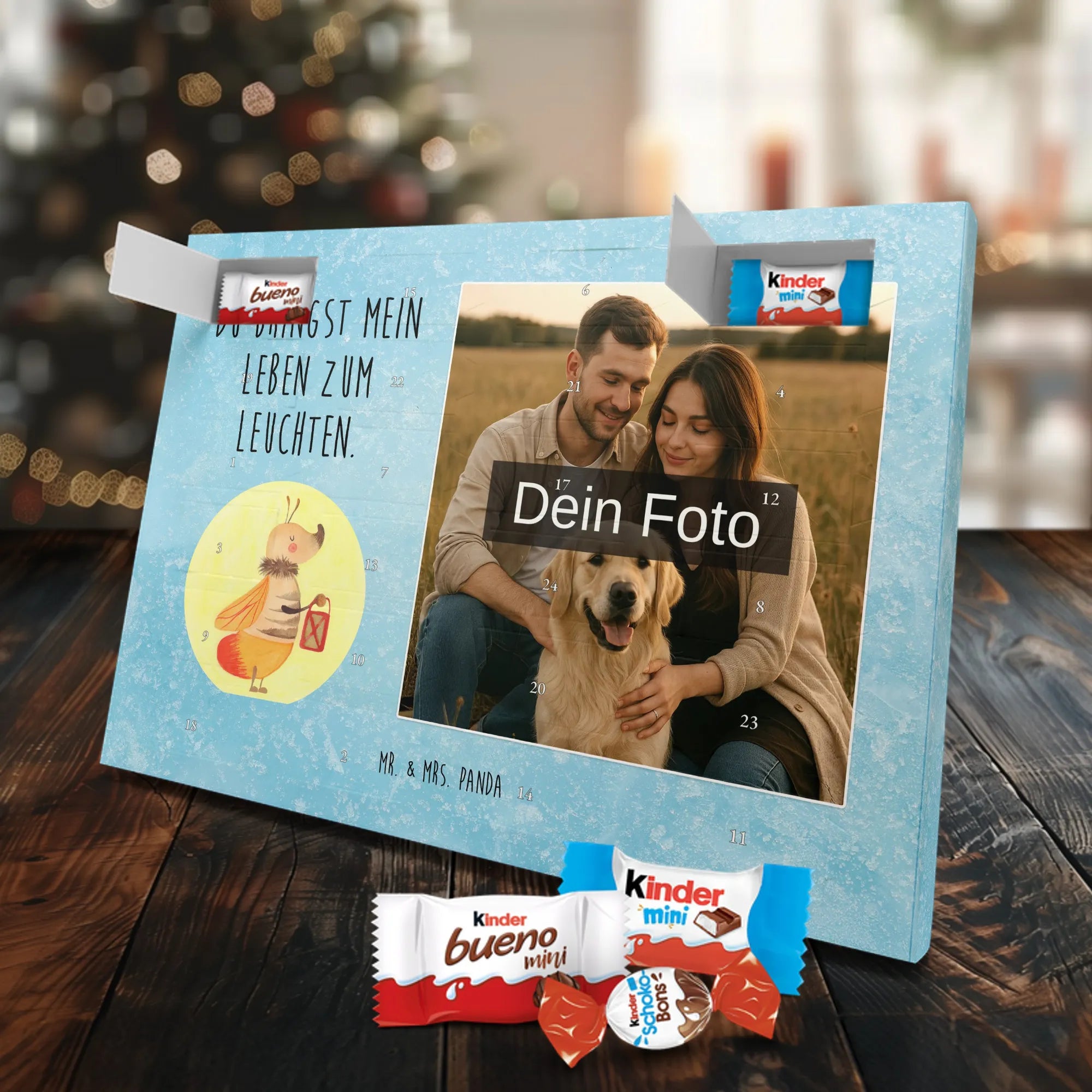 🐼 Personalisierter Schoko-Foto-Adventskalender mit deinem Bild, Mr. & Mrs. Panda Motiven und gefüllt mit kinder® Schokolade.