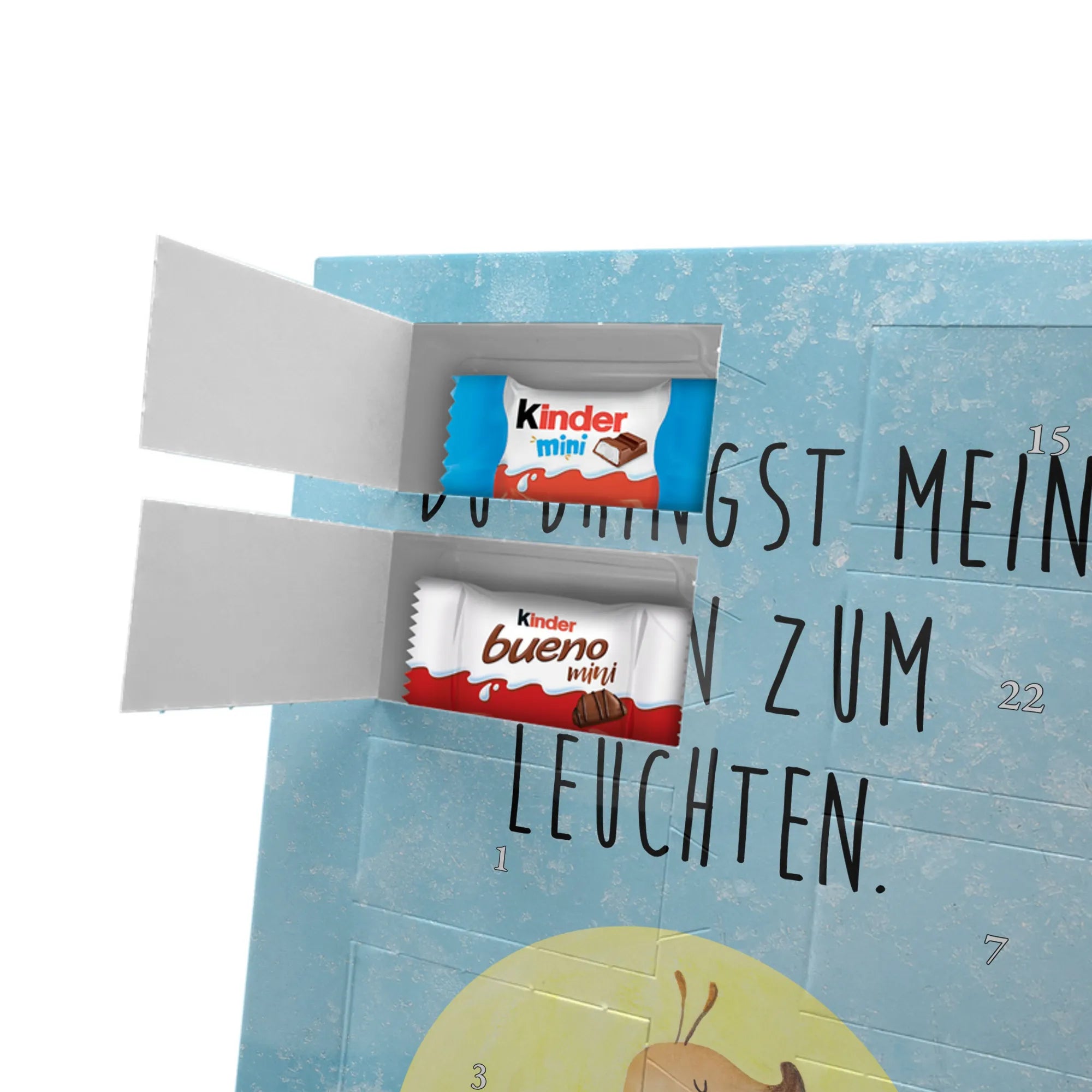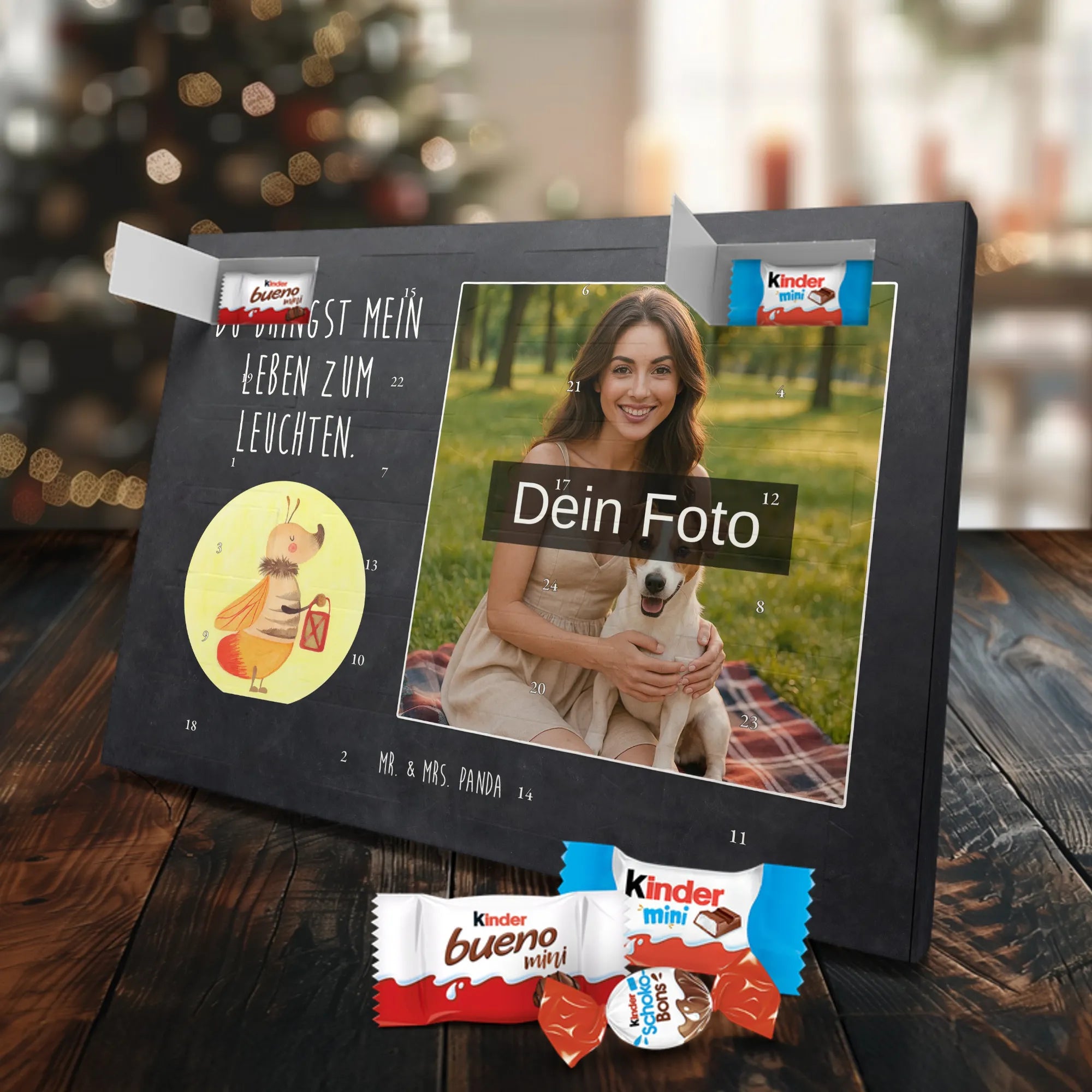 Personalisierter Schoko Foto Adventskalender von Mr. & Mrs. Panda – ein liebevoll gestaltetes Geschenk, das Vorfreude und Genuss vereint. In diesem personalisierten Schoko Foto Adventskalender kannst du dein Lieblingsfoto einsetzen und so jeden Tag im Dezember mit einem kleinen Lächeln öffnen. Der Kalender ist bedruckt mit unseren typischen Mr. & Mrs. Panda Motiven und süßen Sprüchen, die perfekt zu deinem Foto passen. Achte bitte bei der Bildauswahl auf hohe Auflösung, damit der Druck klar und brillant wird. Wähle einen passenden Bildausschnitt, damit keine wichtigen Details abgeschnitten werden. Lade nur Bilder hoch, bei denen du die Bildrechte besitzt oder die Zustimmung der abgebildeten Personen vorliegt. Die Fotos werden weder nachbearbeitet noch zugeschnitten; Rücknahme bei personalisierten Foto-Artikeln ist ausgeschlossen. Die Druckqualität ist brillant mit einer seidenmatten Oberflächenveredelung und bedruckten Seitenflächen für ein rundum schönes Erscheinungsbild. Maße: 355 mm x 245 mm x 11 mm. Praktisch: Du kannst den Adventskalender entweder aufstellen oder an die Wand hängen. Gefüllt ist der Kalender mit kinder® Schokolade – genauer: kinder® Schoko-Bons, kinder® Bueno mini und kinder® Schokolade mini. Bitte beachte: Um das beste Druckergebnis zu erzielen, lade ein hochwertiges Foto hoch und kontrolliere vor dem Bestellen den Bildausschnitt. Dieser Adventskalender ist das perfekte, persönliche Geschenk für Familie, Freunde oder für dich selbst – voller Liebe, süßer Überraschungen und dem unverwechselbaren Mr. & Mrs. Panda Charme.