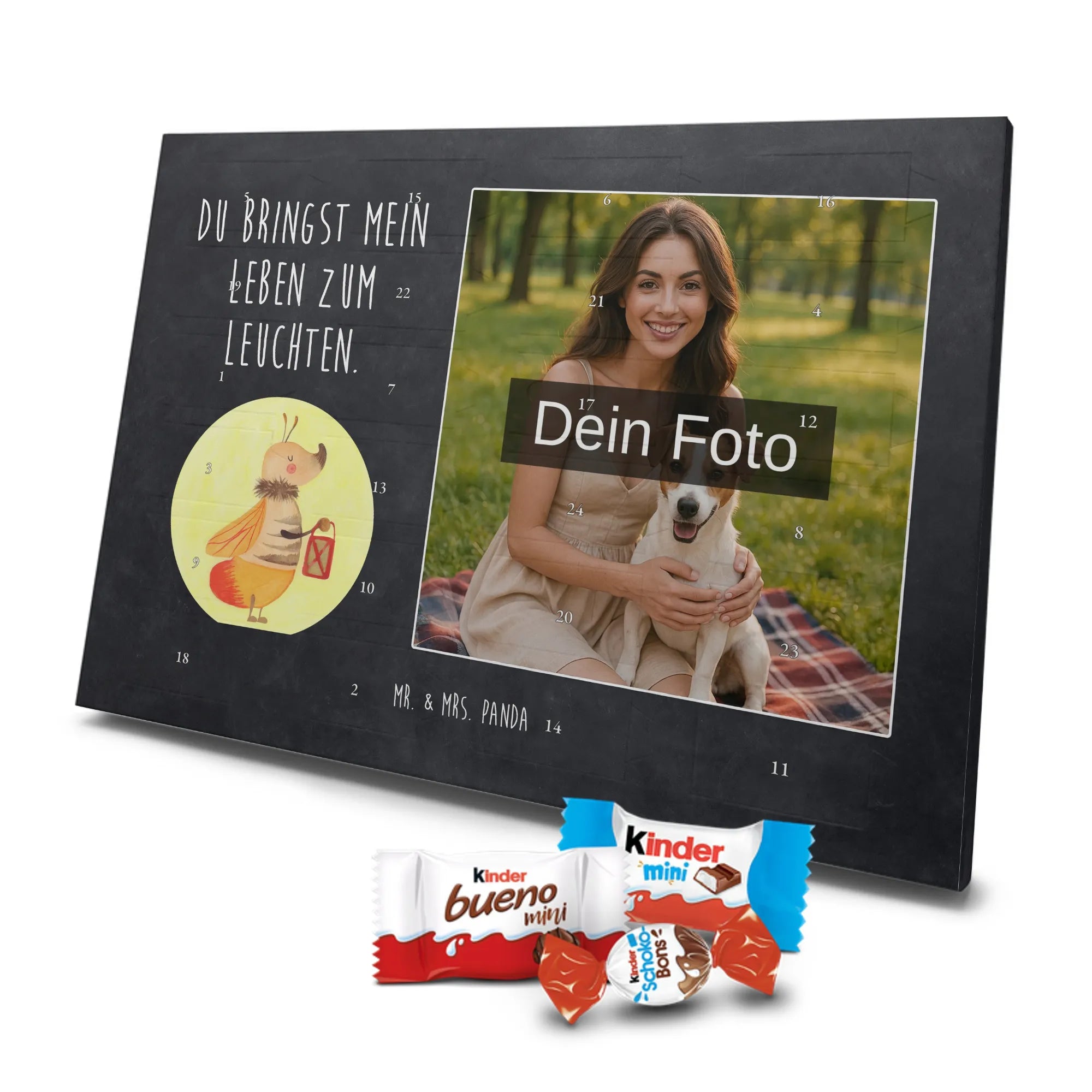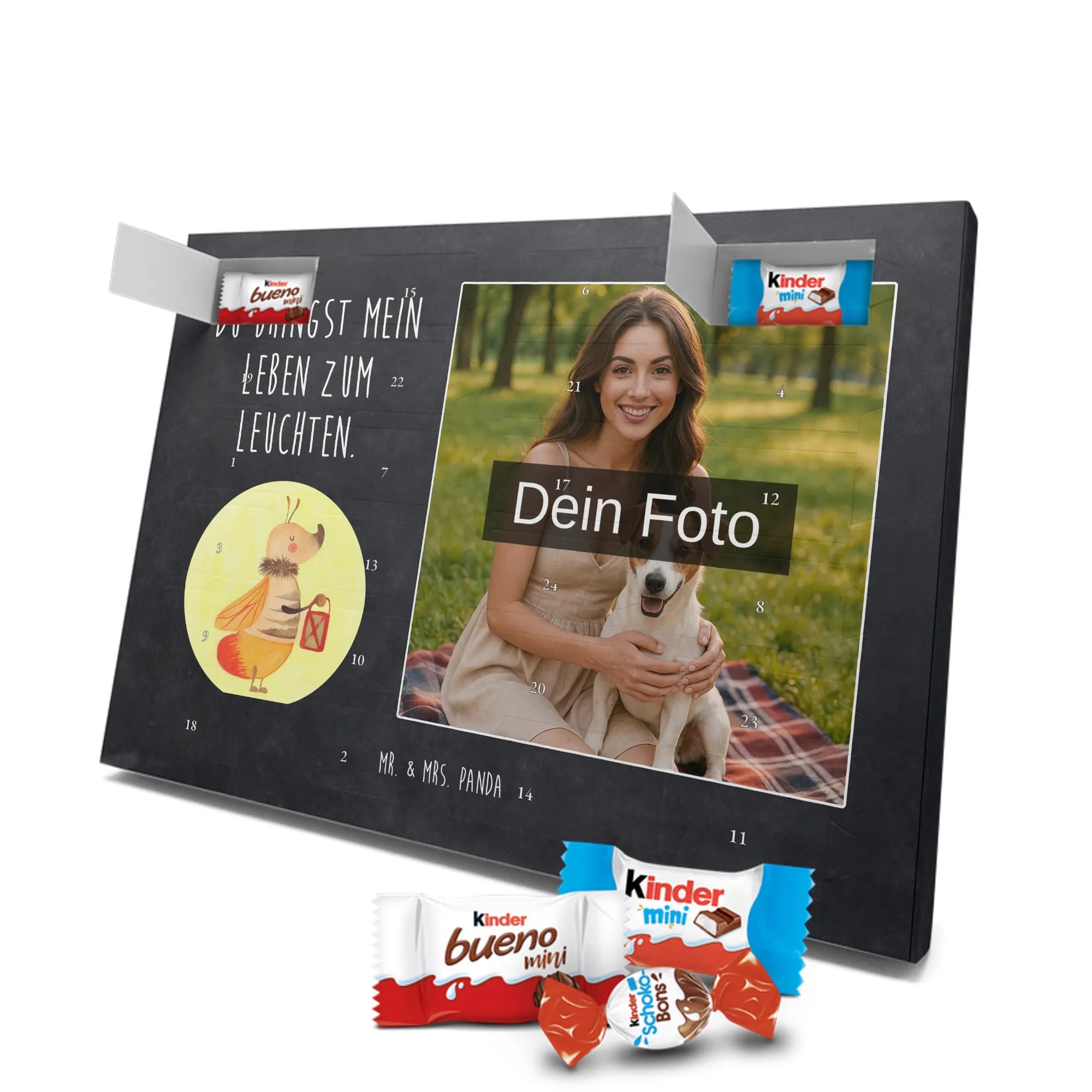 Personalisierter Schoko-Foto-Adventskalender von Mr. & Mrs. Panda – perfekt, wenn du ein einzigartiges, herzhaft-süßes Geschenk suchst. Du lädst ein Foto hoch, das wir auf der Vorderseite platzieren; der Rest des Kalenders ist mit unseren liebevollen Illustrationen und frechen Sprüchen gestaltet. Achte bitte darauf, dass das Bild eine hohe Auflösung hat und der Bildausschnitt passt, damit das Druckbild schön und scharf wird. Lade nur Fotos hoch, an denen du die Rechte besitzt oder für die du die Erlaubnis hast. Wichtig: Wir bearbeiten oder kürzen die Fotos nicht und personalisierte Artikel sind vom Rückgaberecht ausgeschlossen. Die hochwertige, seidenmatte Oberflächenveredelung sorgt für edle Optik, die bedruckten Seitenflächen geben dem Kalender eine liebevolle Note. Maße: 355 mm x 245 mm x 11 mm. Du kannst den Kalender aufstellen oder aufhängen – ganz wie du möchtest. Gefüllt ist er mit kinder® Schokolade: enthalten sind kinder® Schoko-Bons, kinder® Bueno mini und kinder® Schokolade mini. Wir empfehlen, vor dem Hochladen den Bildausschnitt am Bildschirm zu prüfen, damit Gesichter und wichtige Details nicht abgeschnitten werden. Dieser Adventskalender ist ideal für Paare, Familien und als persönliches Mitbringsel – mit ganz viel Mr. & Mrs. Panda Herz.